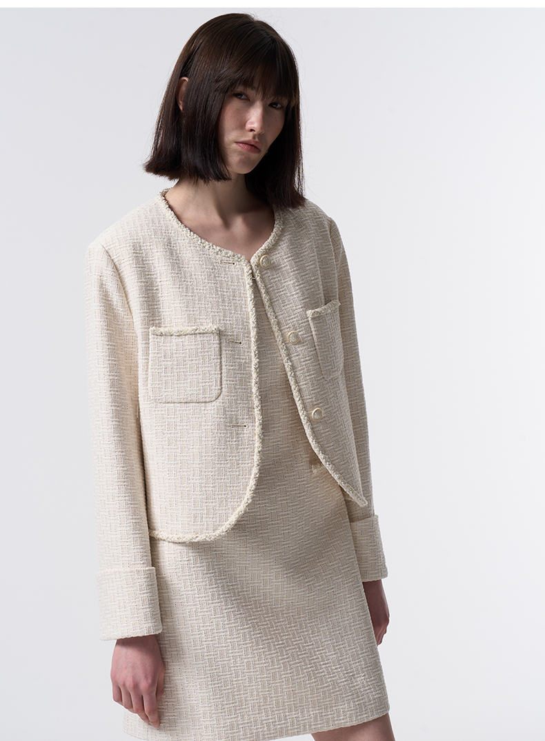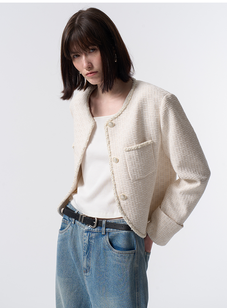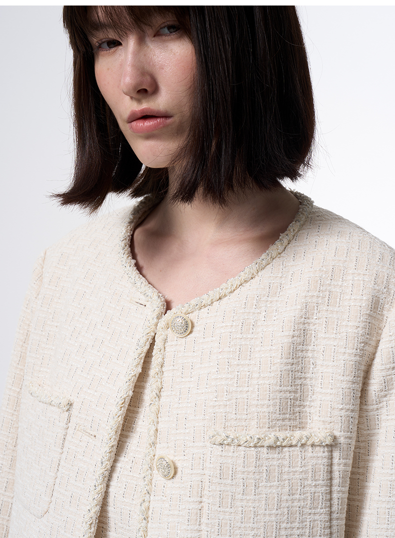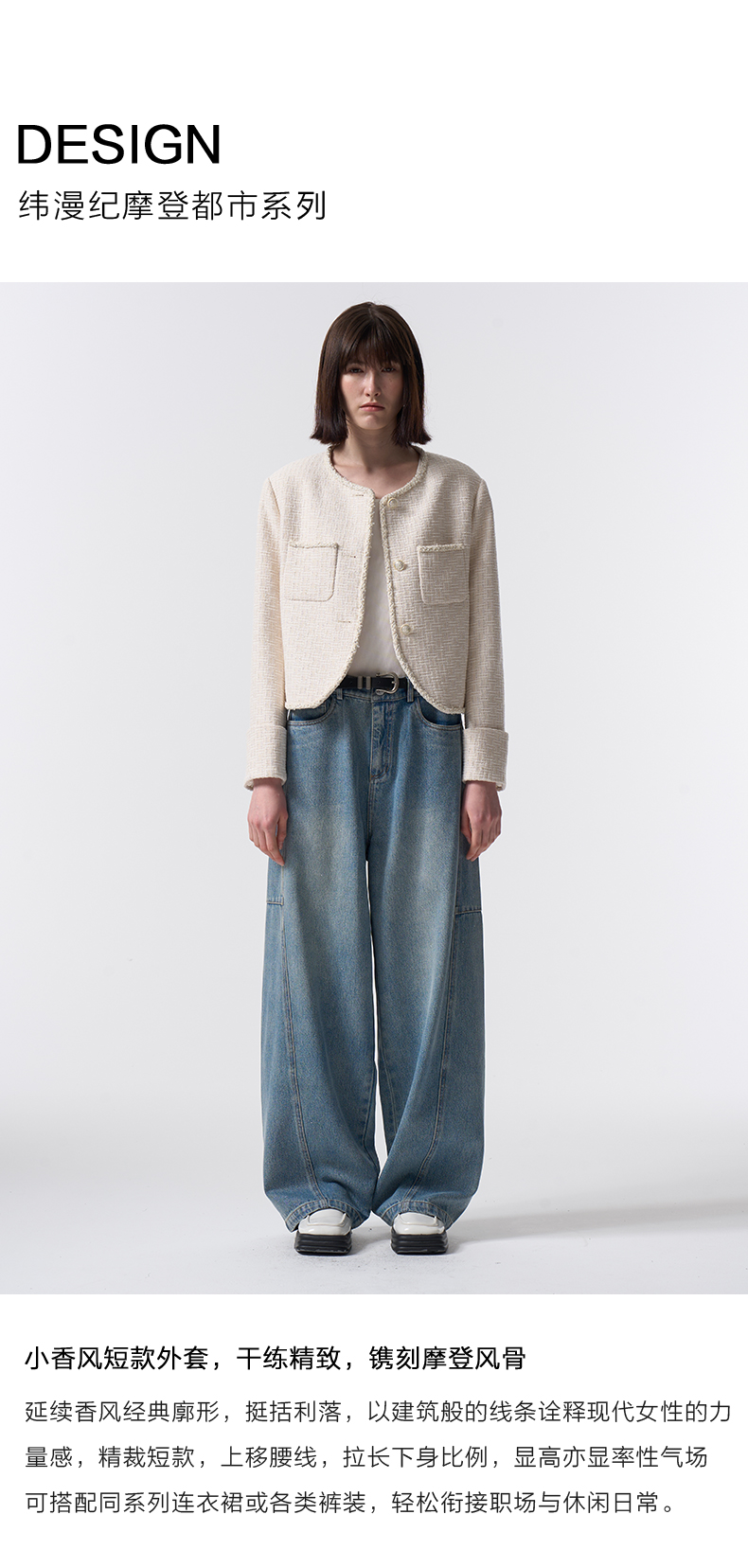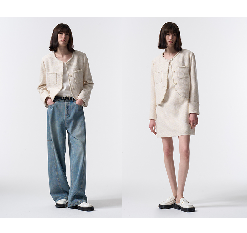 VIMAGE纬漫纪小香风复古香槟白圆领小个子短款外套女2026春季新款V2503206