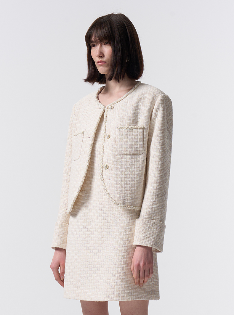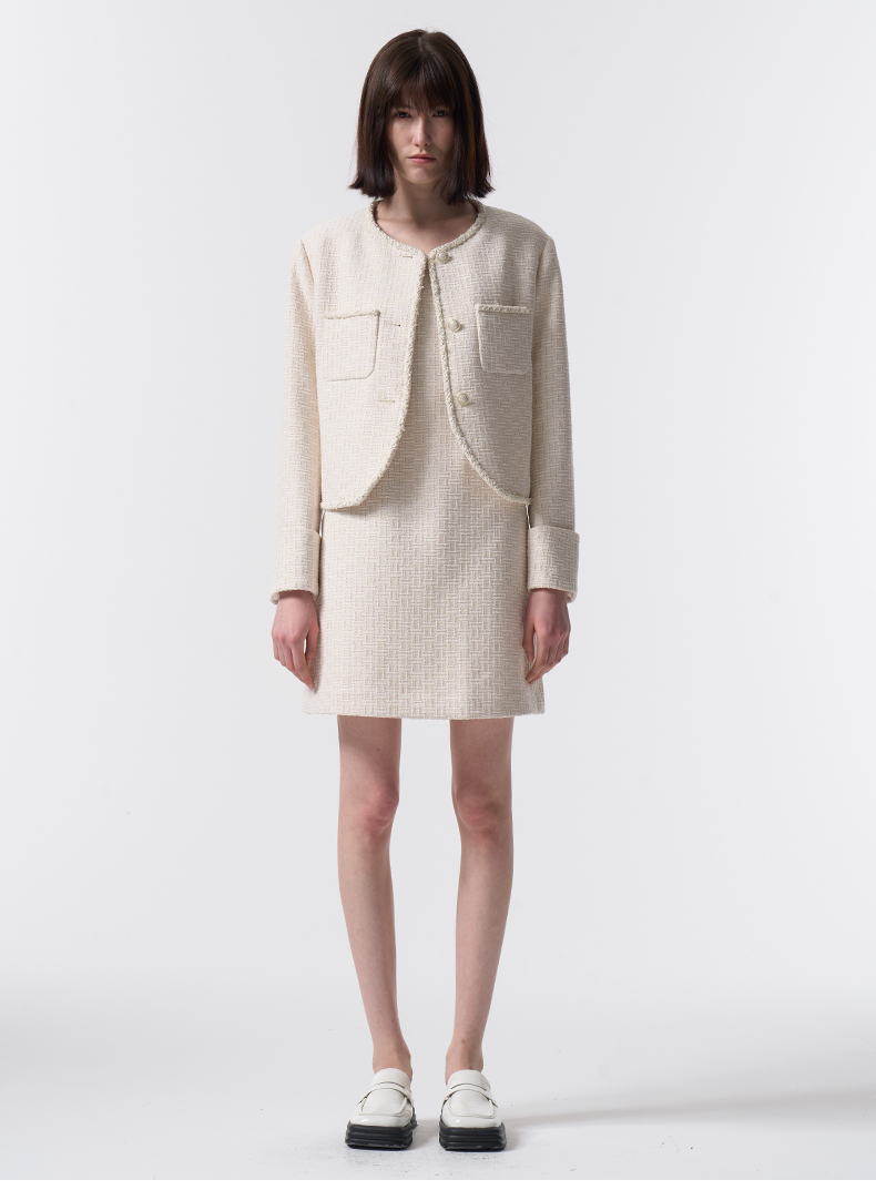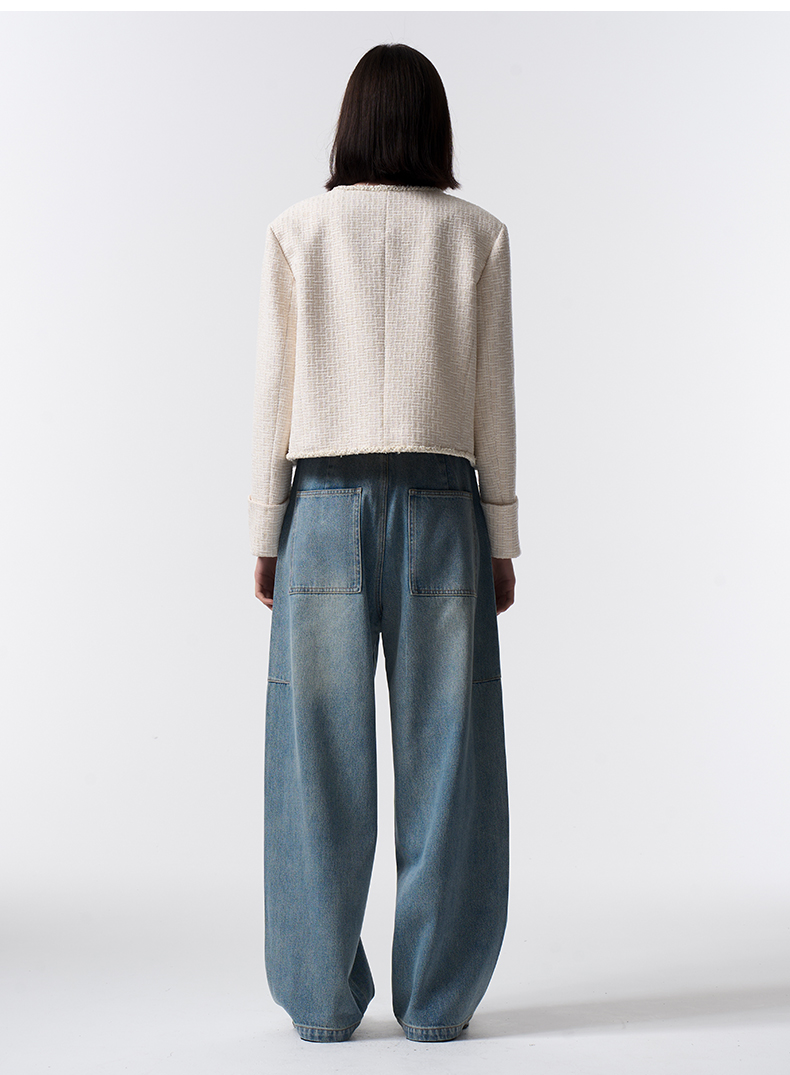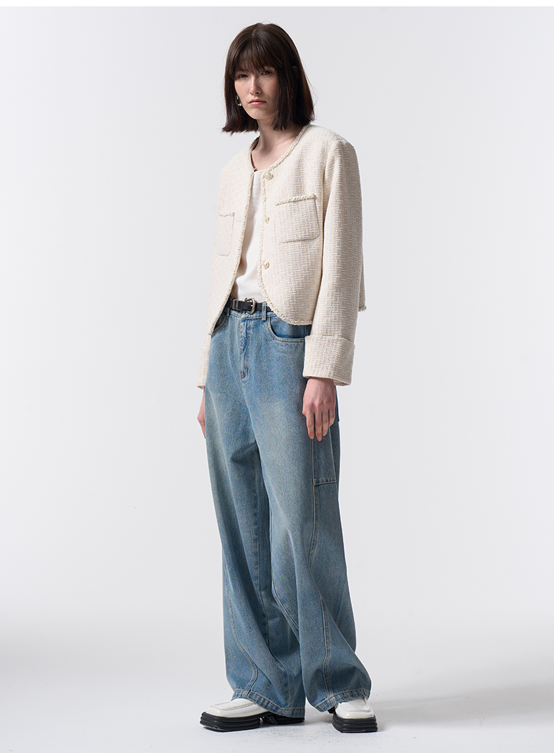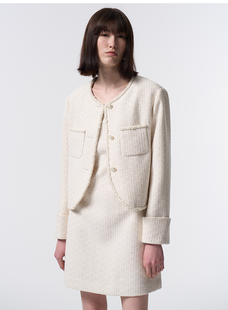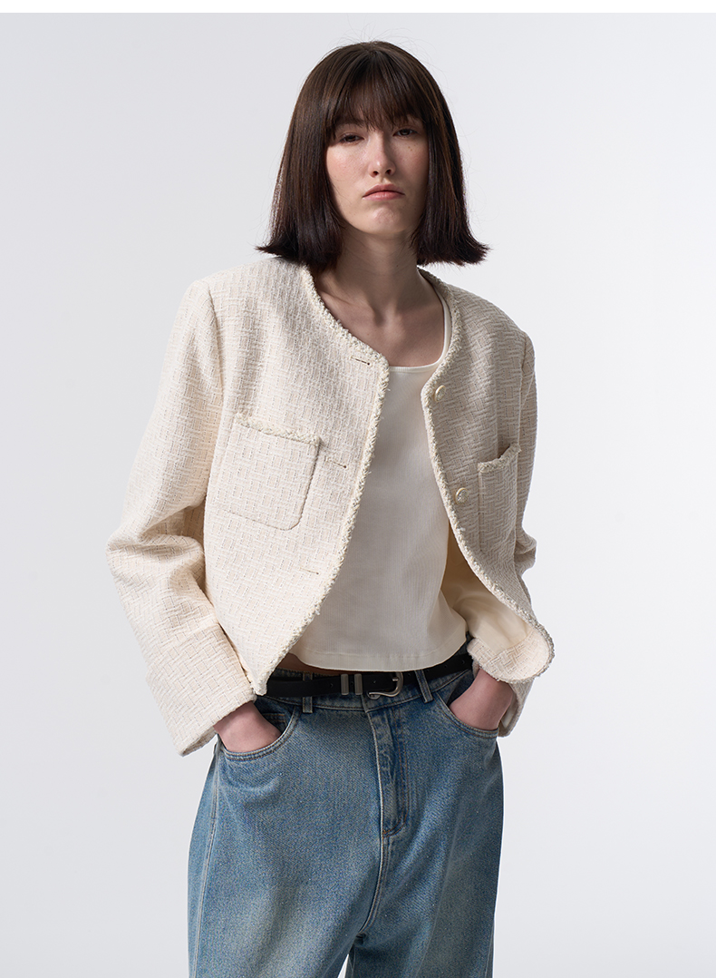 VIMAGE纬漫纪小香风复古香槟白圆领小个子短款外套女2026春季新款V2503206