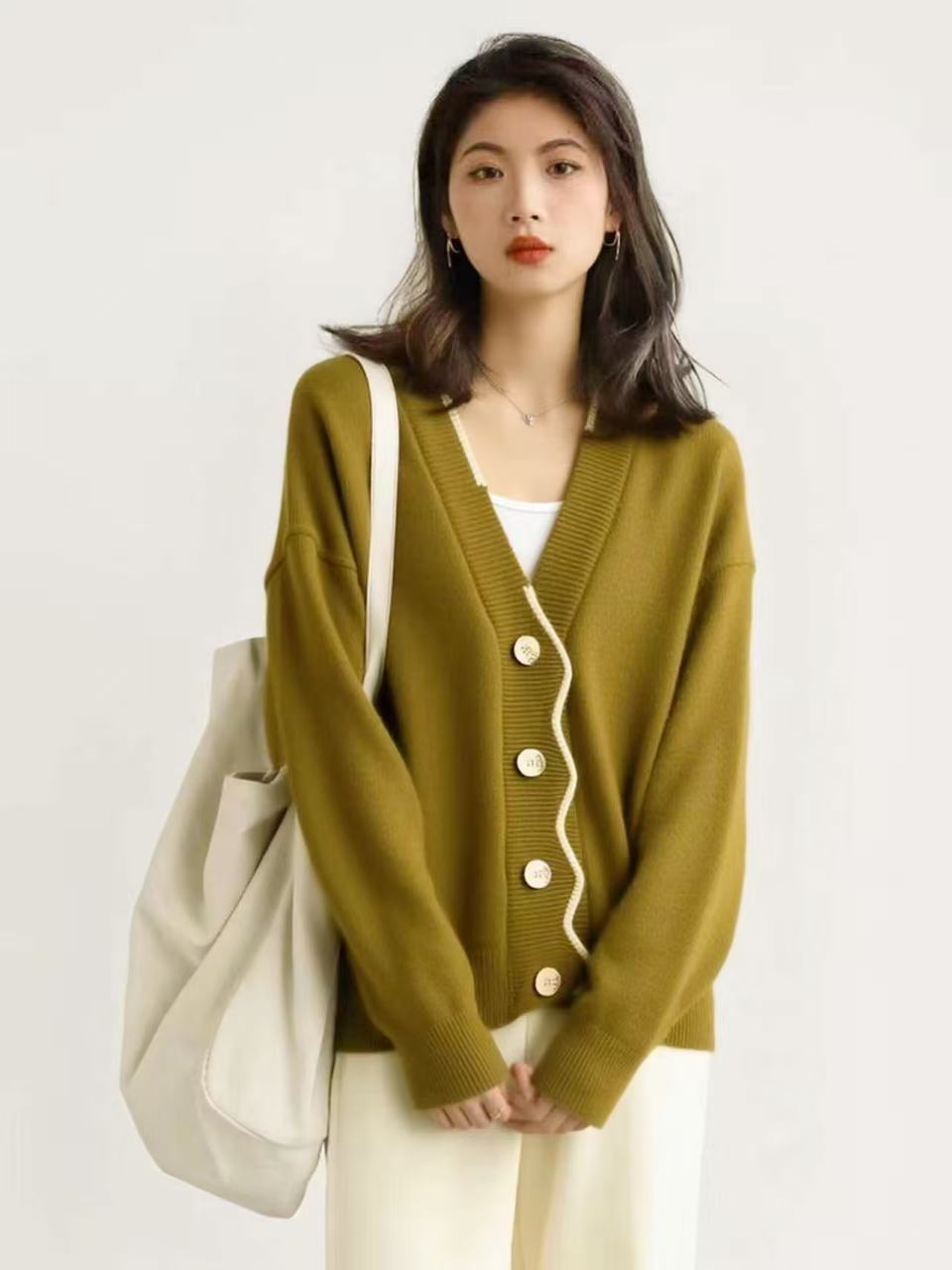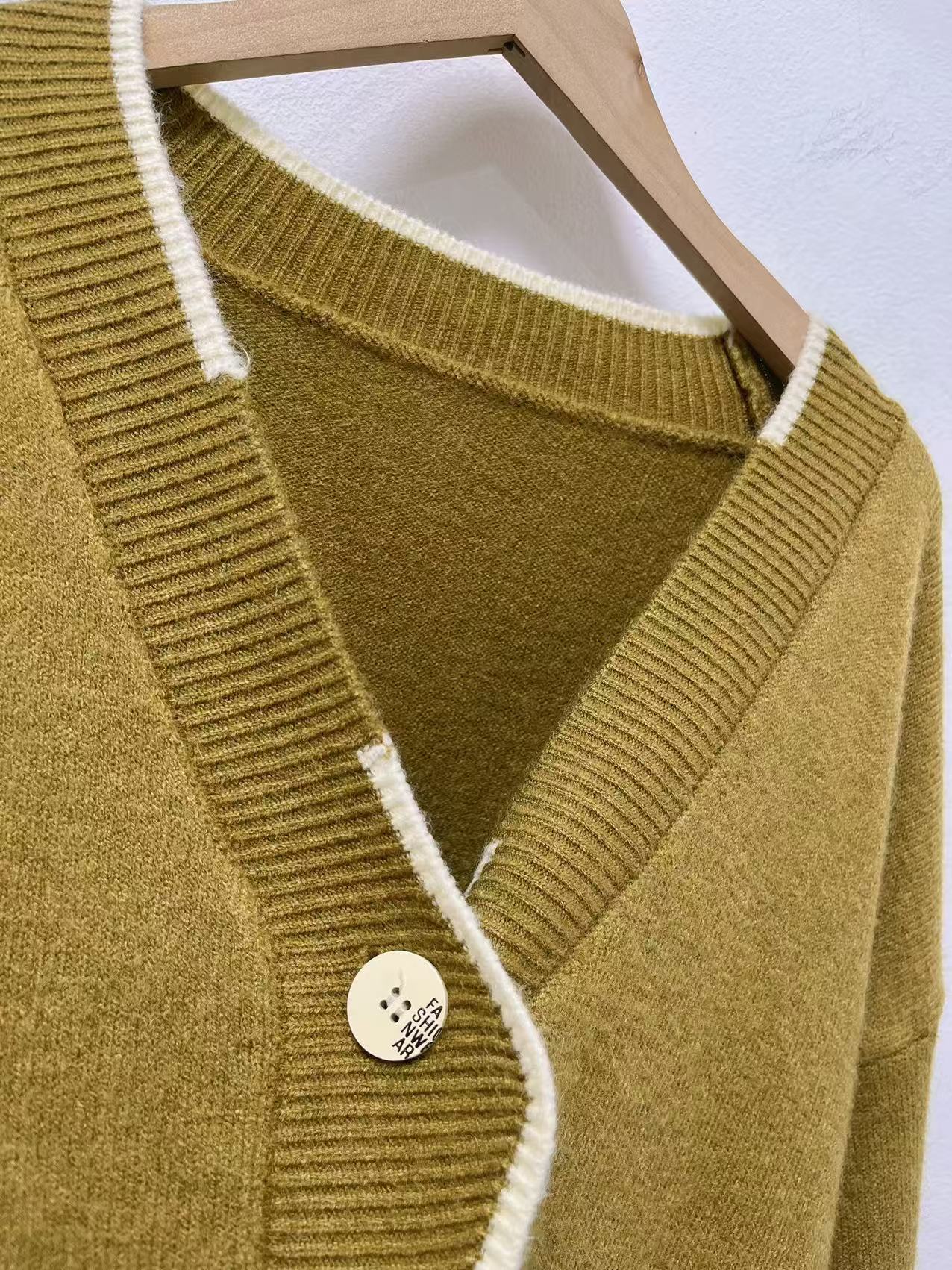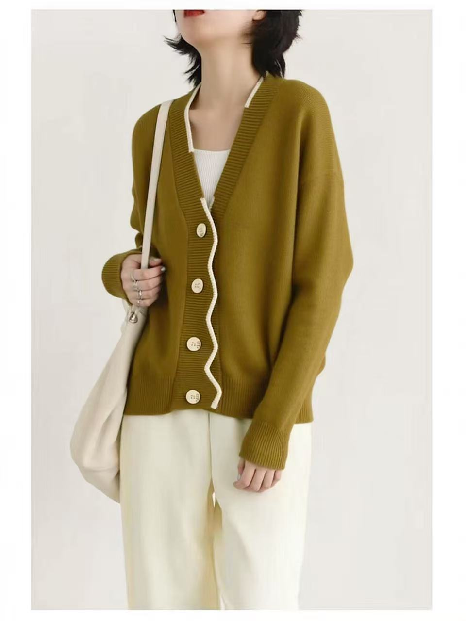 【韩系毛衣】芥末色~四粒扣波浪边拼色开衫毛衣-喜出