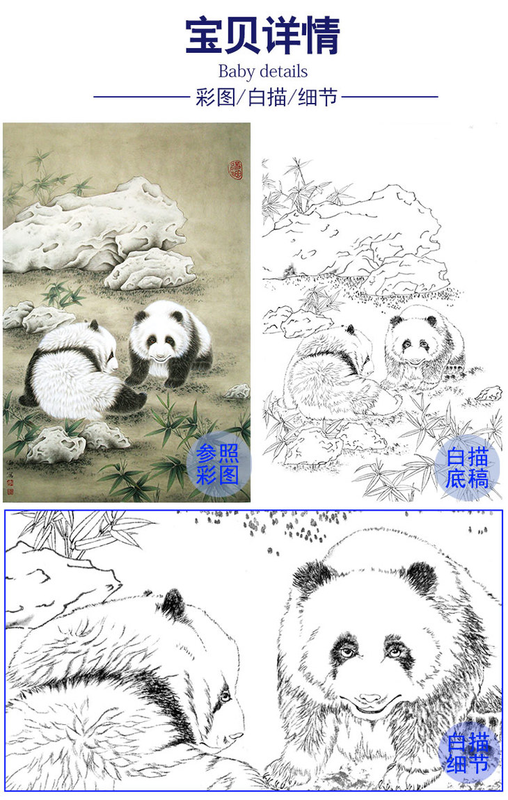 竖幅工笔动物白描底稿-李保山《闲庭小趣》-熊猫-多种白描尺寸可选-EL30