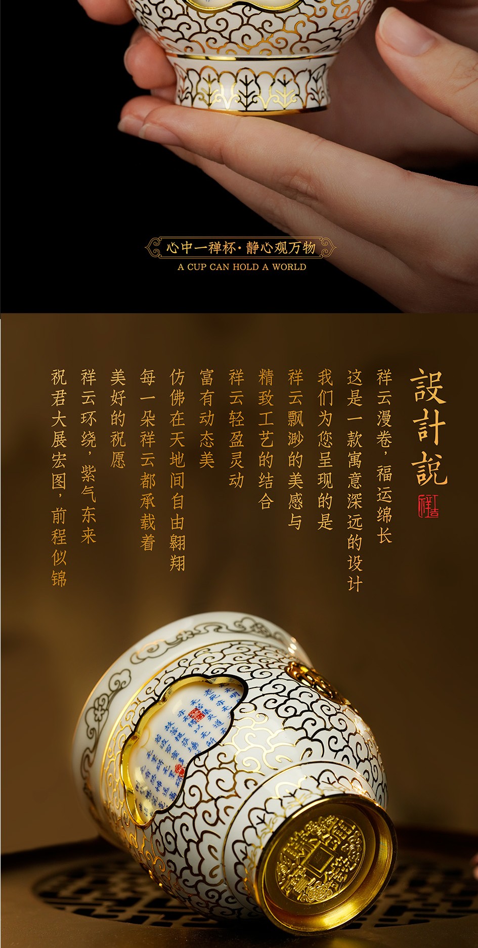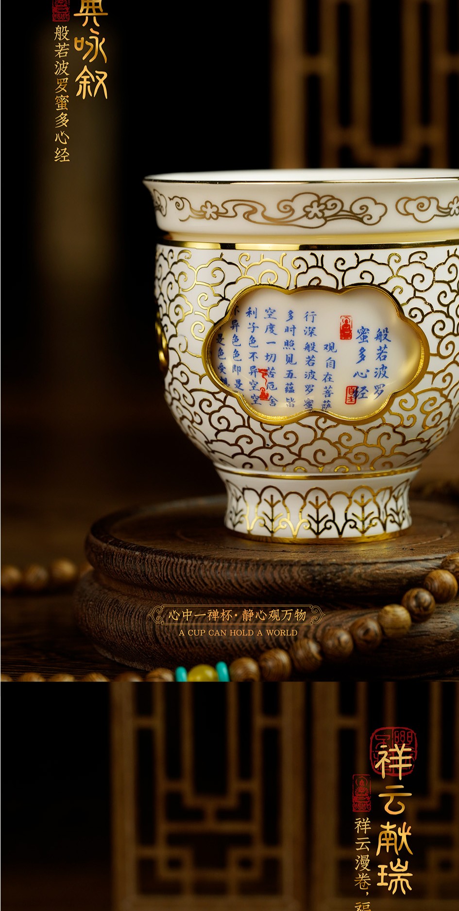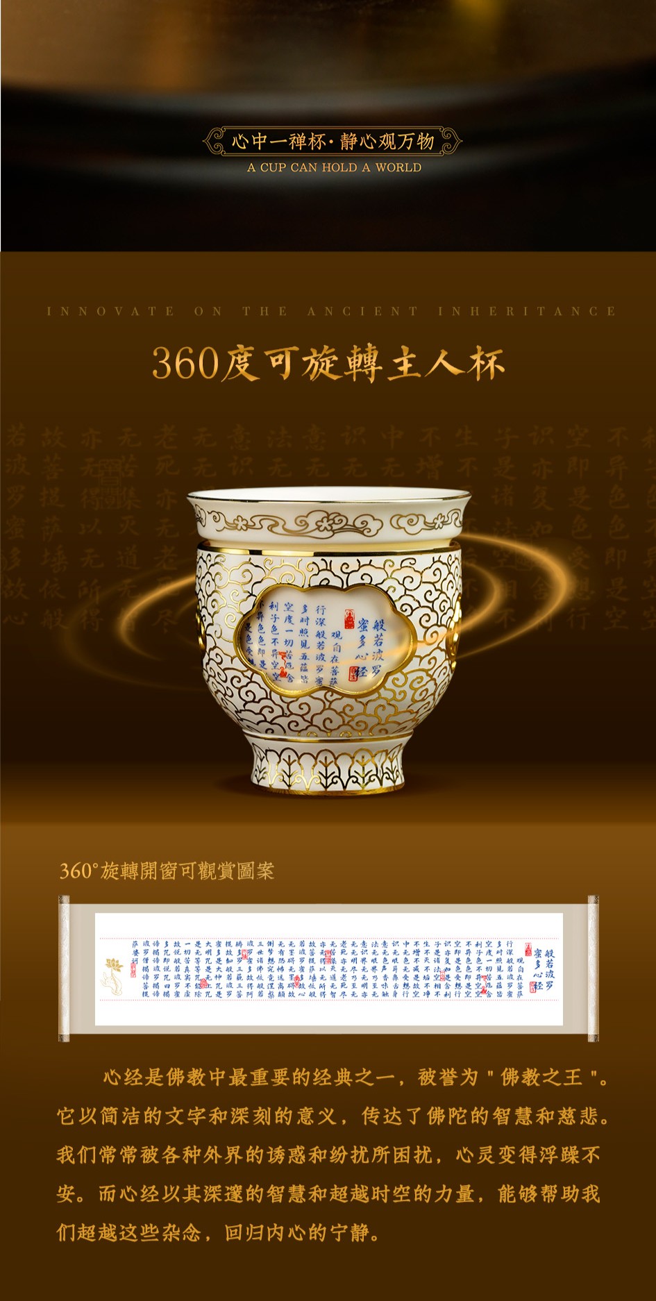 【同心同梦心经转心杯】内杯设计选取了佛教总纲的《心经》,以古代经典茶碗为原型,将金丝珐琅与陶瓷珐琅创意结合,打造可以360度旋转的禅意国风主人杯。