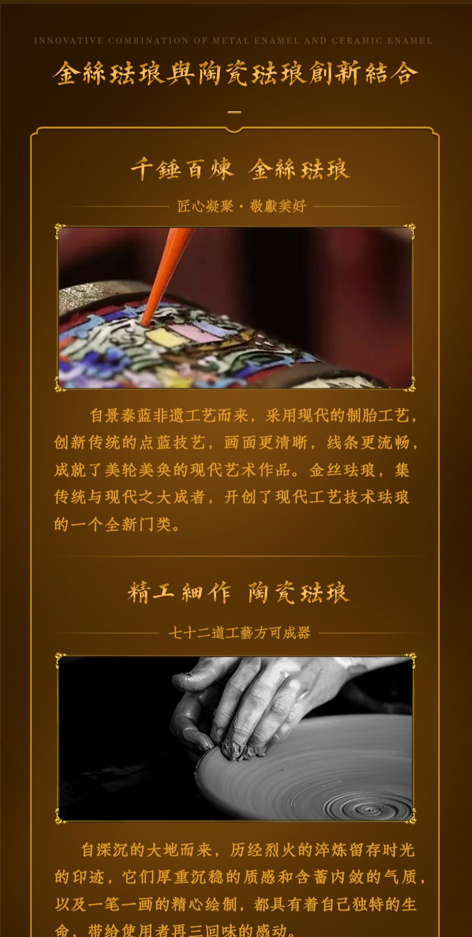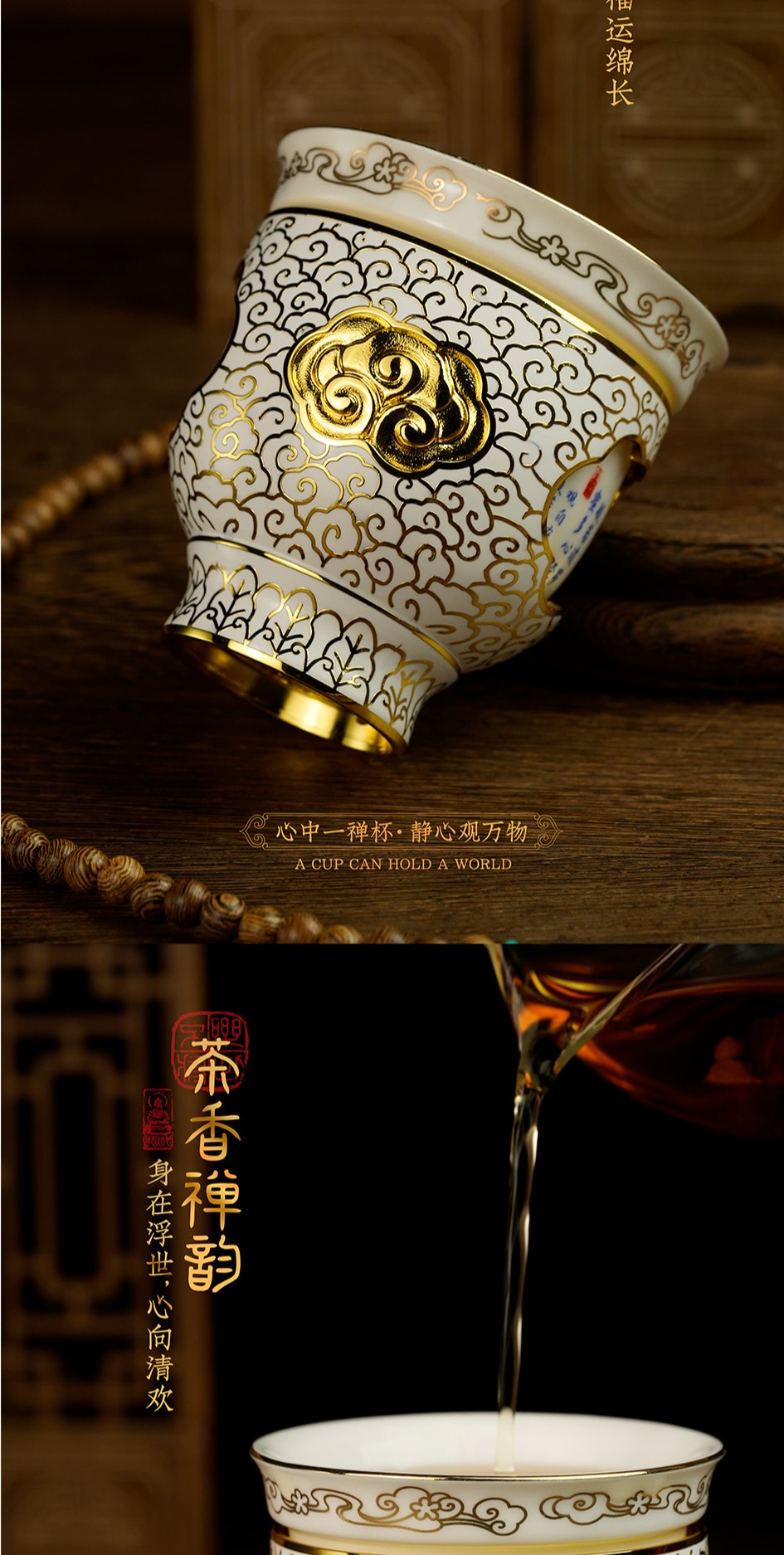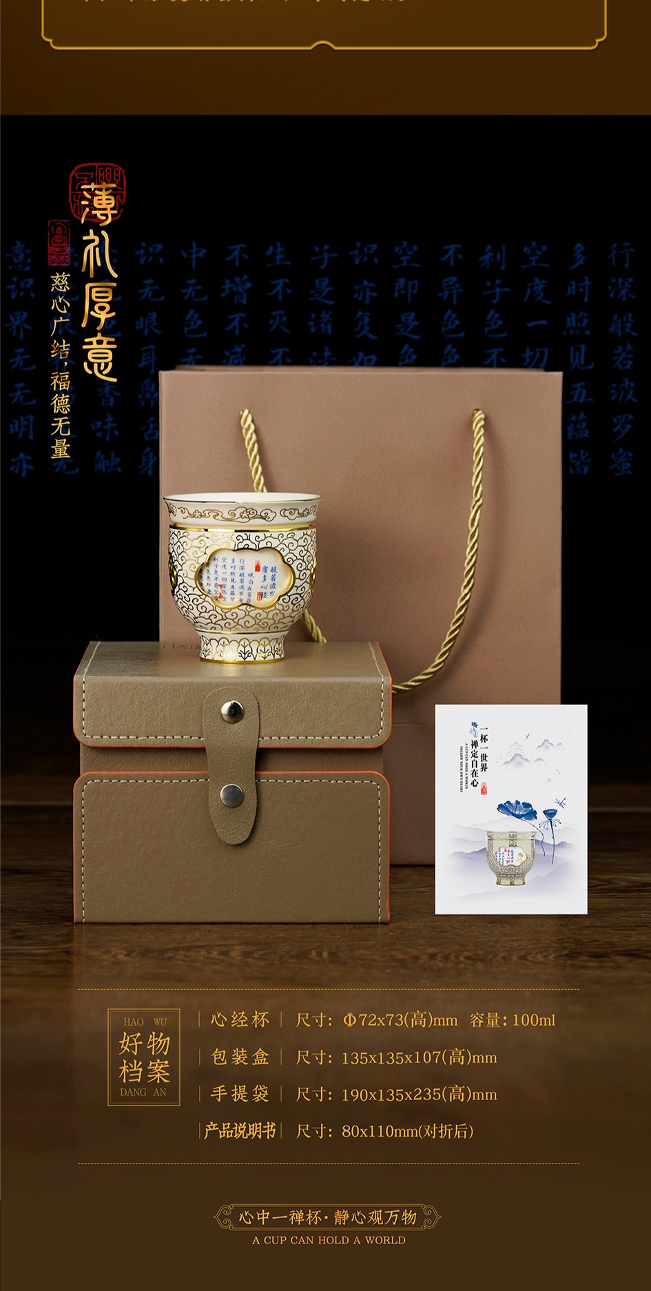 【同心同梦心经转心杯】内杯设计选取了佛教总纲的《心经》,以古代经典茶碗为原型,将金丝珐琅与陶瓷珐琅创意结合,打造可以360度旋转的禅意国风主人杯。