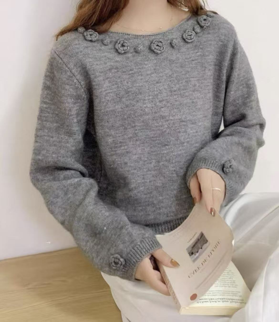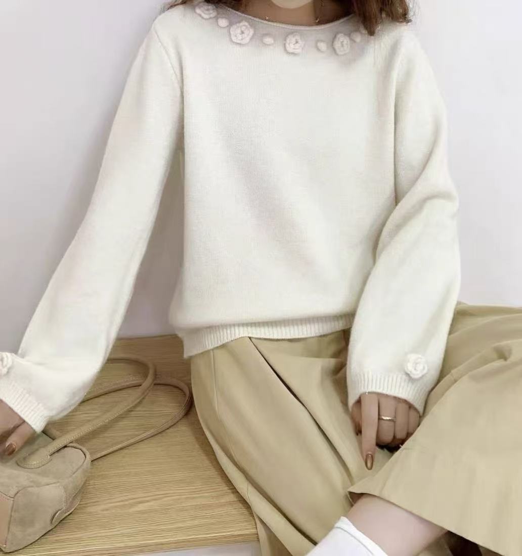 自营【超美针织衫】M09超有气质立体手工花朵一字肩毛衣-喜出