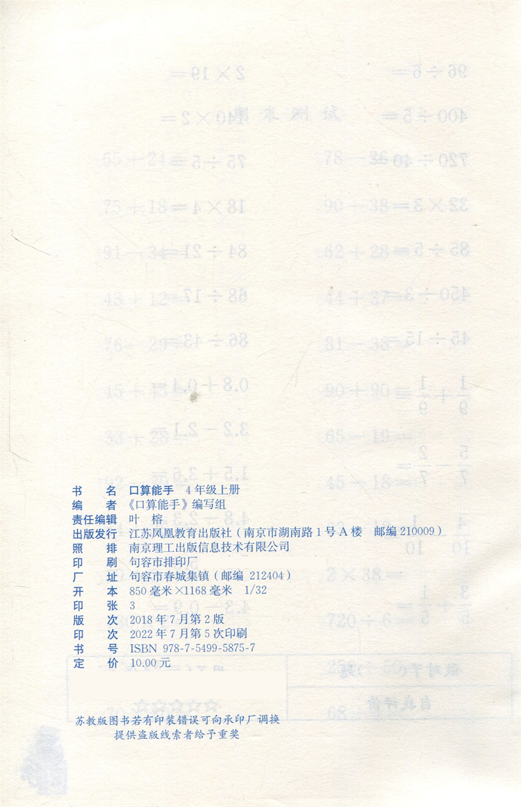 【官网正版】2022秋 口算能手 四年级上册 4上 小学数学 计算口算速算天天练 江苏凤凰教育出版社