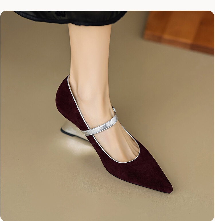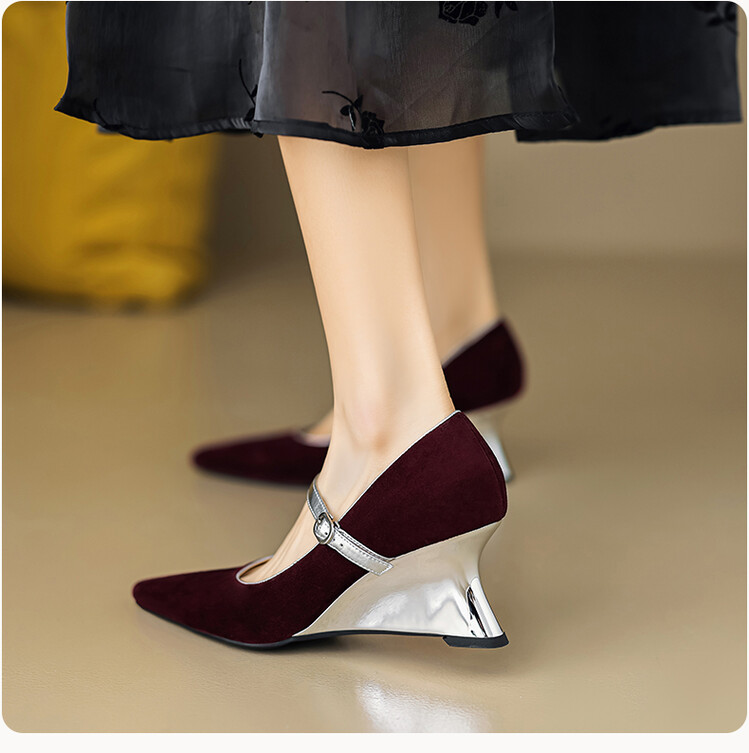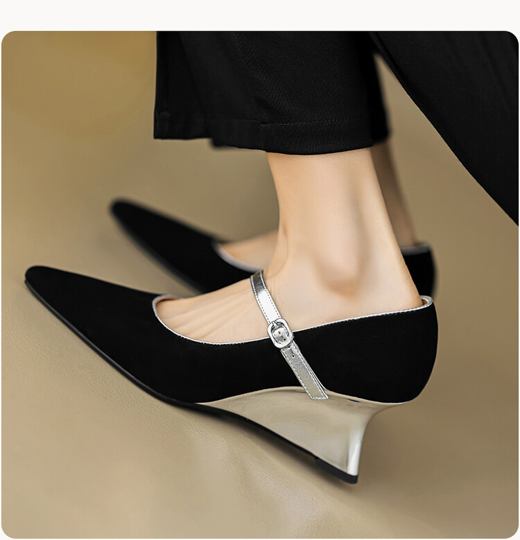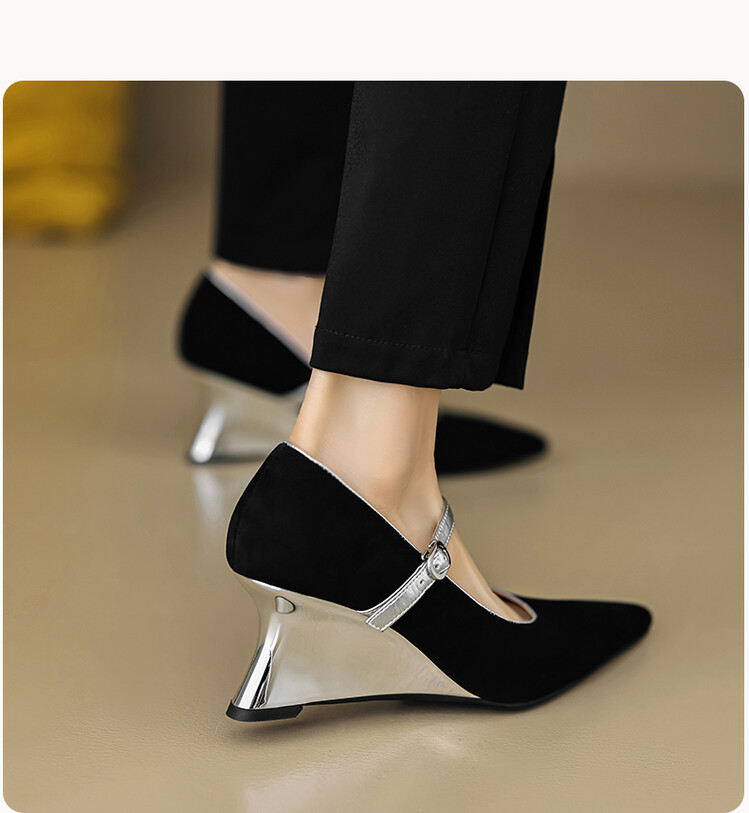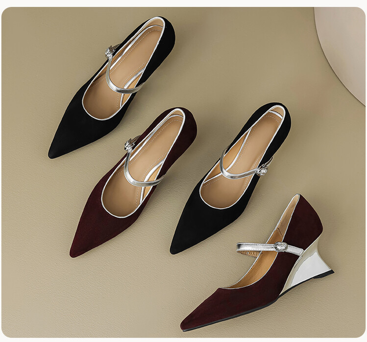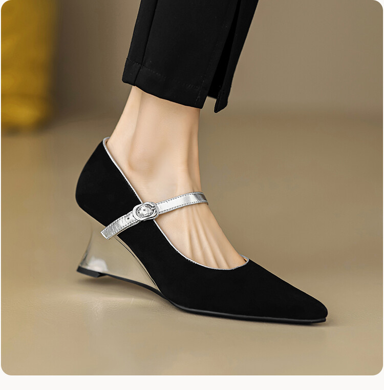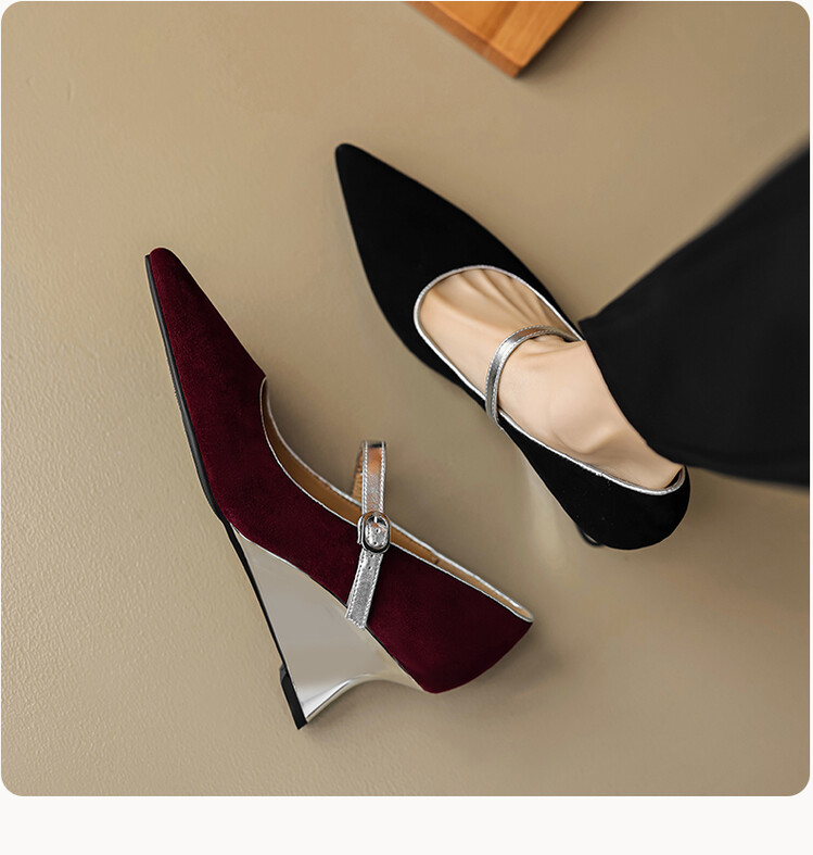 【预售5天】春季新款,坡跟高跟鞋一字式扣带单鞋尖头女士皮鞋QJR&G207-1