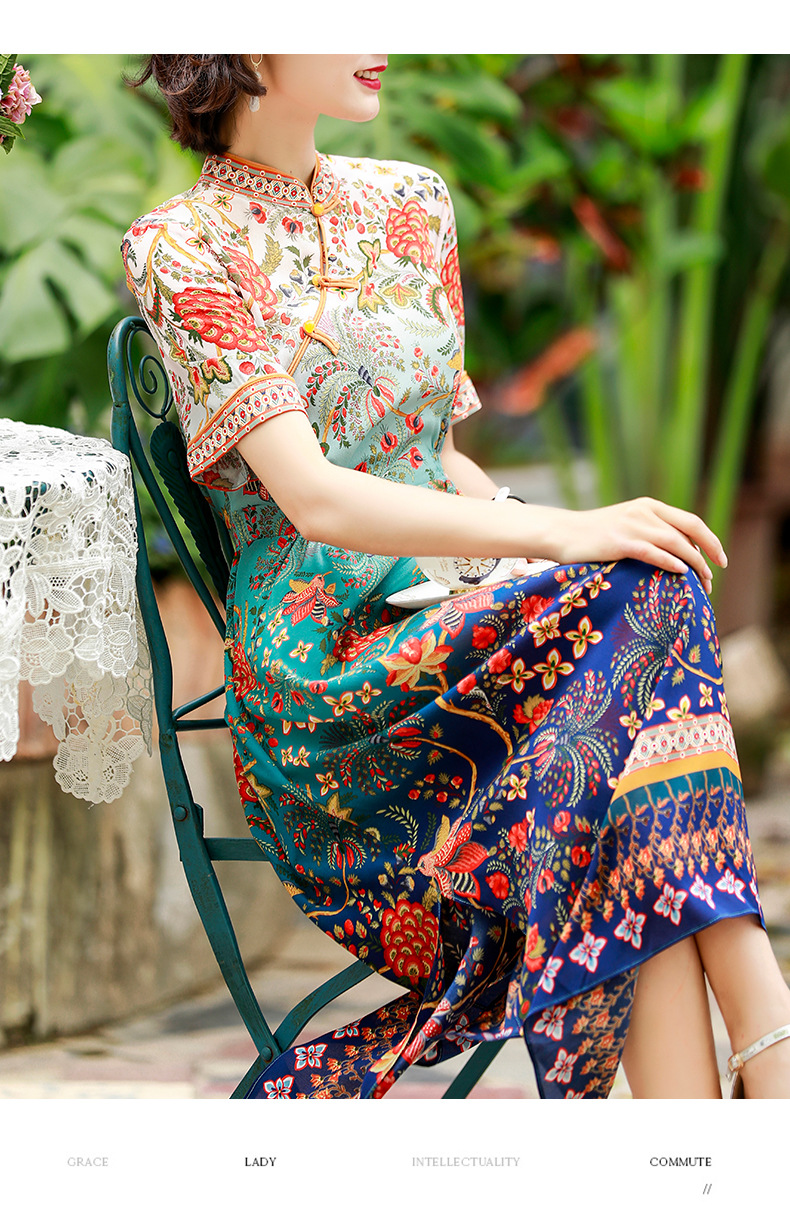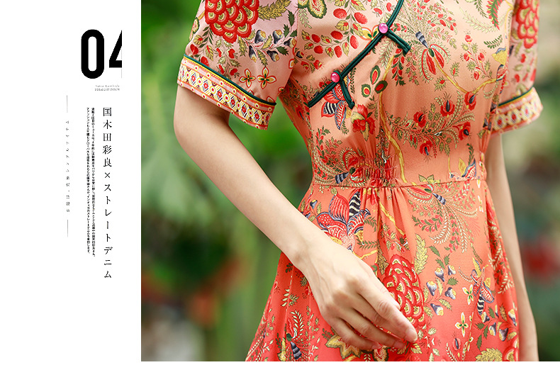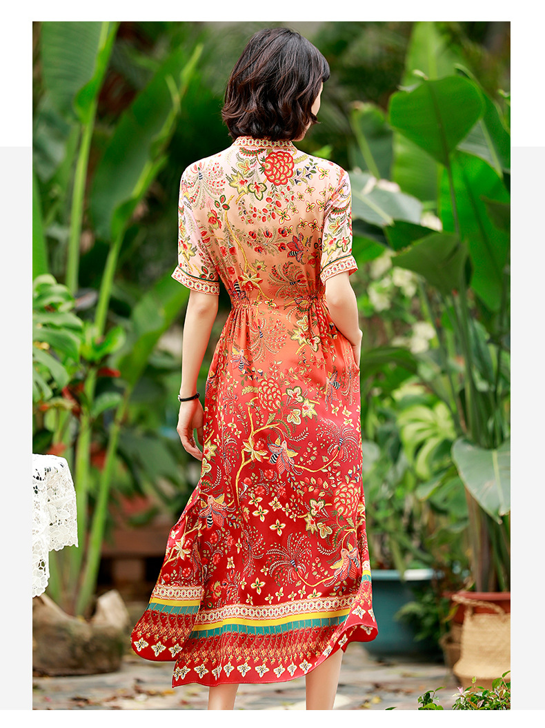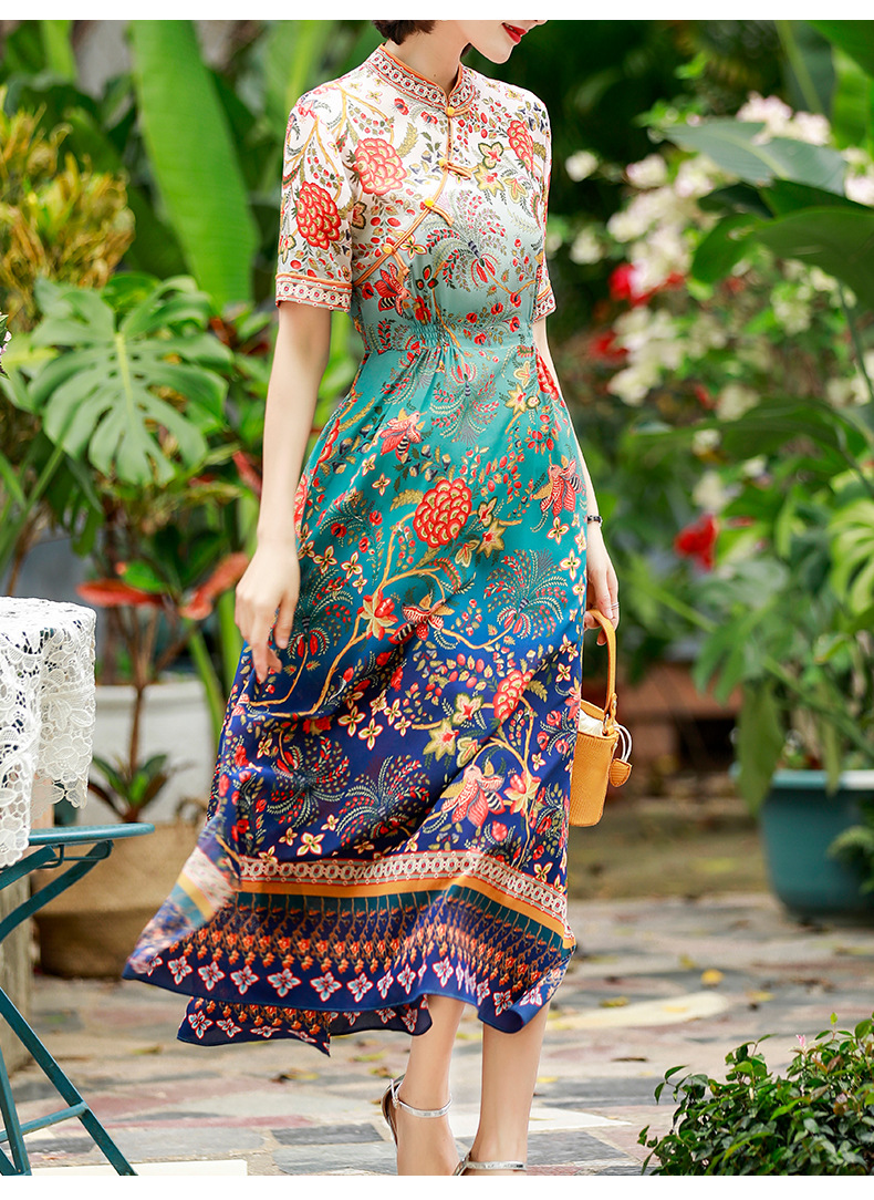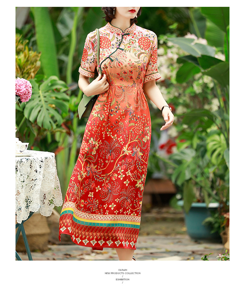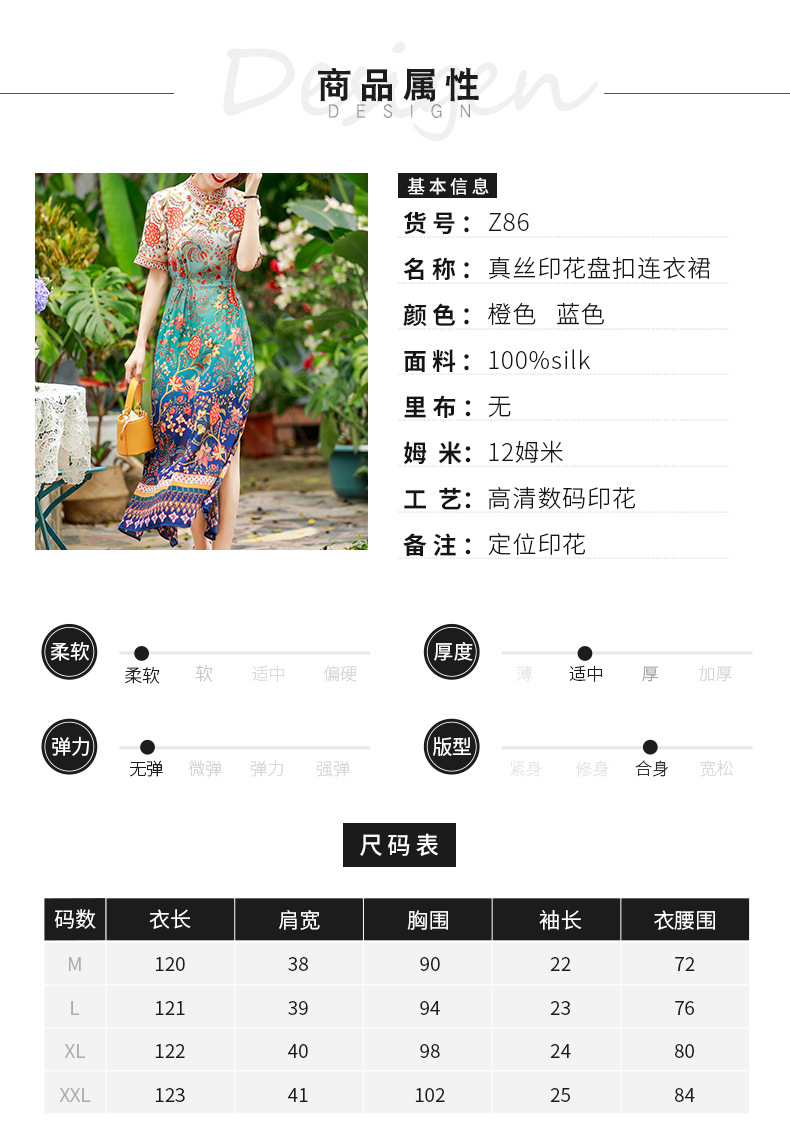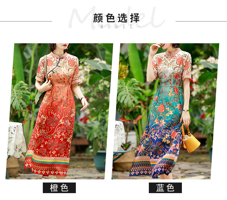 NYT-Z86新款立领中式复古桑蚕丝印花单排扣中长裙