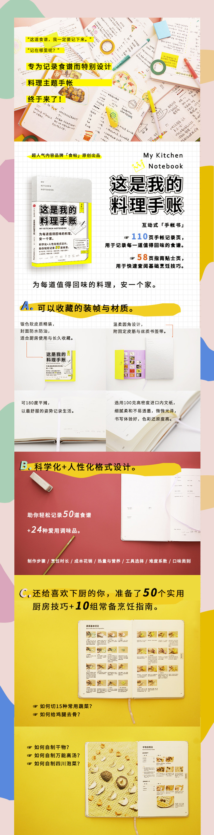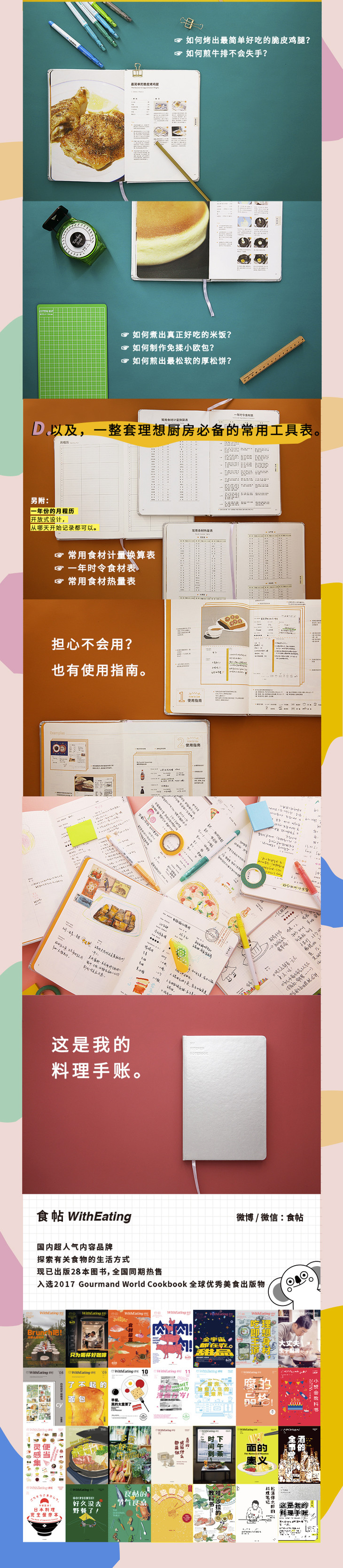 《这是我的料理手账》是食帖原创出品的手帐书,用于记录私房食谱、烹饪心得,和生活中与食物有关的难忘时刻。内含可供读者自由记录的50道私房食谱页、24种爱调味品记录页、20个厨房技巧页,以及由食帖团队邀请料理人编写的50个基本厨房技巧、10组常备烹饪指南、一年时令食材表、常见食材热量表、常见食材计量换算表、可自主设计月程历等实用指南内容。