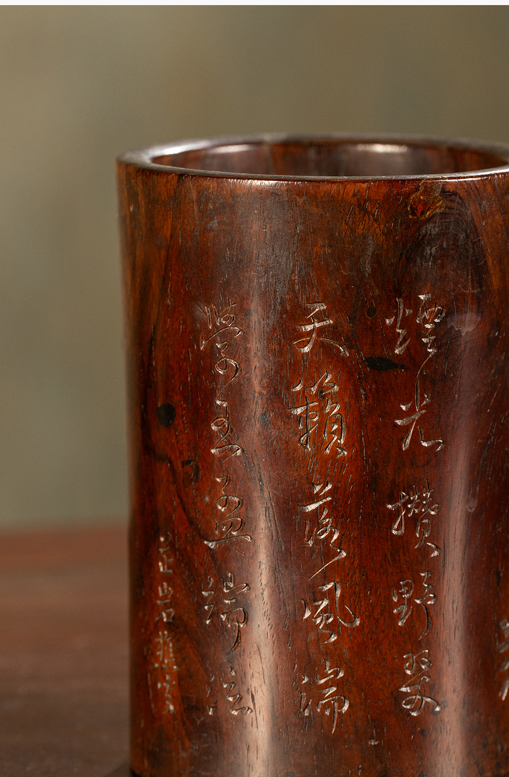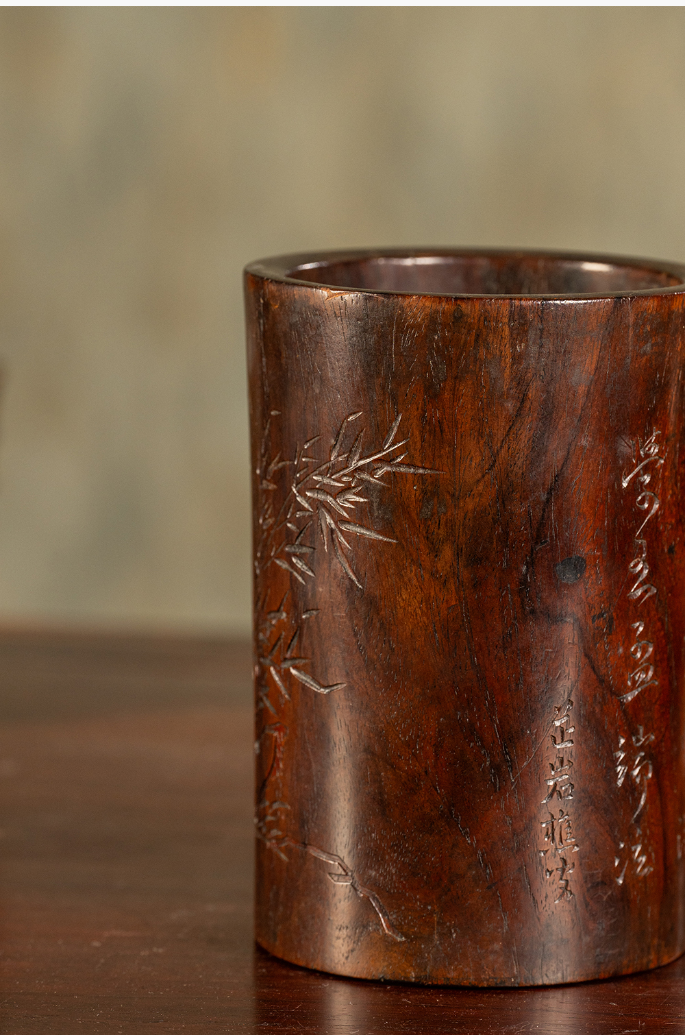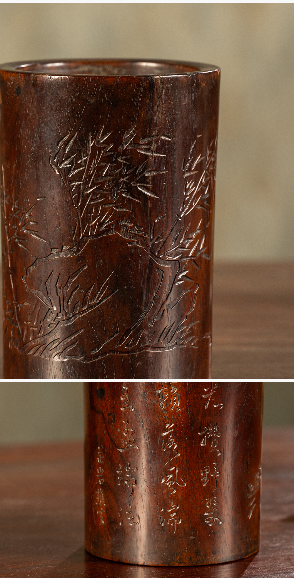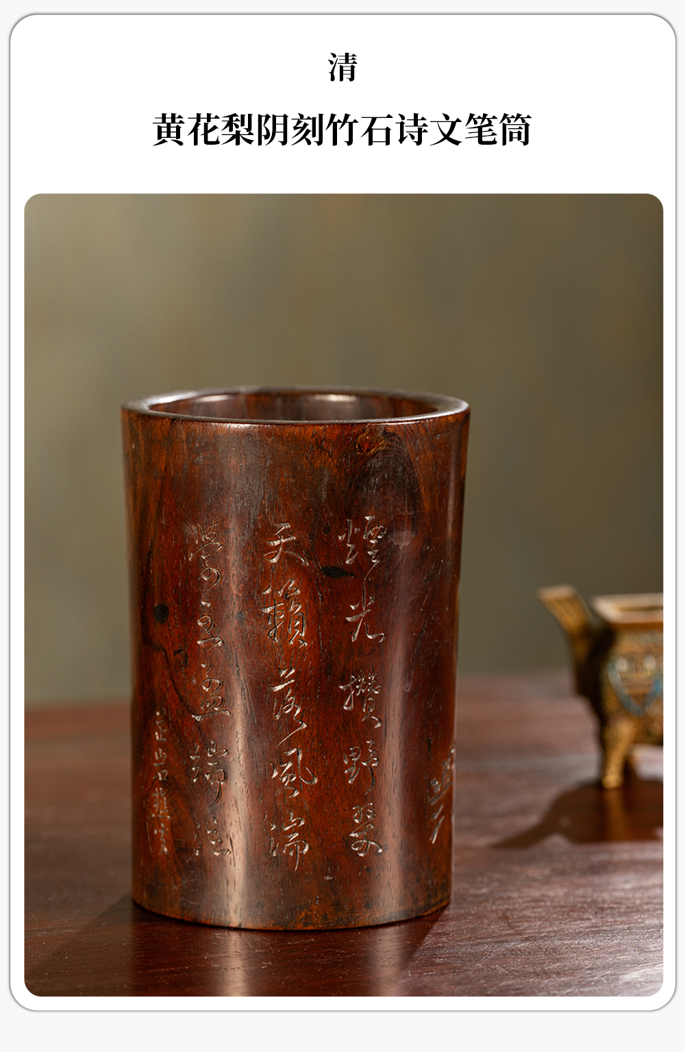 清 黄花梨阴刻竹石诗文笔筒
