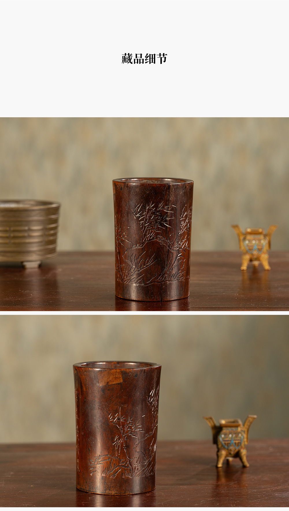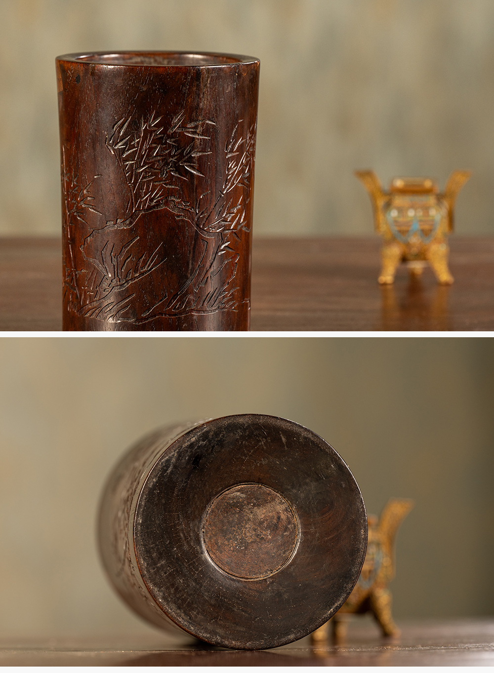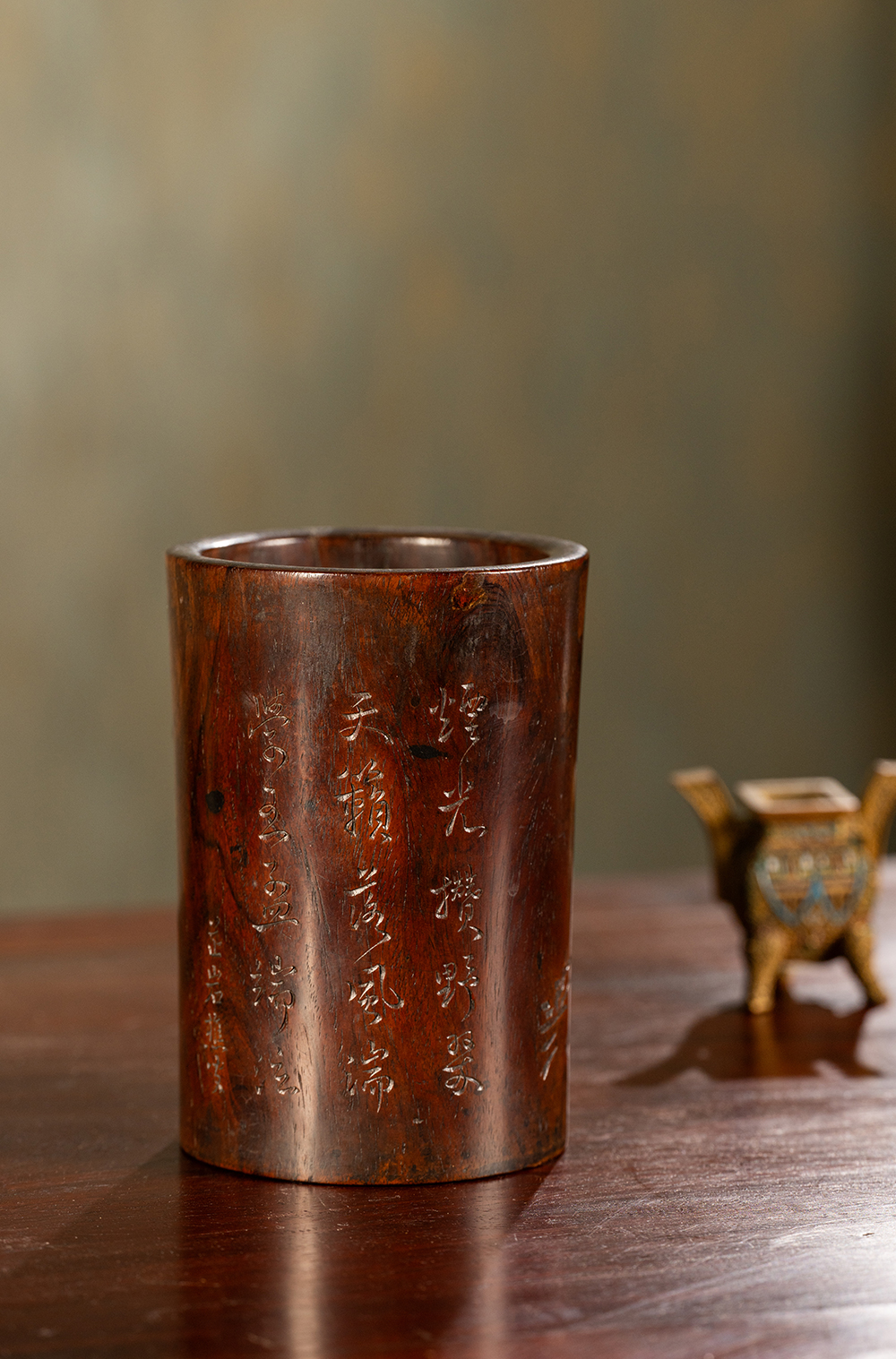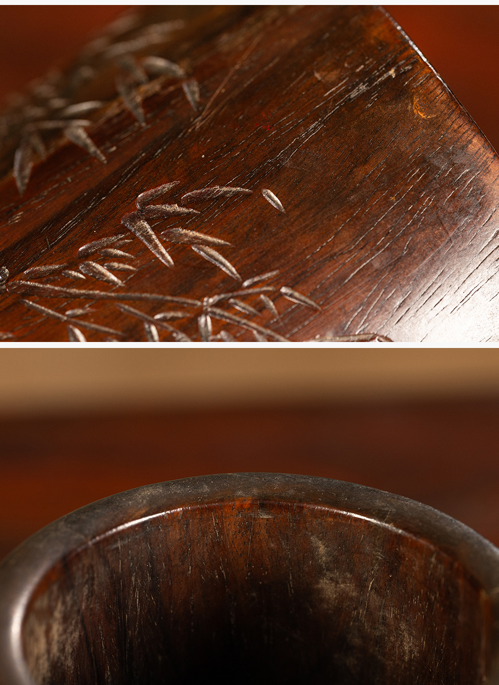 清 黄花梨阴刻竹石诗文笔筒