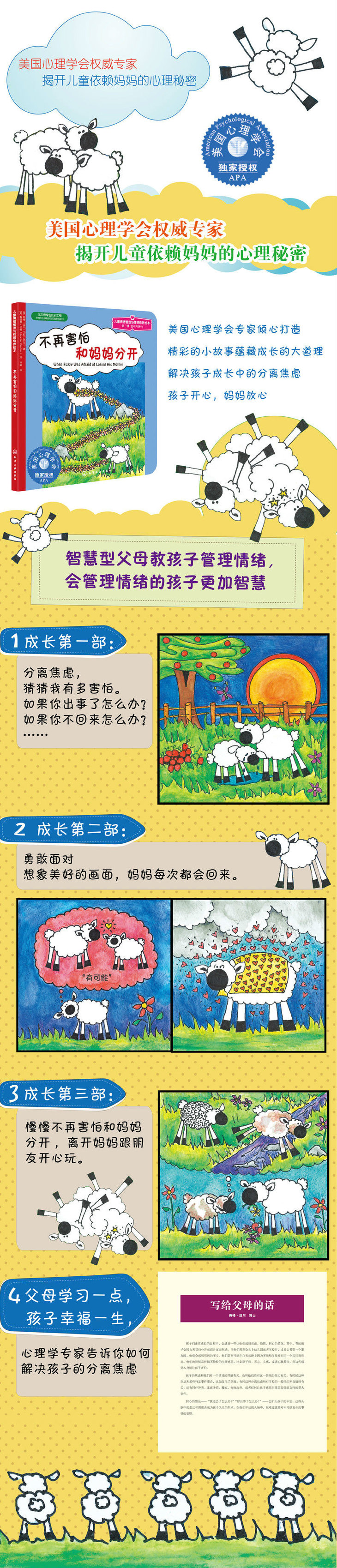 小羊富丝是一个帮助儿童应对恐惧的图书系列,包括对失败的恐惧、害羞、分离焦虑、害怕与他人不同,以及害怕噪声。作者和插画师是一个母女团队,她们在心理学、儿童发展以及教育方面有丰富的专业经验。 《不再害怕和妈妈分开》是这个系列的第—本。