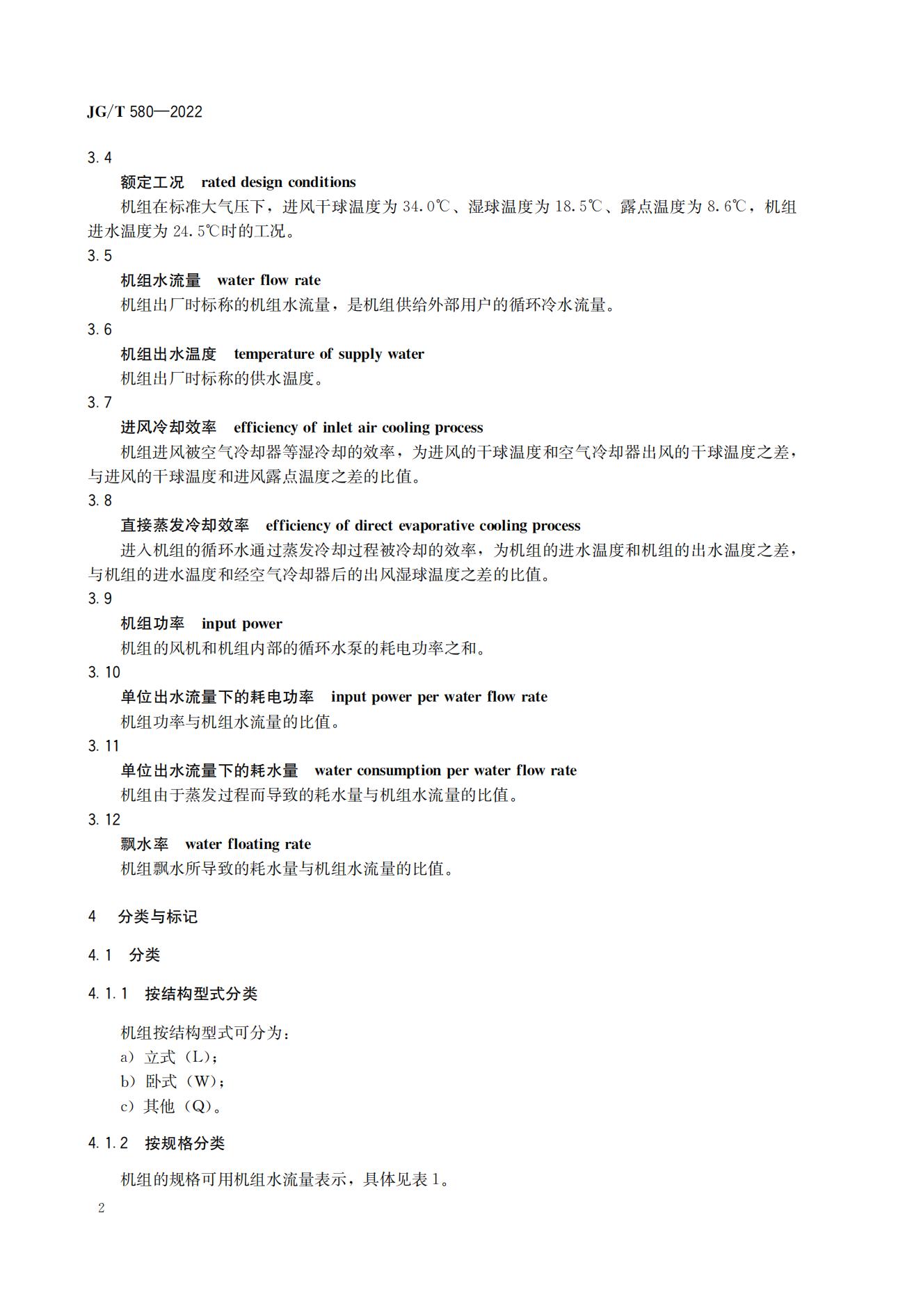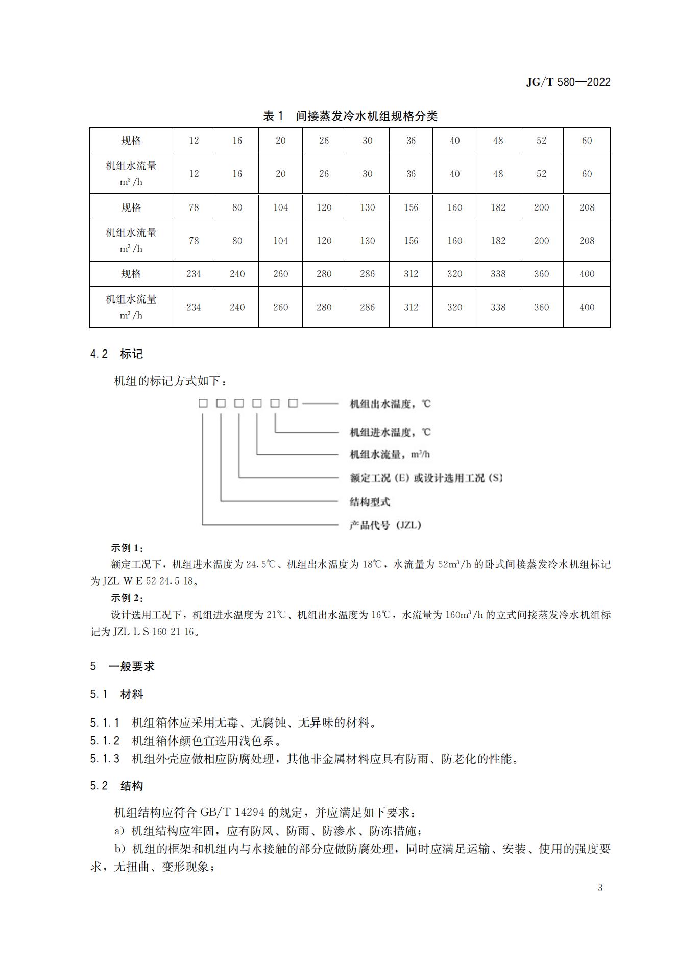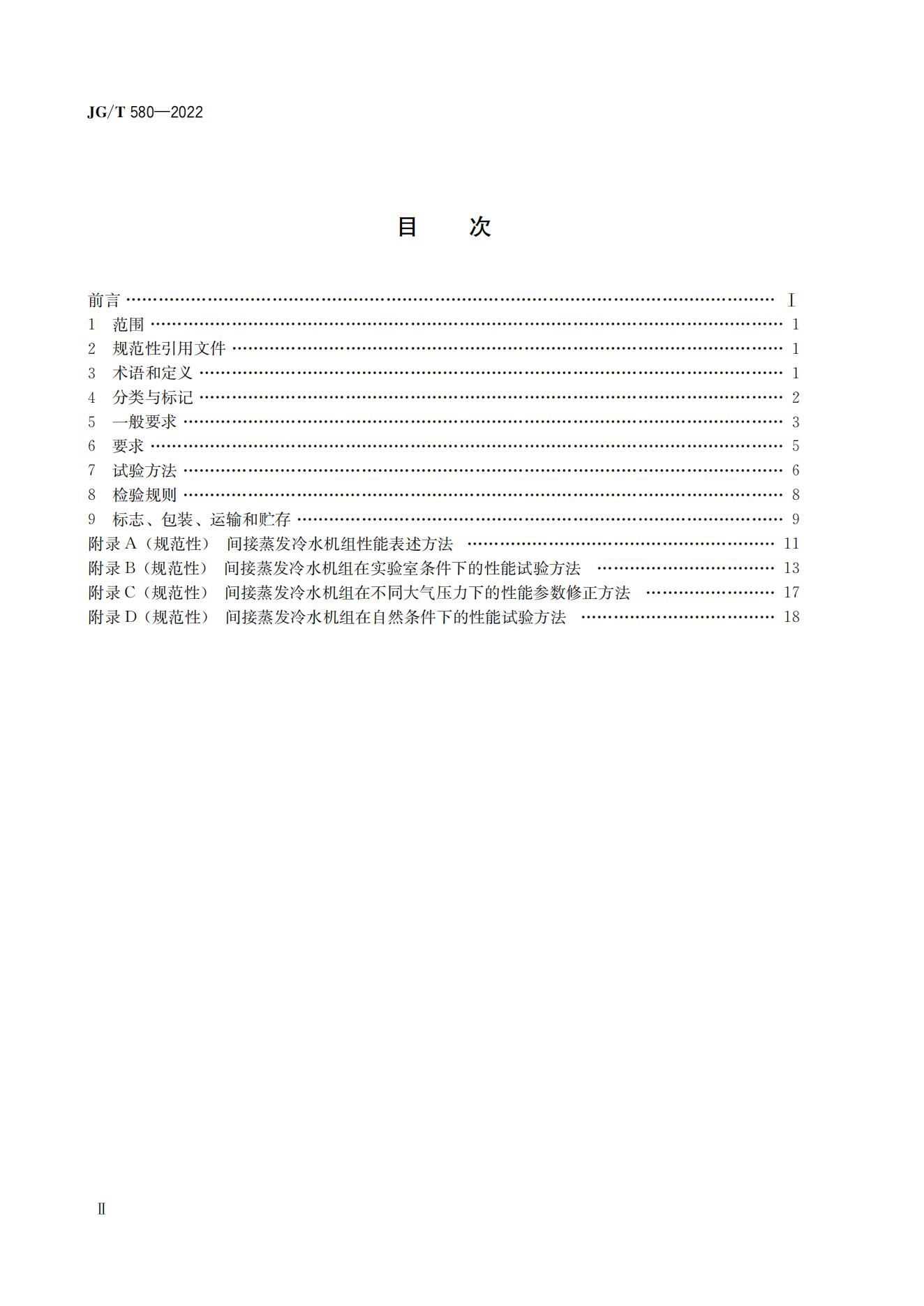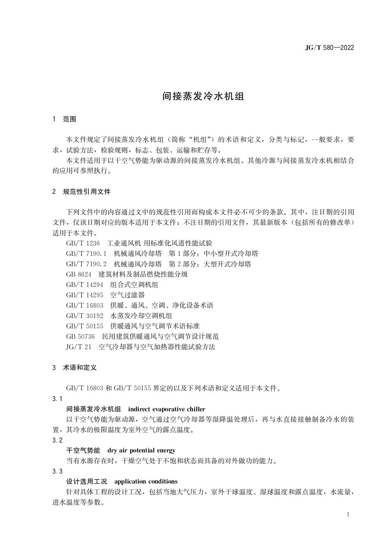 本文件按照GB/T1.1-2020给出的规则起草。本文件由中华人民共和国住房和城乡建设部标准定额研究所提出。本文件由中华人民共和国住房和城乡建设部建筑环境与节能标准化技术委员会归口。本文件规定了间接蒸发冷水机组(简称“机组”)的术语和定义,分类与标记,一般要求,要求,试验方法,检验规则、标志、包装、运输和贮存等。本文件适用于以干空气势能为驱动源的间接蒸发冷水机组。其他冷源与间接蒸发冷水机相结合的应用可参照执行。