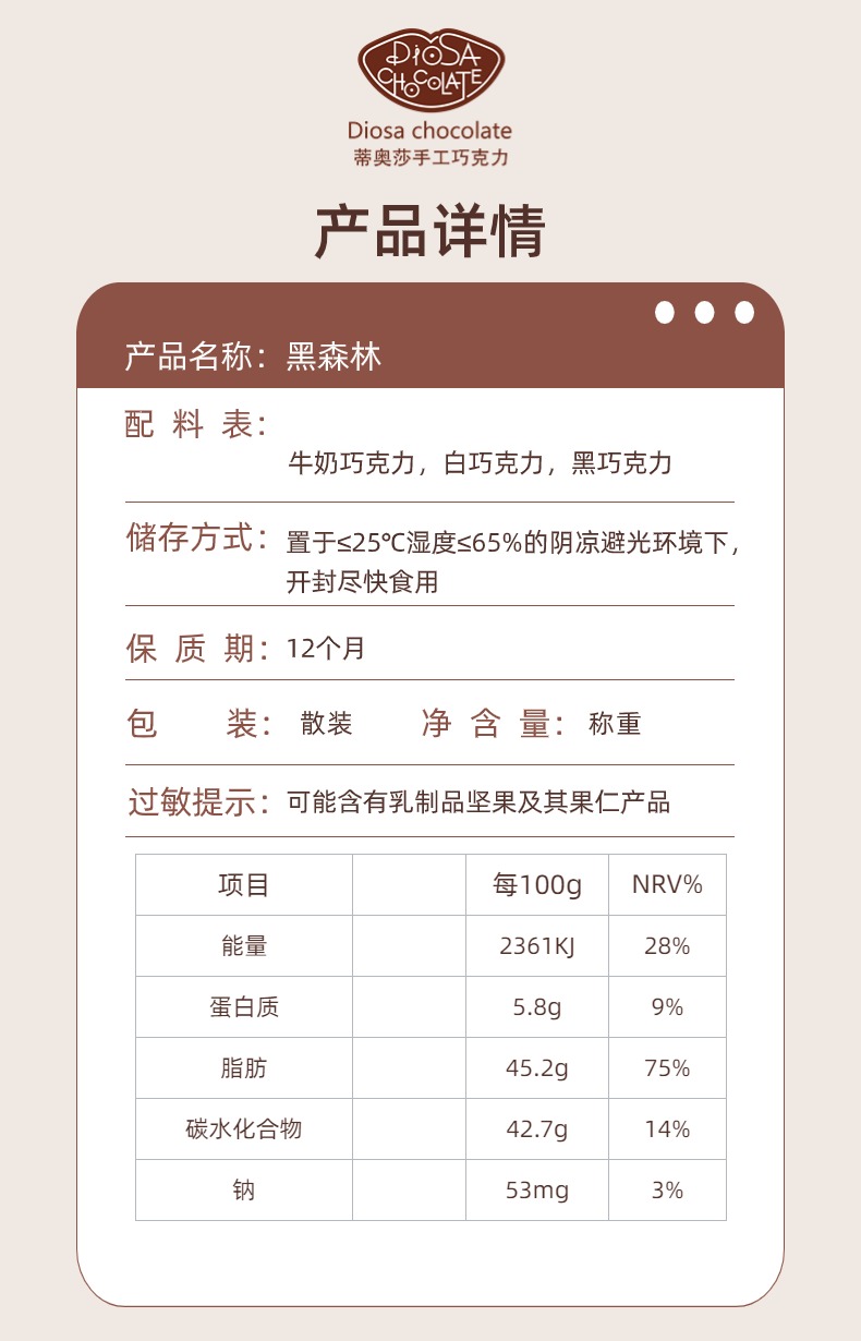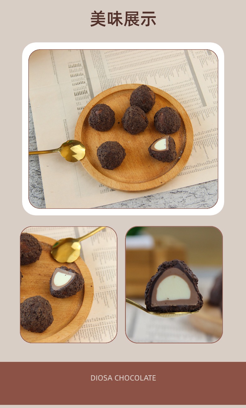 DIOSA(蒂奥莎)巧克力在西班牙语中是“女神”的意思。DIOSA品牌一直致力于纯脂手工巧克力的研发和推广,全部原料来自比利时,意大利,西班牙等欧洲传统巧克力王国,运用比利时传统工艺纯手工制作。