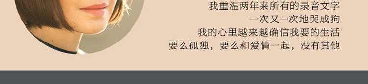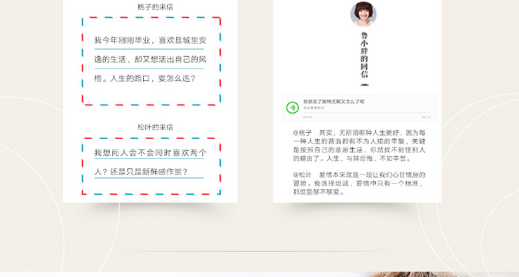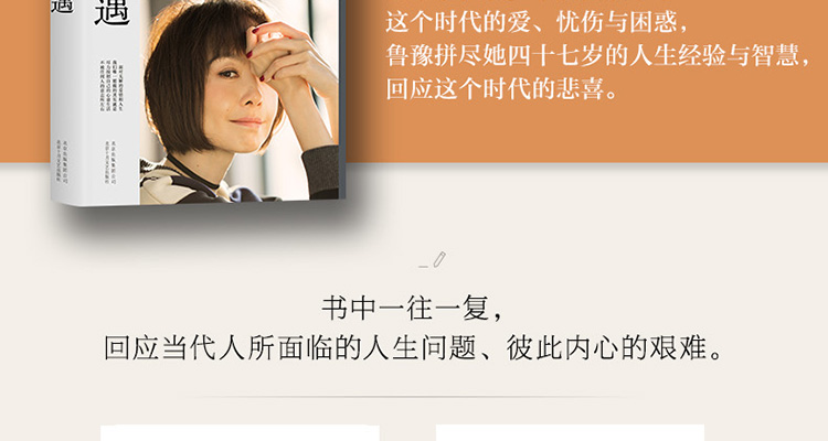 面对无解的爱情和人生,我们*能做的其实就是尽力按照自己的心意生活,不被任何人的意志所左右。 ——陈鲁豫★书中选入读者来信69封,从多个层面反映了这个时代的爱、忧伤与困惑,鲁豫拼尽她47岁的人生经验与智慧,耐心而真诚地回答,精彩感人,金句叠出。书中所展示的,都是当代人(从少年到中年)所面临的*典型、*艰难、*普遍的人生问题,鲁豫用她的诚恳,如知己,如闺密,如诤友般,一往一复,回应彼此内心的艰难。泥泞人生,我们都是同路人。★在字里行间,一个独立、自强、优雅、向上的现代女性的特质被展露无遗。她对朋友的态度,她对爱情的态度,她对生活的态度,她对命运的态度,她对挫折的态度,她对时间的态度,都有着鲜明的姿态。她的所思所想、她的喜怒哀乐,她的朋友圈,她的个人生活,她的价值观和世界观,无一不清晰地跃然纸上。★书中每一篇文后,都可以扫码倾听陈鲁豫温暖、倔强、真诚的声音和回答。有时哀其不幸,有时怒其不争,有时忍俊不禁,有时泫然泪下,有时重如泰山,有时四两拨斤。你可以触摸到她真切的灵魂。