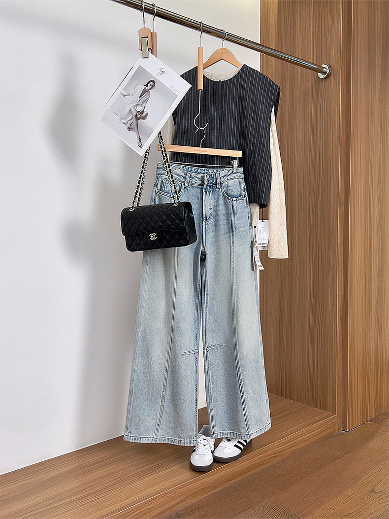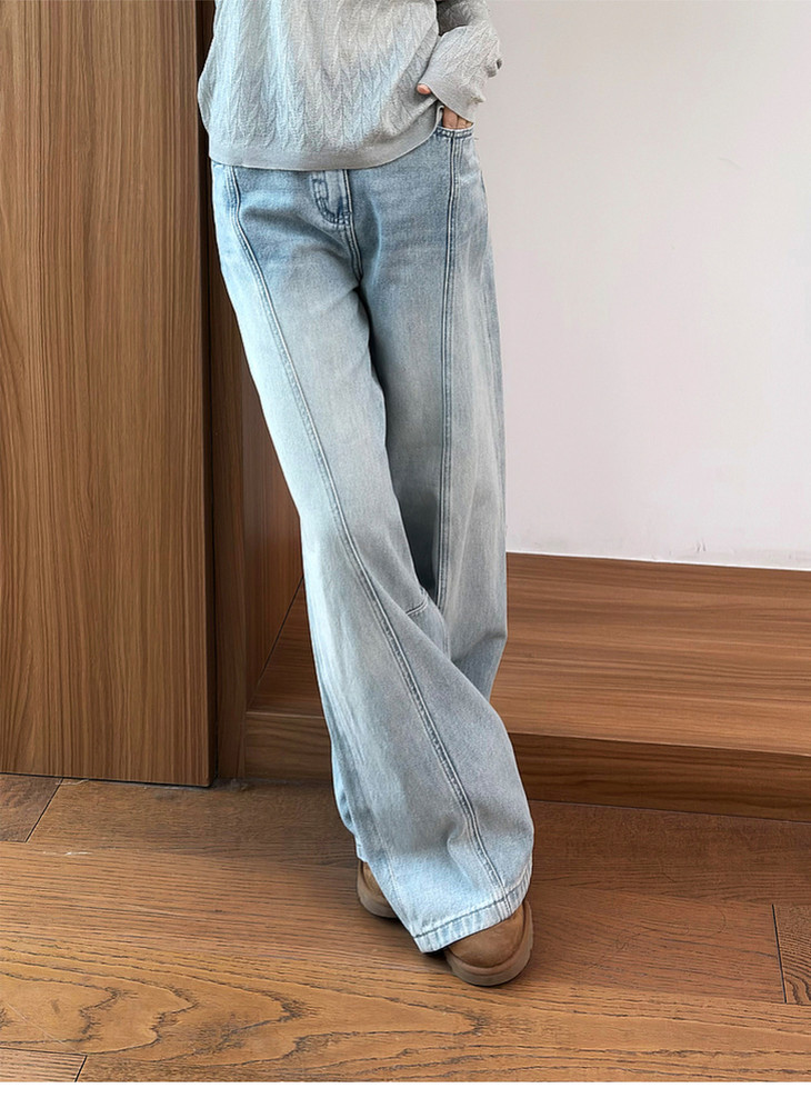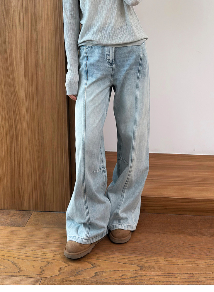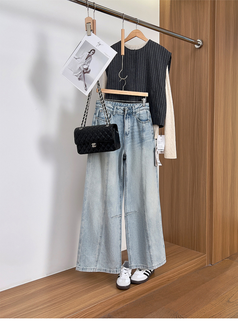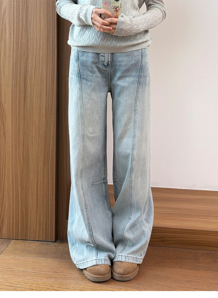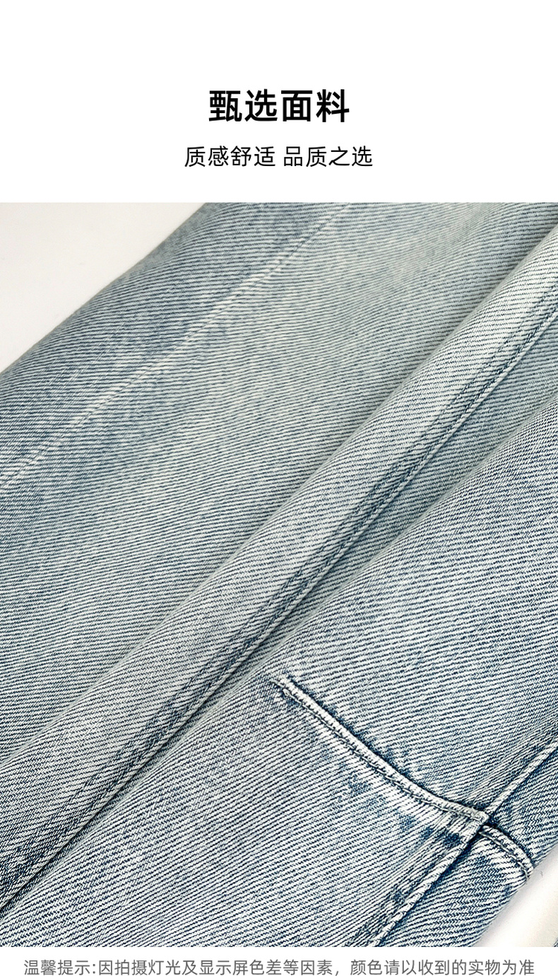 专柜实拍【100棉+垂感有型】拉夏贝尔/La Chapelle复古水洗浅蓝牛仔直筒裤显瘦显腿直长裤