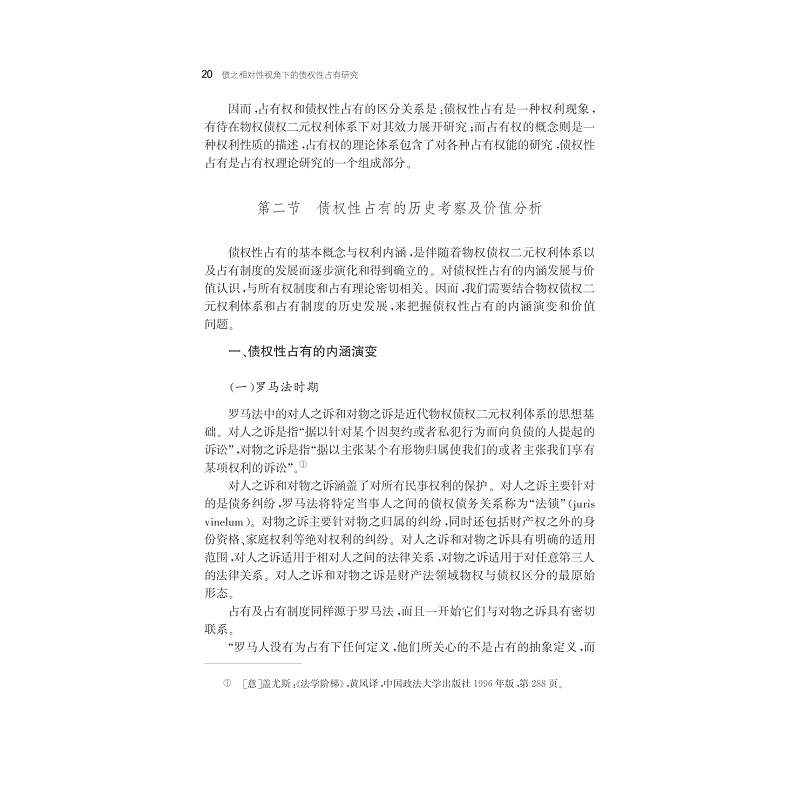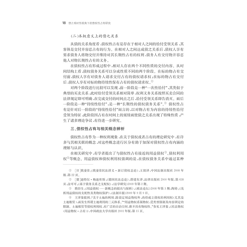 债权性占有是民法学的一个基础理论问题,同时也是司法实践中的一个重要争议问题。本书通过系统论述债权性占有的本权内涵,分析债权人之对抗性、优先性、绝对性等效力本质,评析相关司法解释和各地裁判,以此来检讨债权性占有对抗性、优先性、侵权保护中的绝对性等诸多被论及为“债权物权化”的现象。