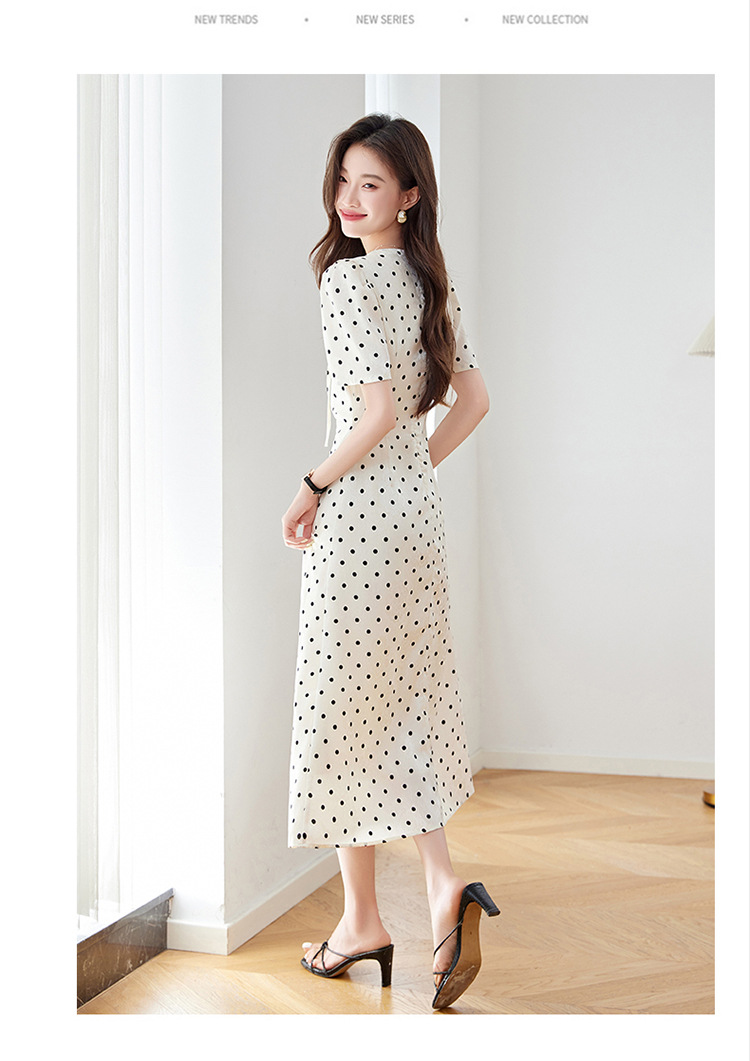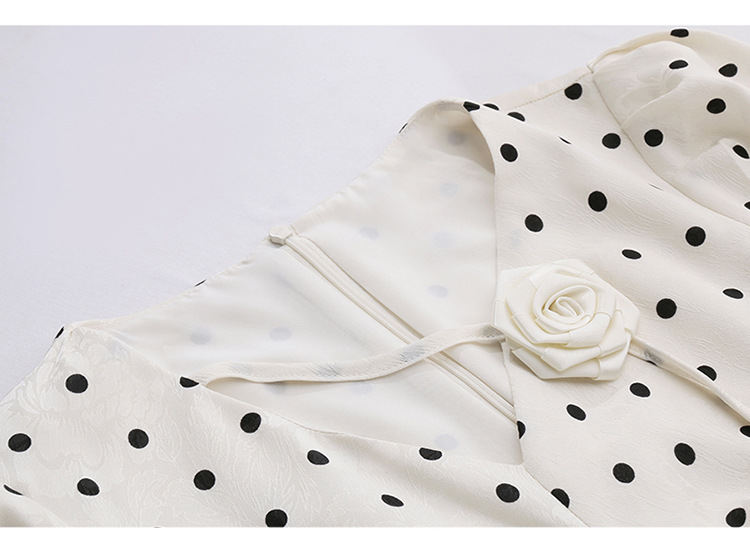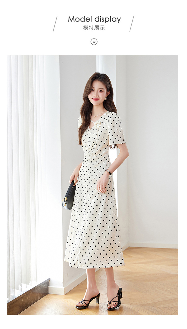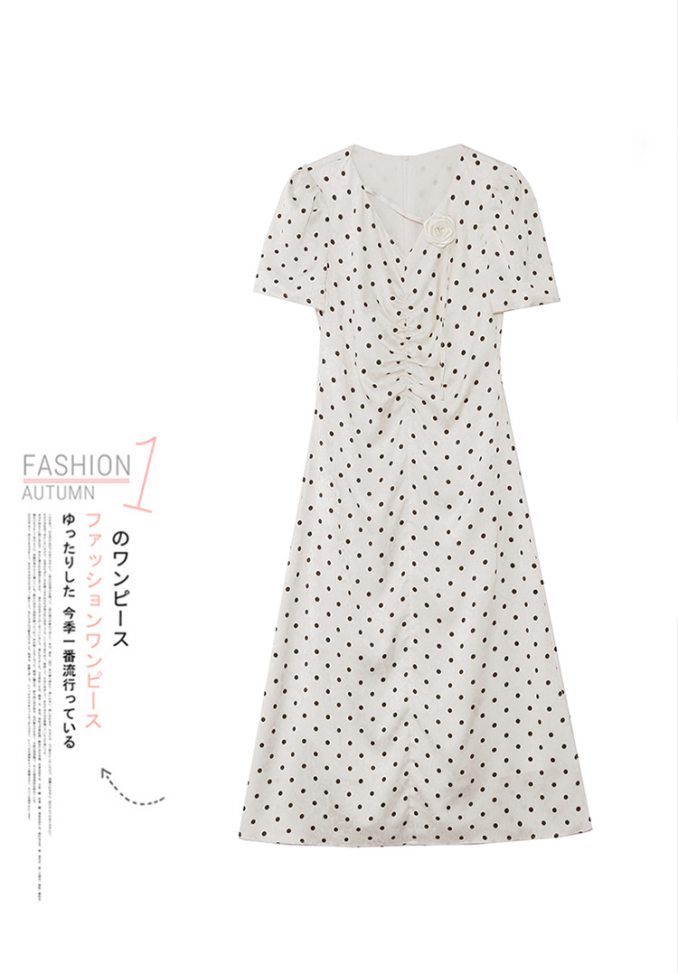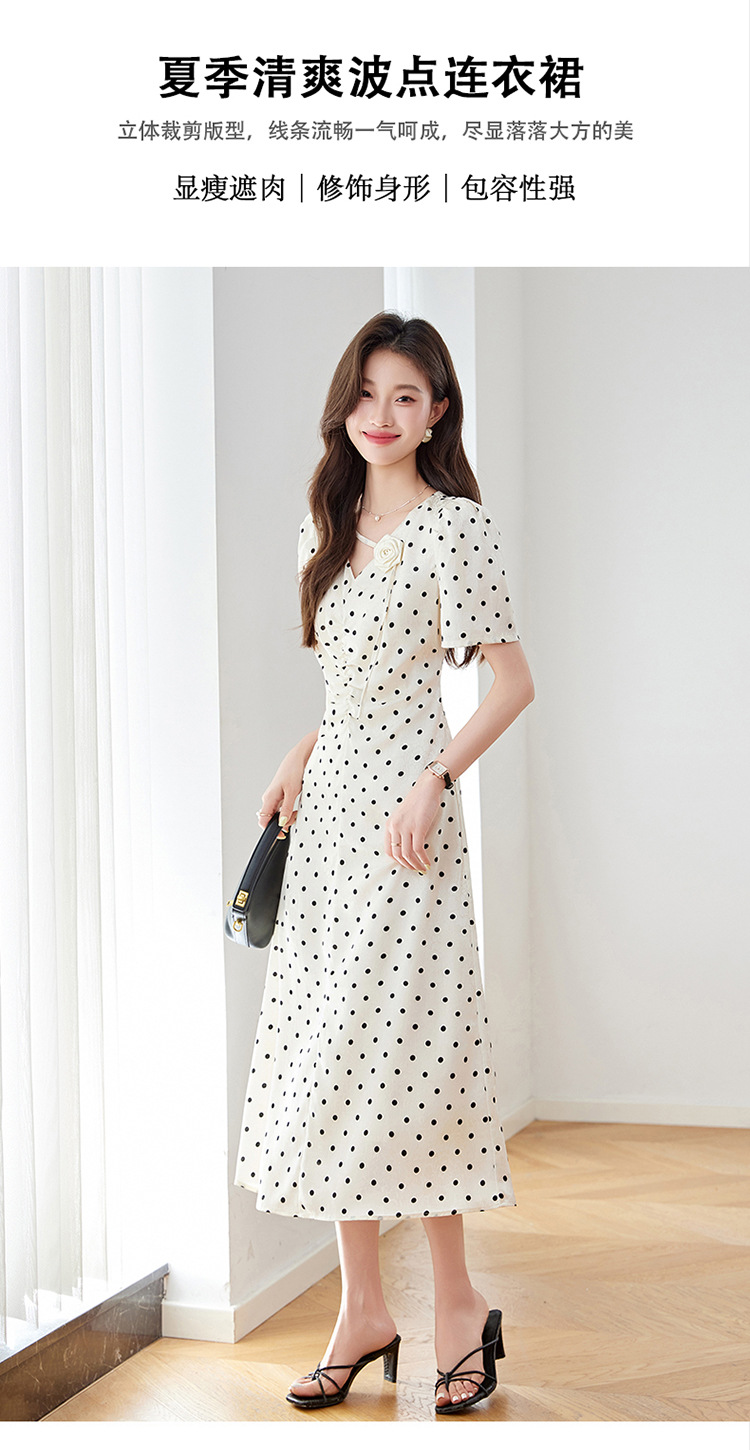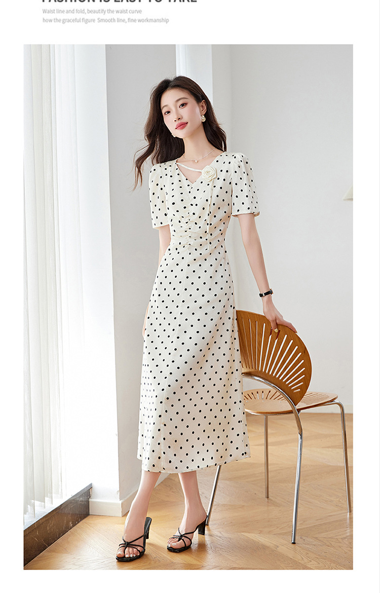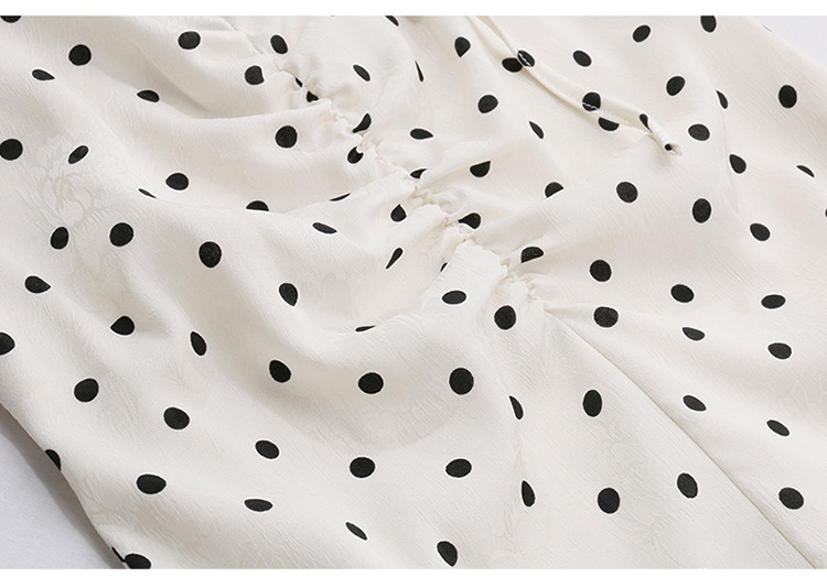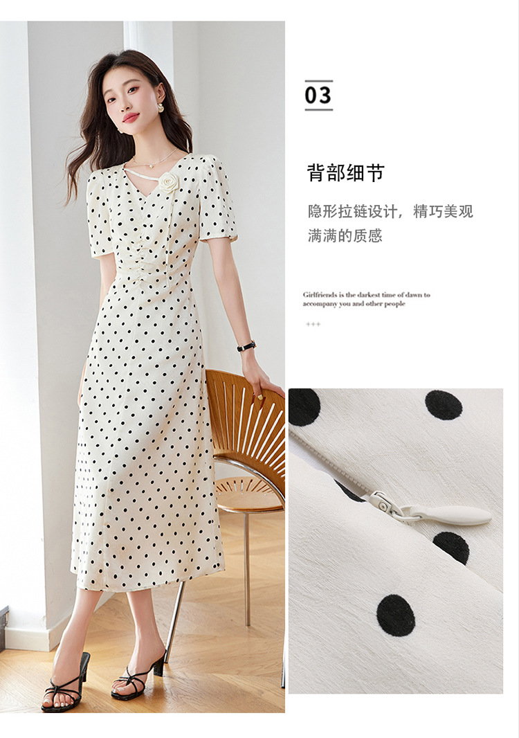 白色波点丝连衣裙,法式收腰显瘦巨好看的显瘦裙子HR-5627