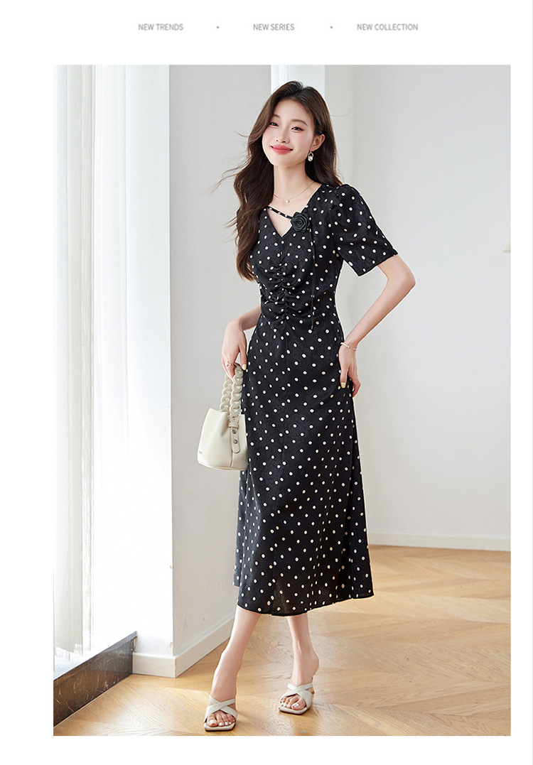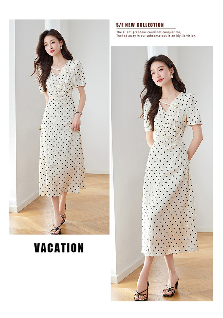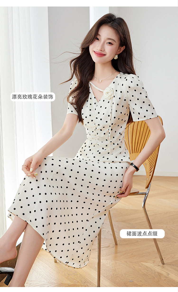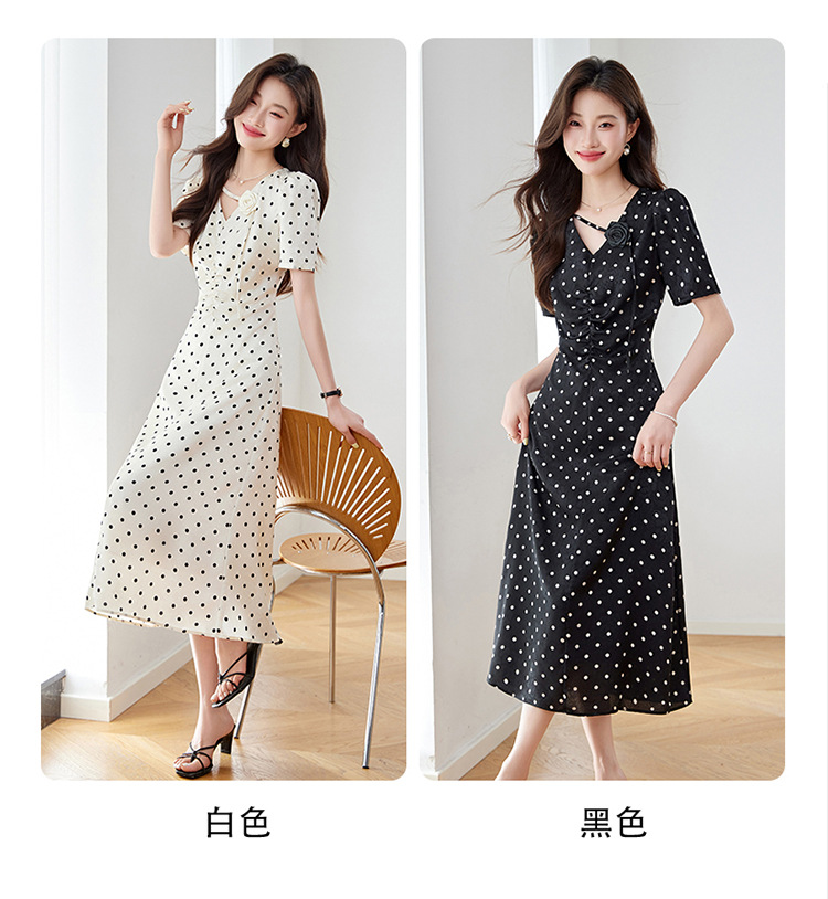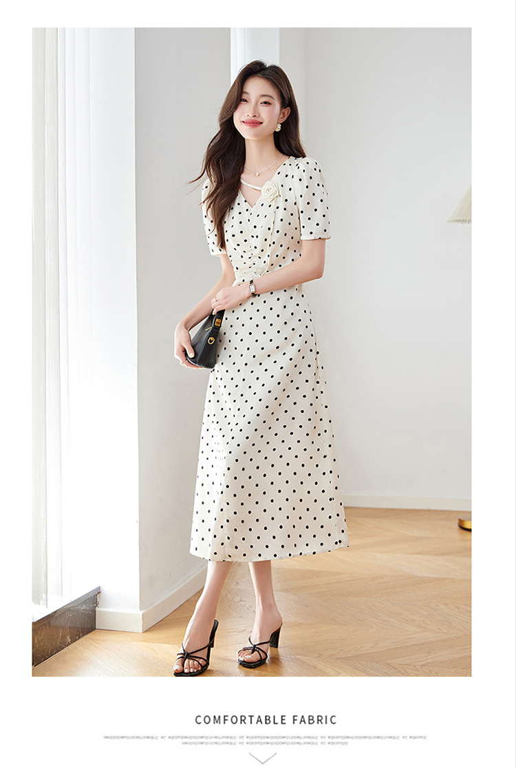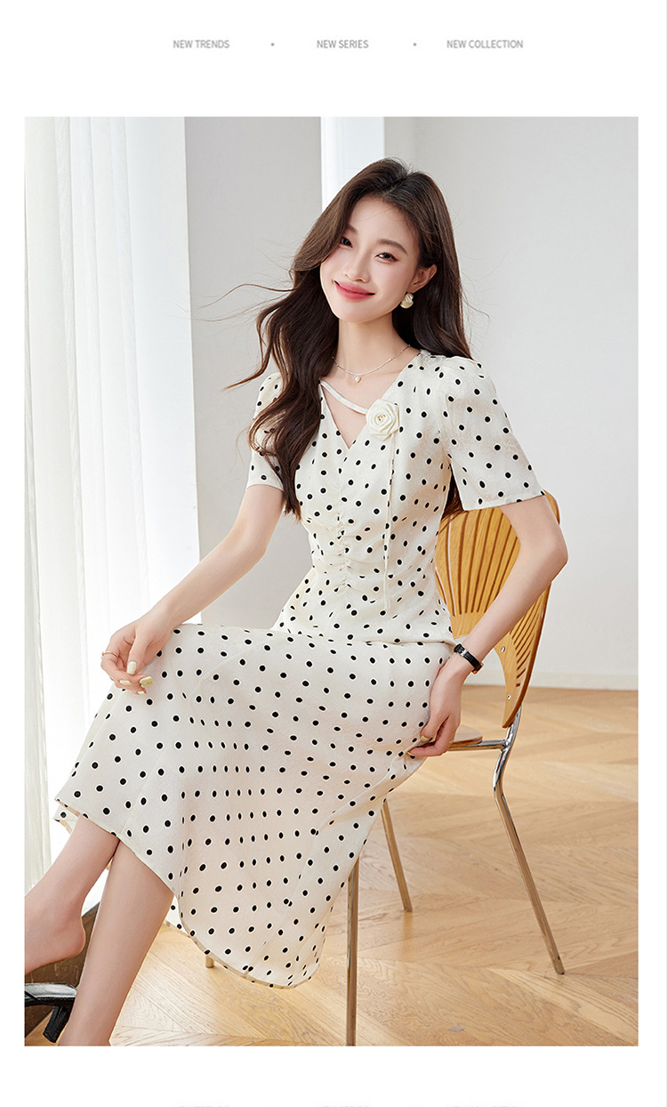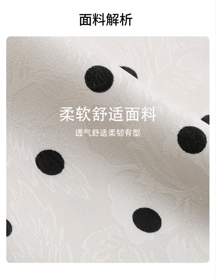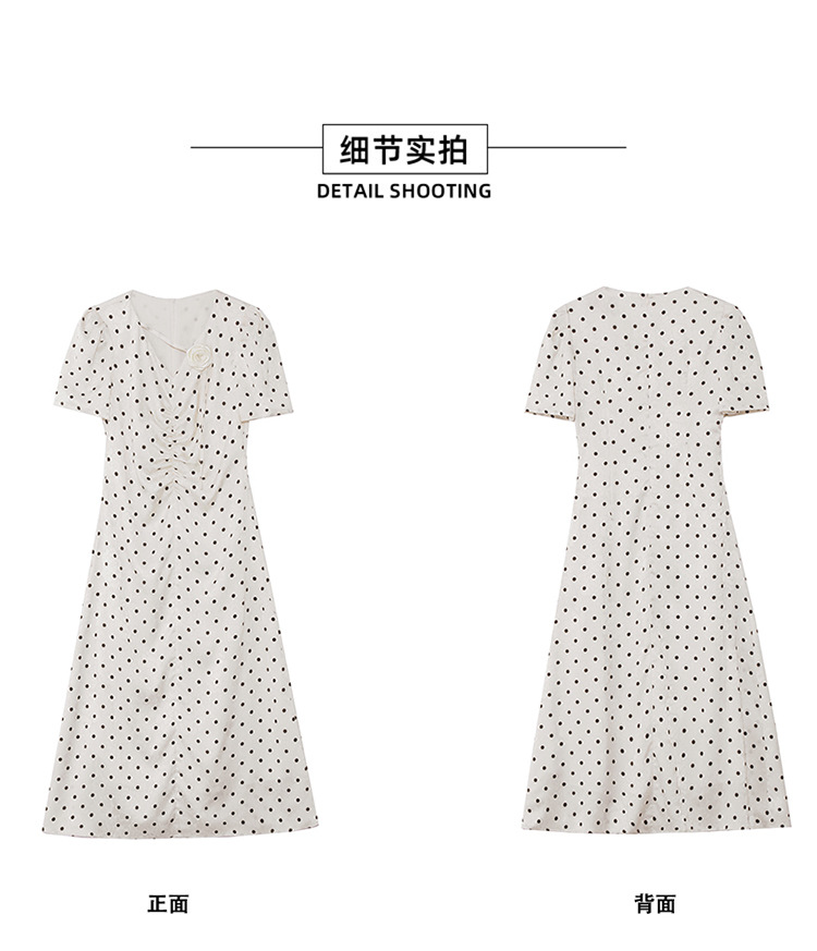 白色波点丝连衣裙,法式收腰显瘦巨好看的显瘦裙子HR-5627
