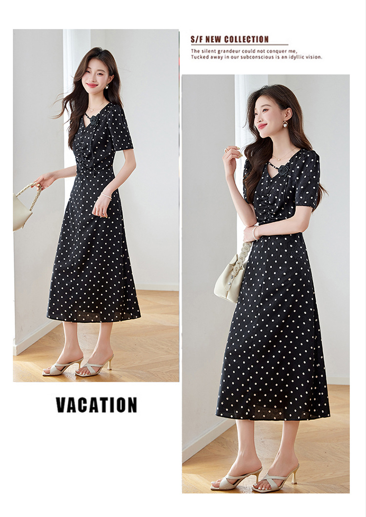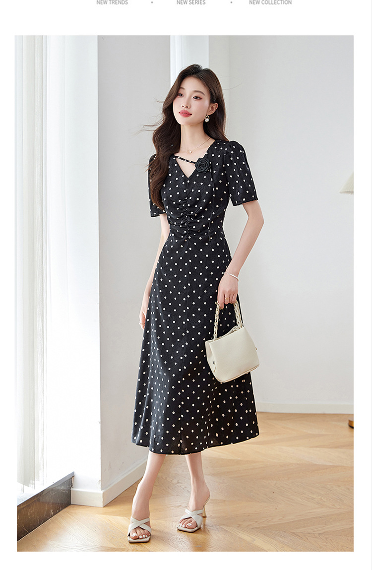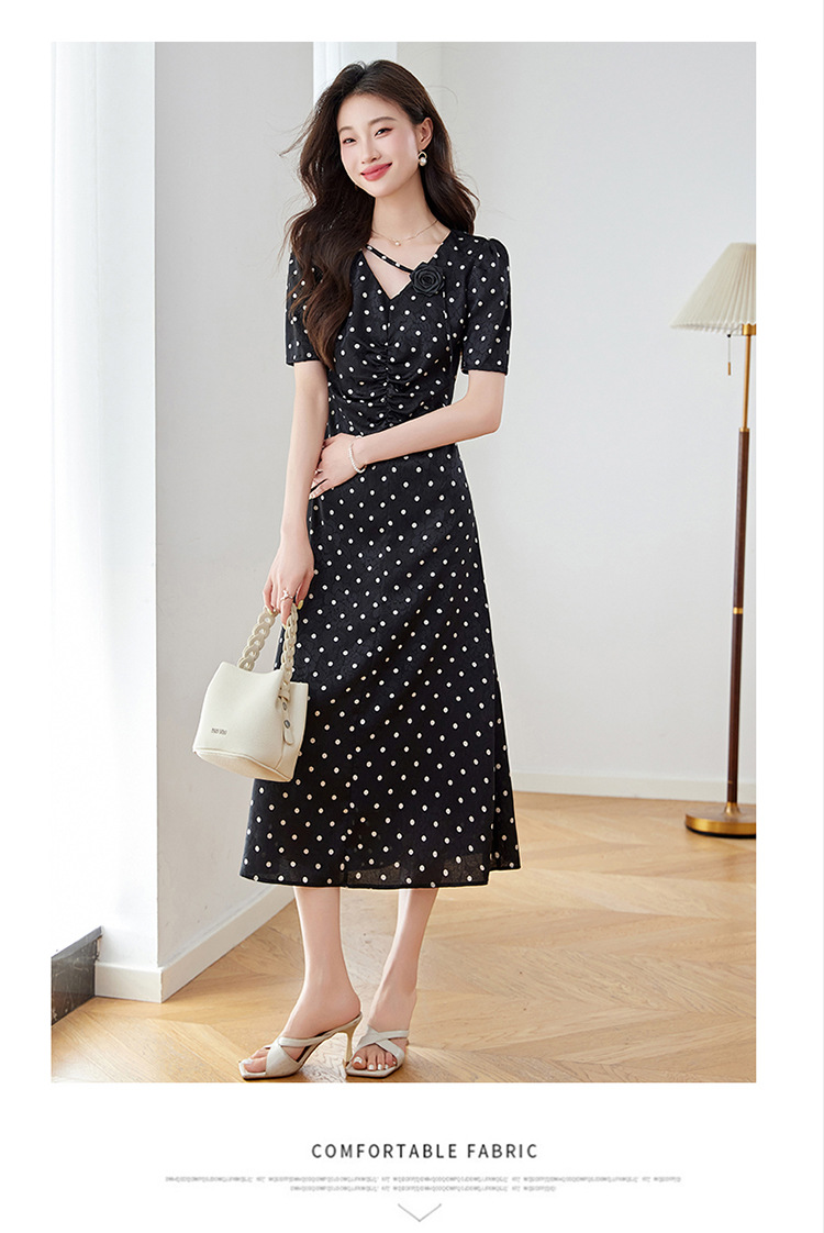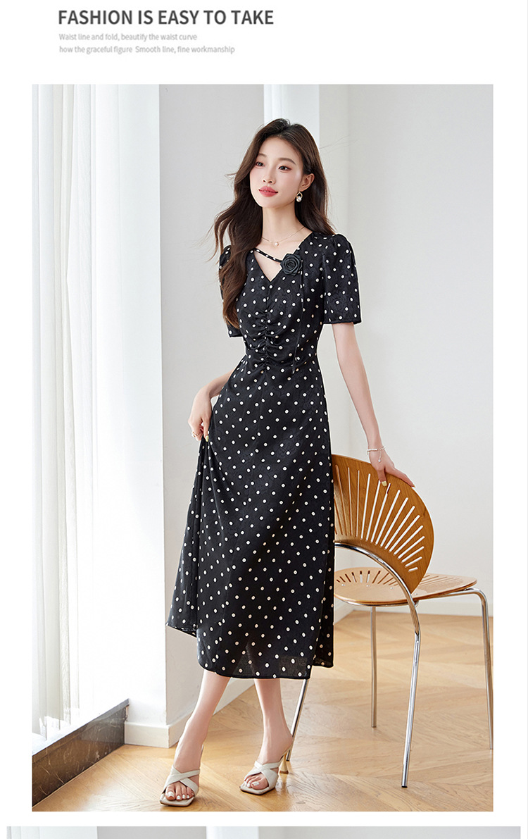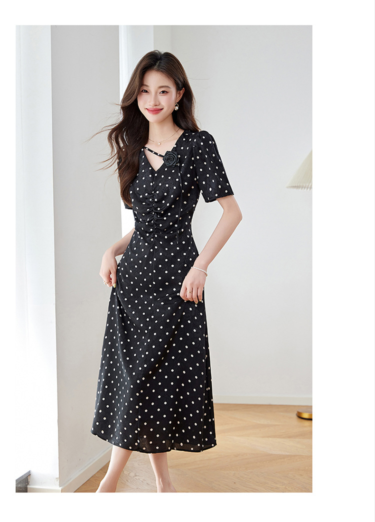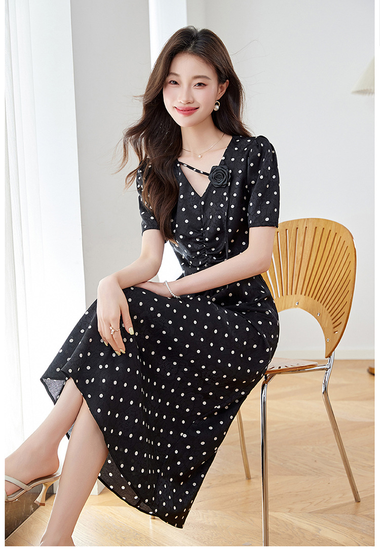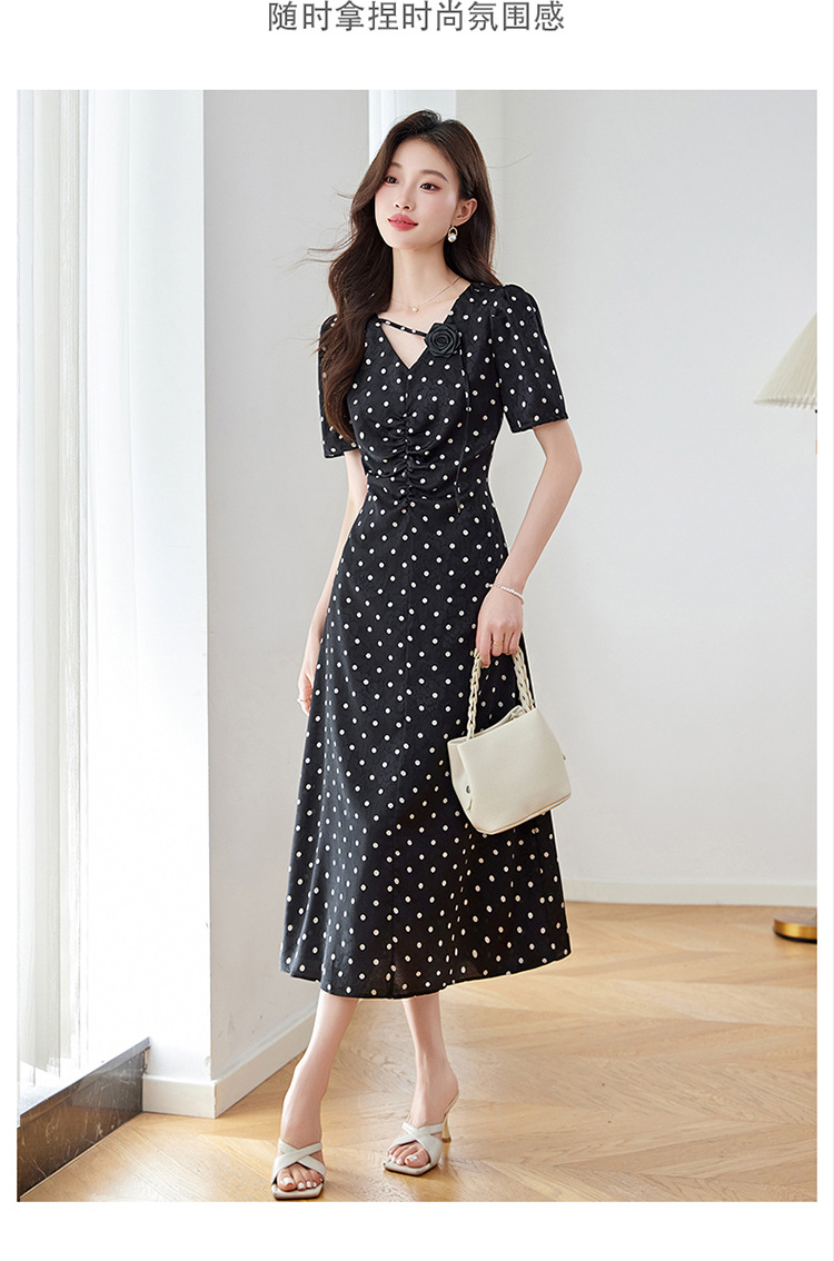 白色波点丝连衣裙,法式收腰显瘦巨好看的显瘦裙子HR-5627