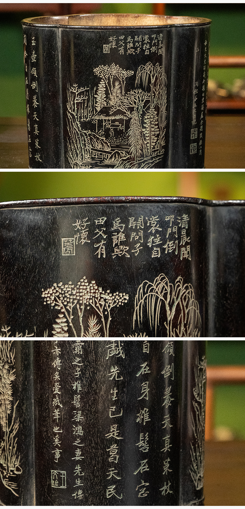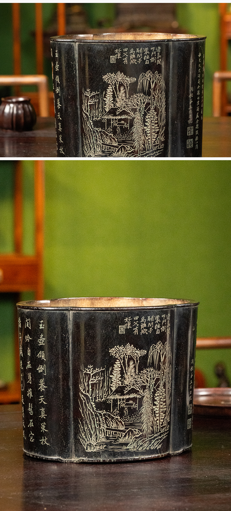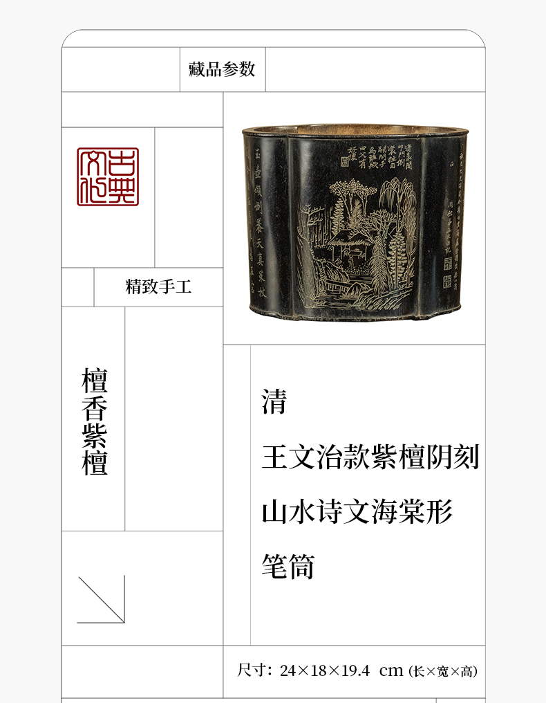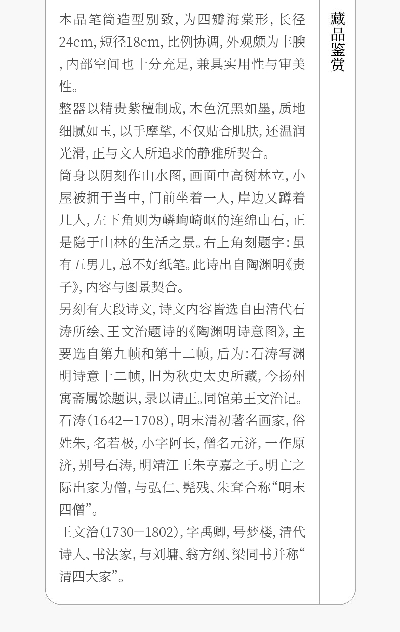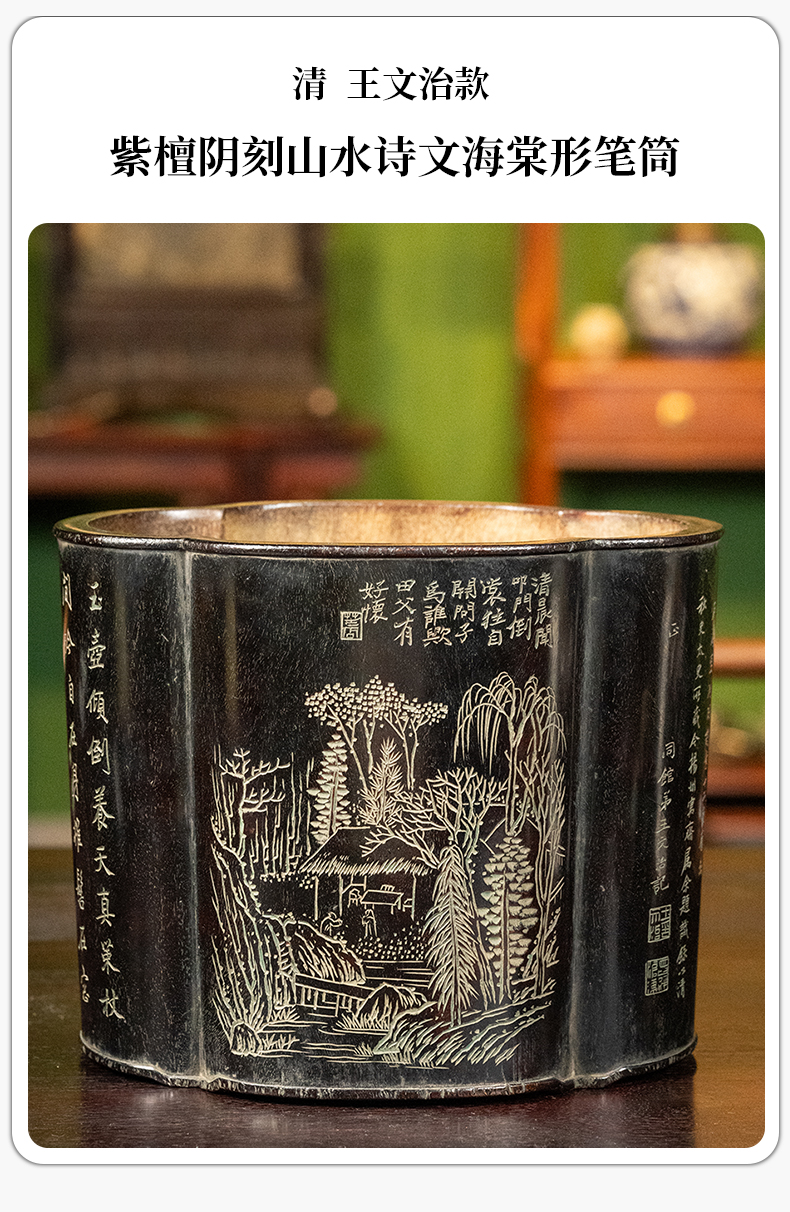 清 王文治款紫檀阴刻山水诗文海棠形笔筒