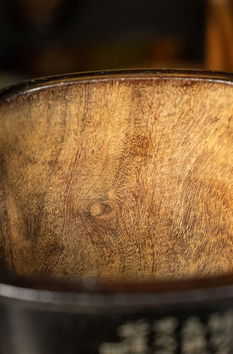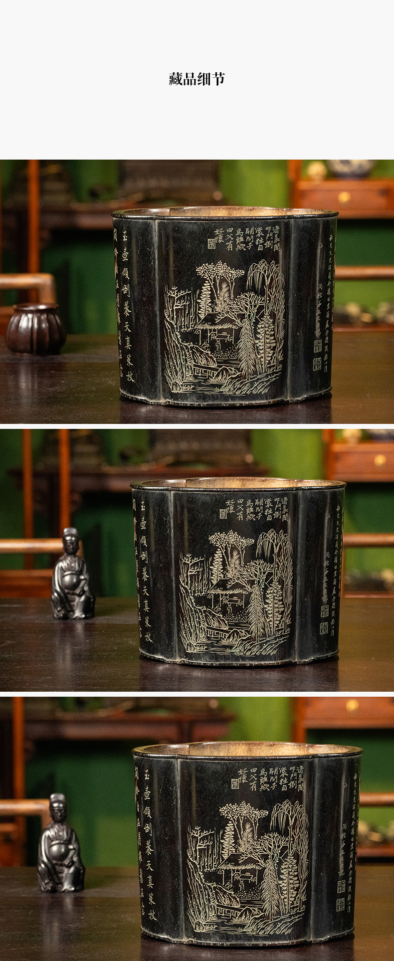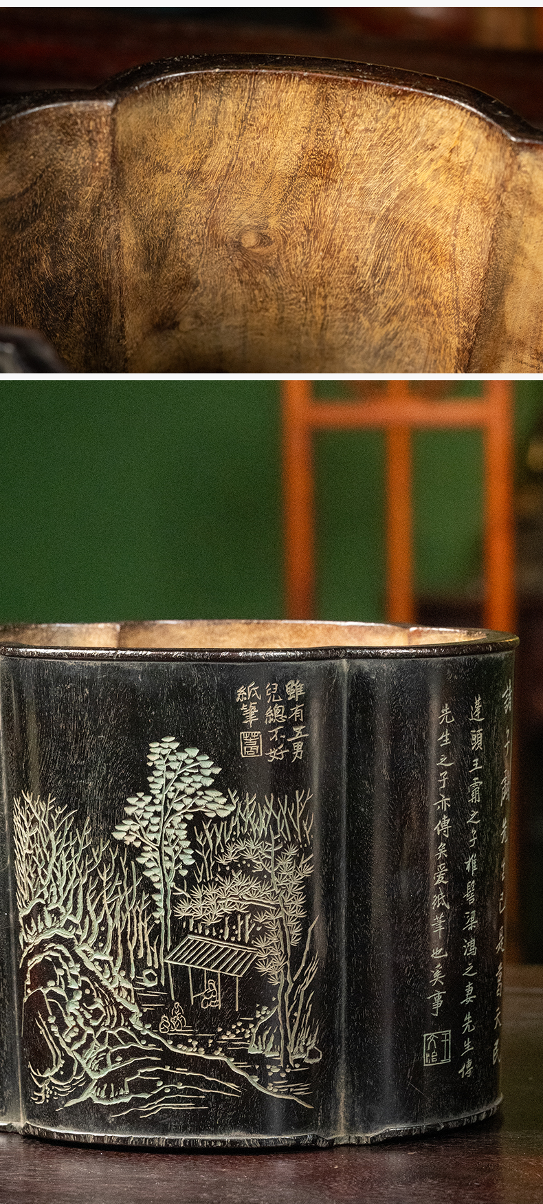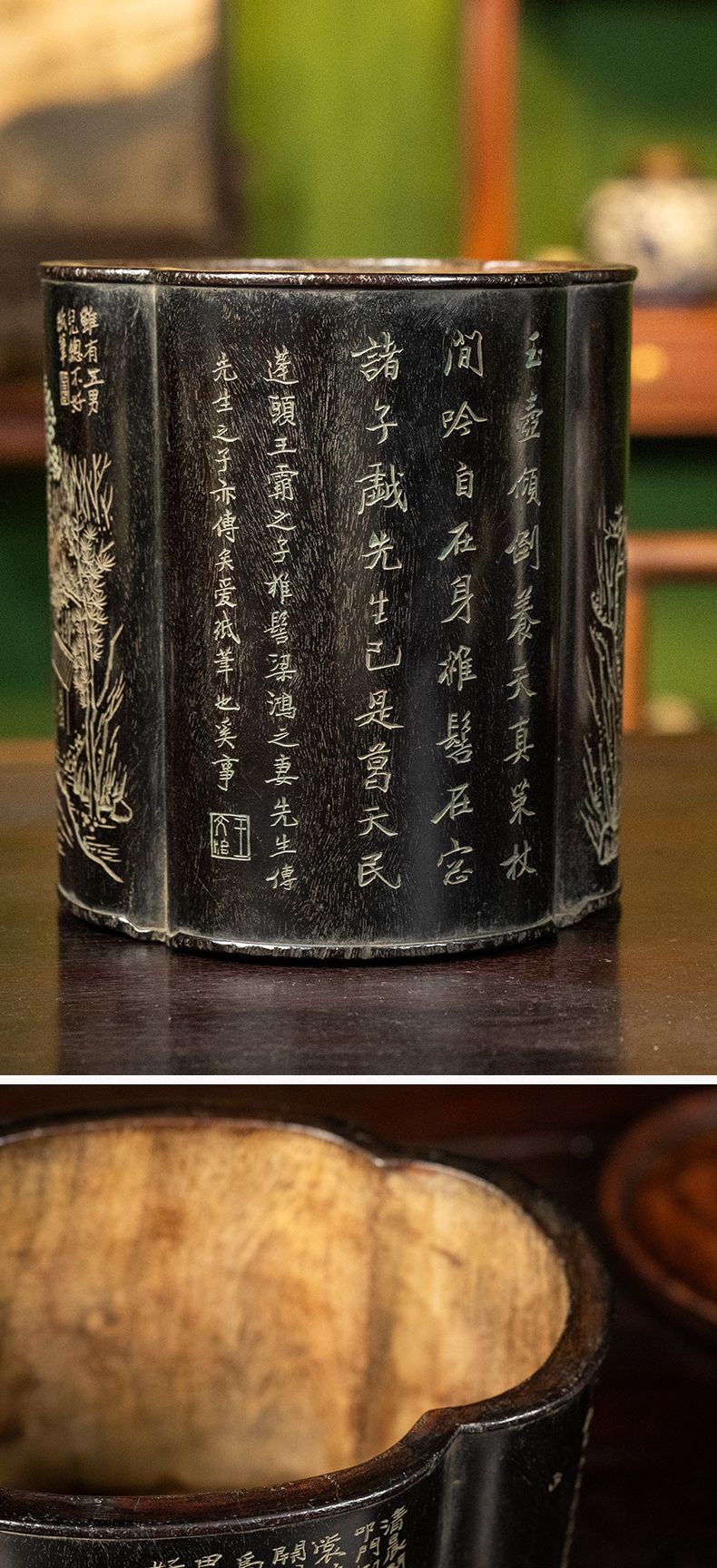 清 王文治款紫檀阴刻山水诗文海棠形笔筒