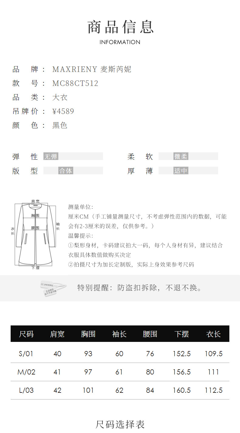 MAXRIENY极简复古感收腰双面呢羊毛大衣长款外套女(货号:MC88CT512)