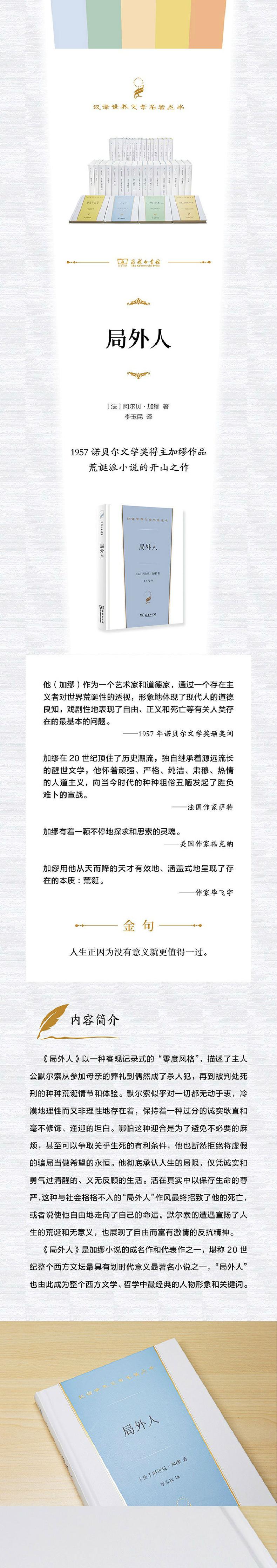 《局外人》是加缪小说的成名作和代表作之一,堪称20世纪整个西方文坛具有划时代意义著名小说之一,“局外人”也由此成为整个西方文学、哲学中典的人物形象和关键词。