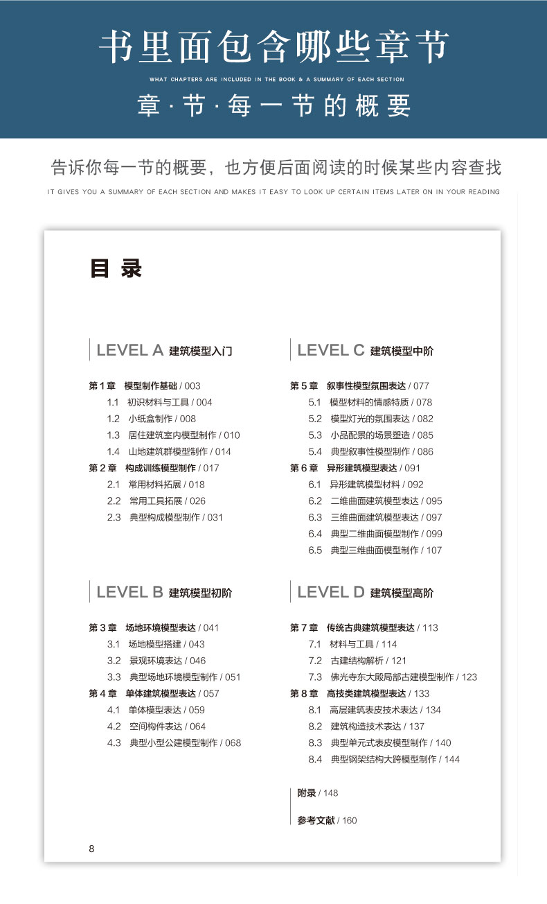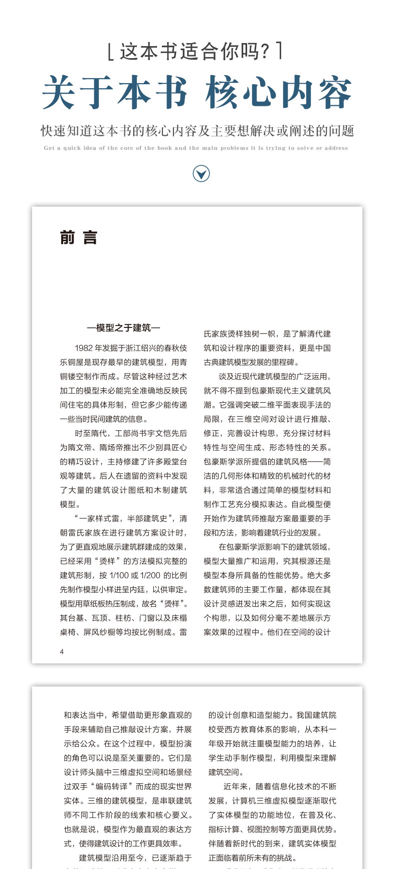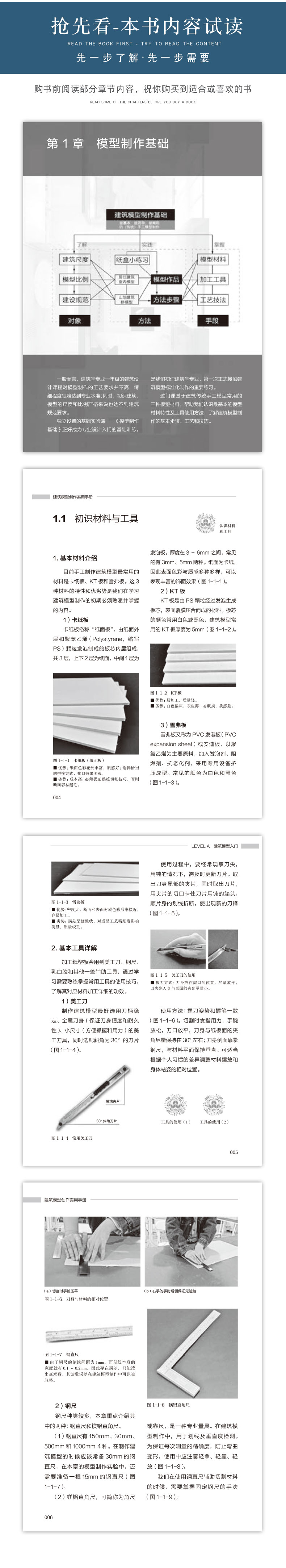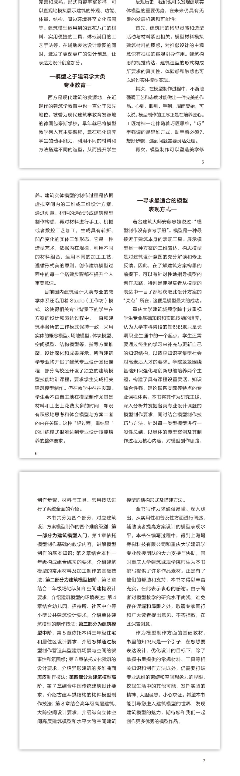 在建筑的形态、空间、功能、环境和文化等设计元素不断丰富的条件下,建筑模型的制作与表达技巧与方法的难度也逐步加深。本书以建筑学专业对模型的制作要求为骨架,拟分为入门、初阶、中阶、高阶四个部分的内容,提供材料、工具、技法和范例等。讲解的重点在于不同类型建筑的模型创作(模拟)思路、材料选择、制作方法等,为每一个重要的设计专题提供3-5个优秀的模型案例作参考。旨在训练和提高读者模型制作的实际操作技能,启发读者发挥模型设计与制作的创造性思维。