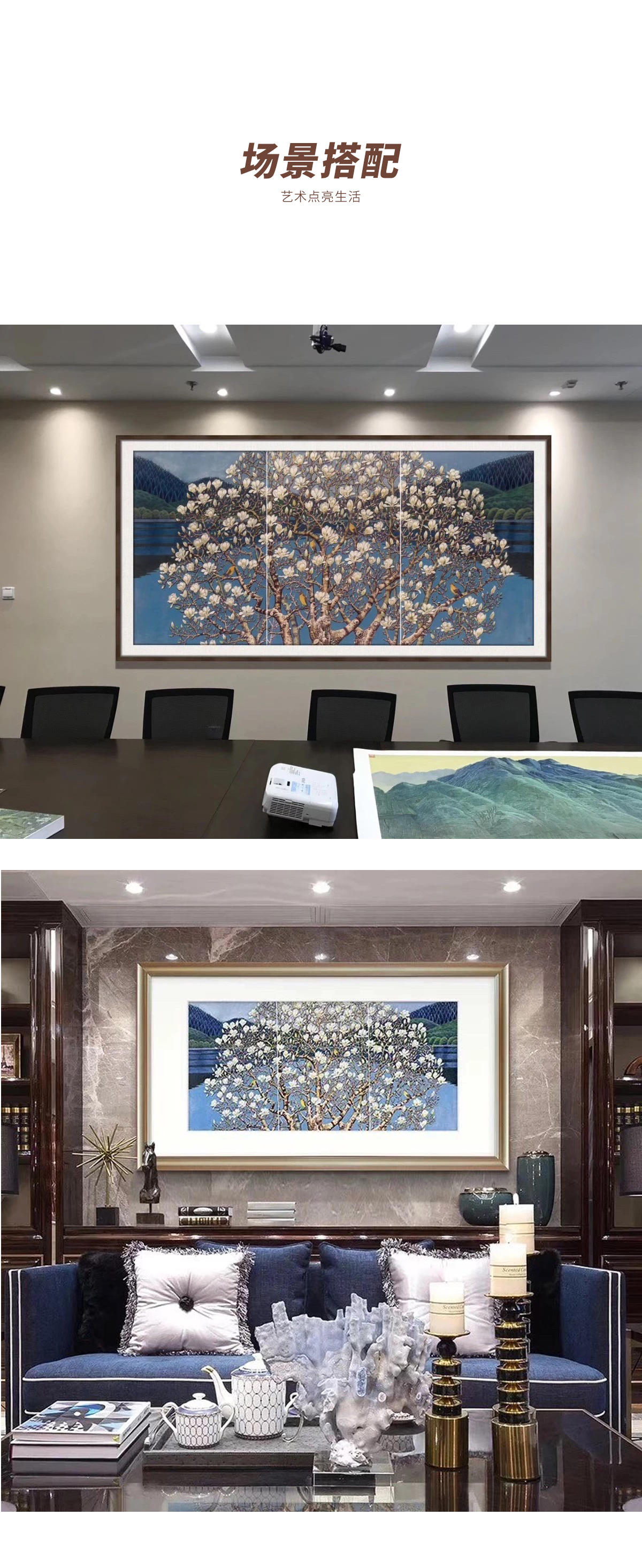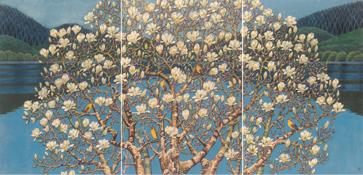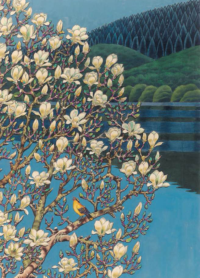 玉兰花皎洁而无暇,温婉而美丽,像极了傲然挺立的谦谦君子。画面中繁花竞放,如满天星斗,笼罩大千世界,几只黄莺隐于花丛,生命卫护了生命。