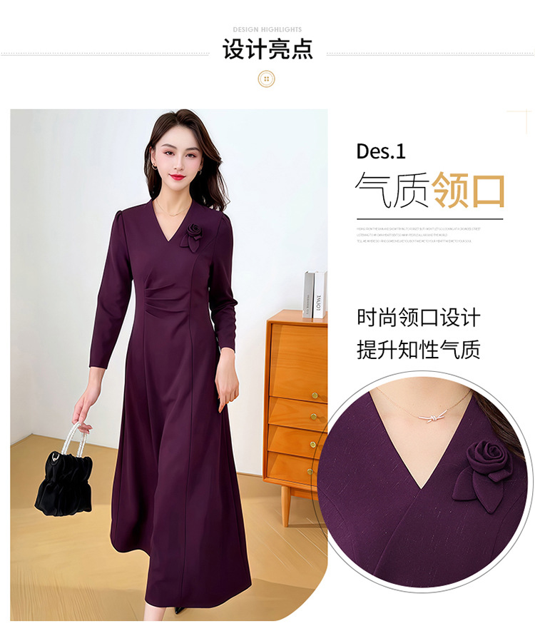 QYMXYKL-26805-Y连衣裙女2025年新款中年妈妈装长袖V领中长款紫色A字裙 商品图2