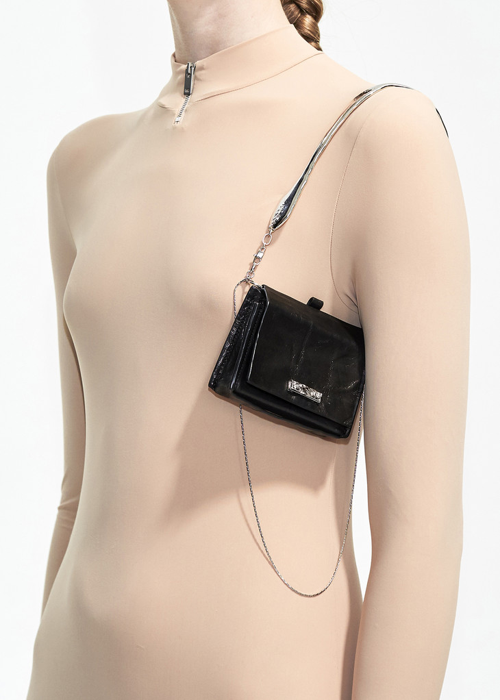 采用特殊工艺于环保金属于熔点液态时自体凝结,制 成带有“呼吸纹理”的不规则线条手柄;搭配皱面牛皮小 包。手柄可拆卸,可以作为提包或肩挎包搭配。尺寸 可放烟盒/女士唇膏等。