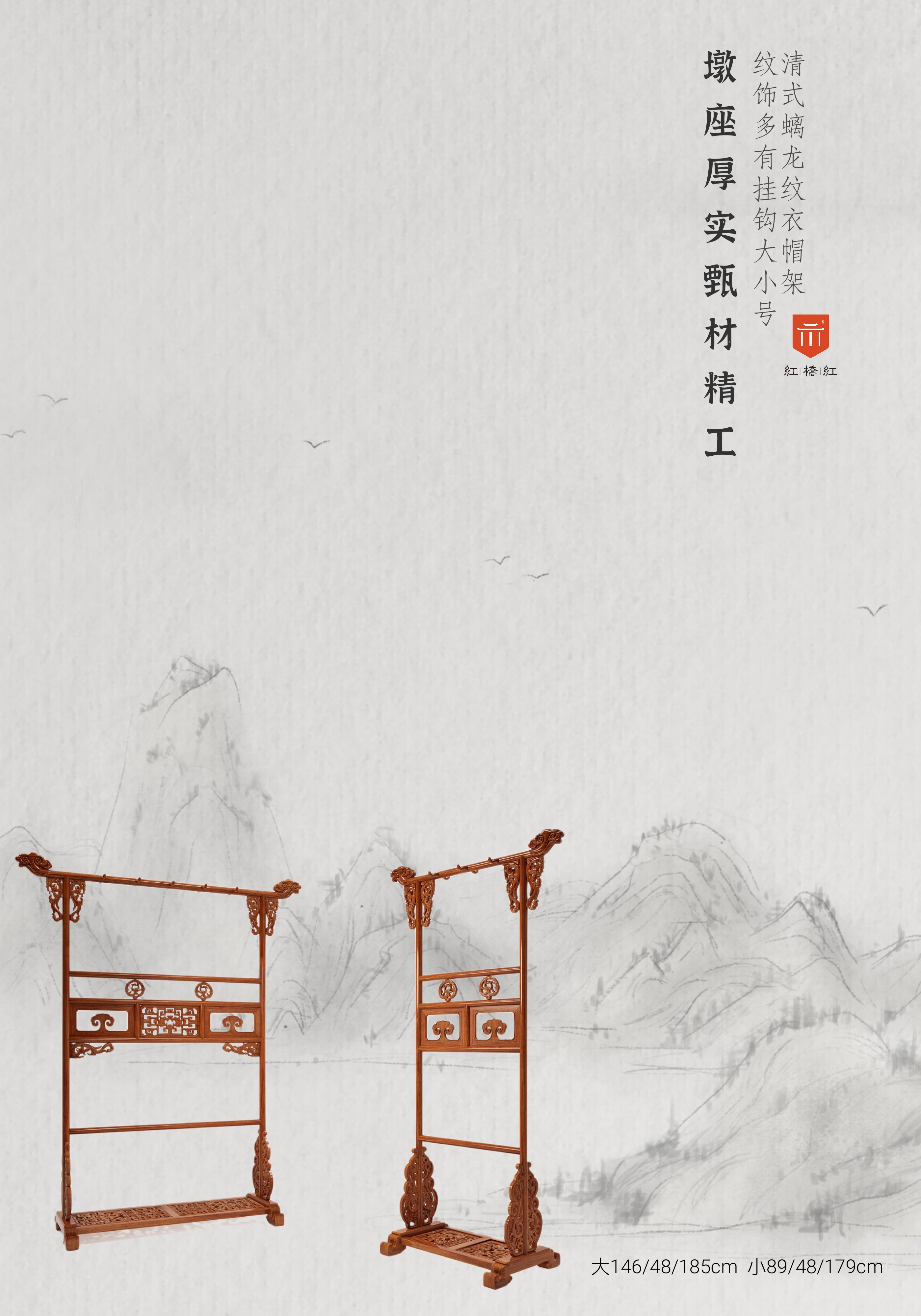 这款清式螭龙衣架,如意云纹至顶部两侧飞天而起,吉祥之意升腾,中牌子镂雕见光,与之呼应,繁中忽简,精美绝伦,各处牙板、卡子等纹饰,均取螭龙纹样,整体装饰统一,威而不严,庄而不重,琳琅相协,墩座厚实稳重,鞋置处加饰回纹,富贵不断,是雕花衣架是代表作品,唯加挂钩以适当代需求。