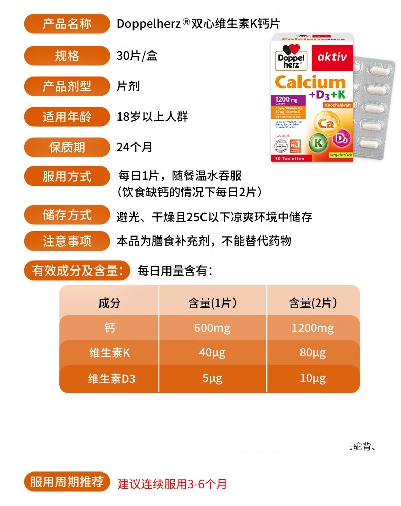 【跨境】德国Doppel herz双心维生素D3+K钙片30片中老青年人进口钙