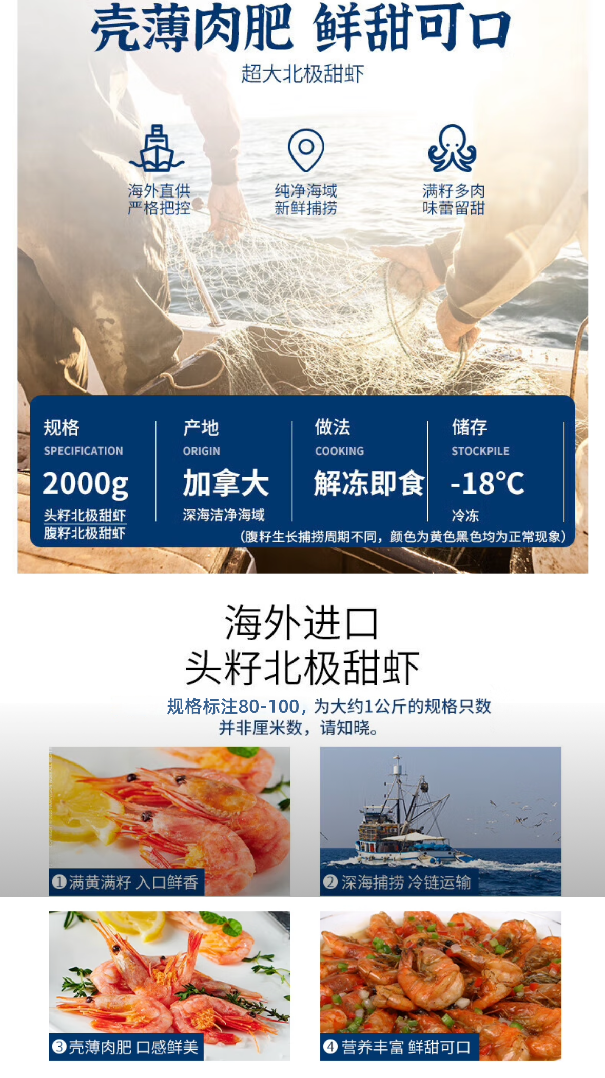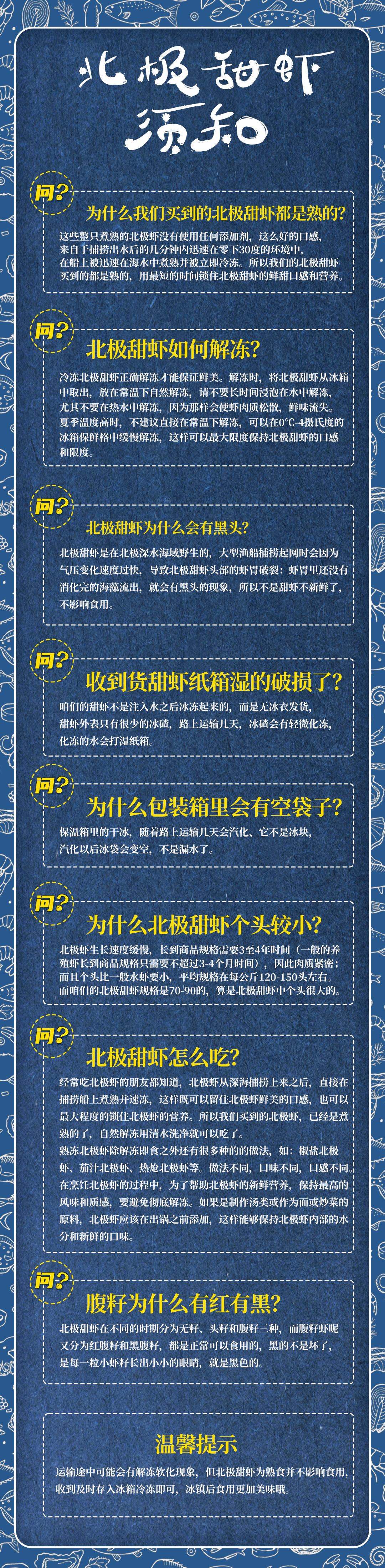 ②北极甜虾在不同的时期分为无籽,头籽(头籽也叫虾膏,已发育但尚未排出的虾卵)和腹籽(受精后的卵,腹籽分红腹籽和黑腹籽)三种。头籽收到后后会存在少量腹籽,属于正常情况,介意者慎拍。如遇大比例腹籽,拍照联系客户反馈处理。