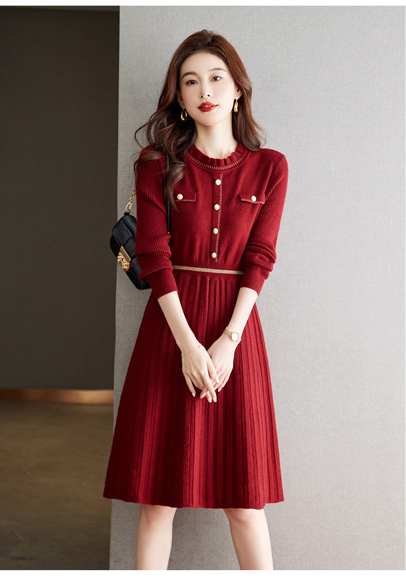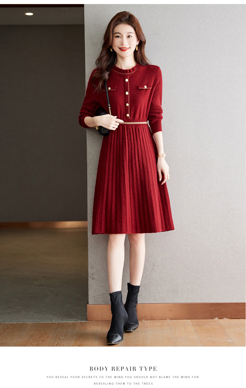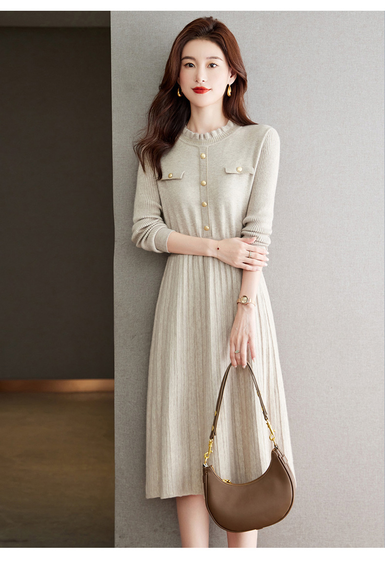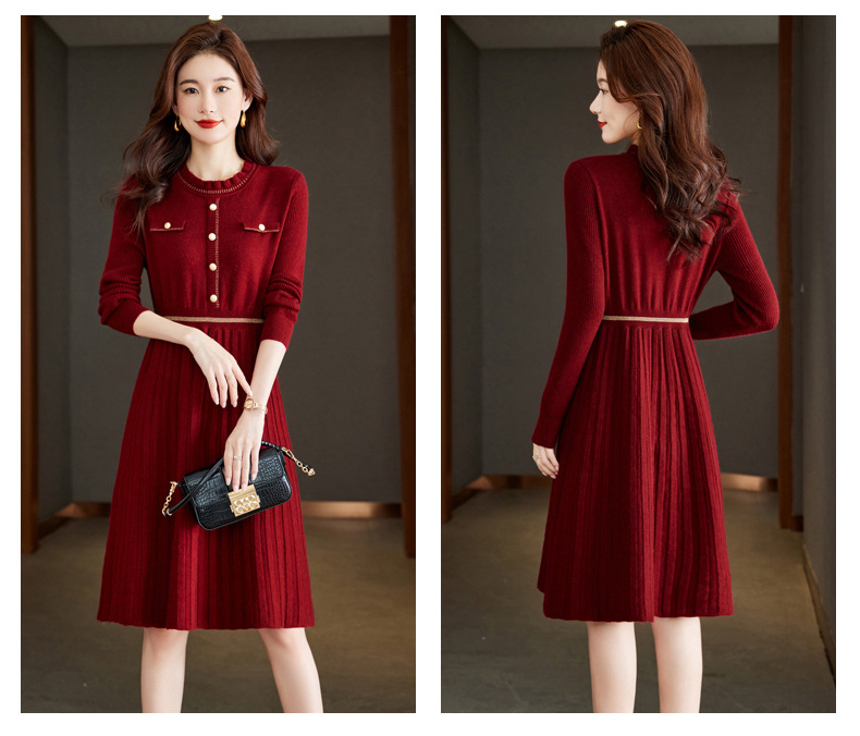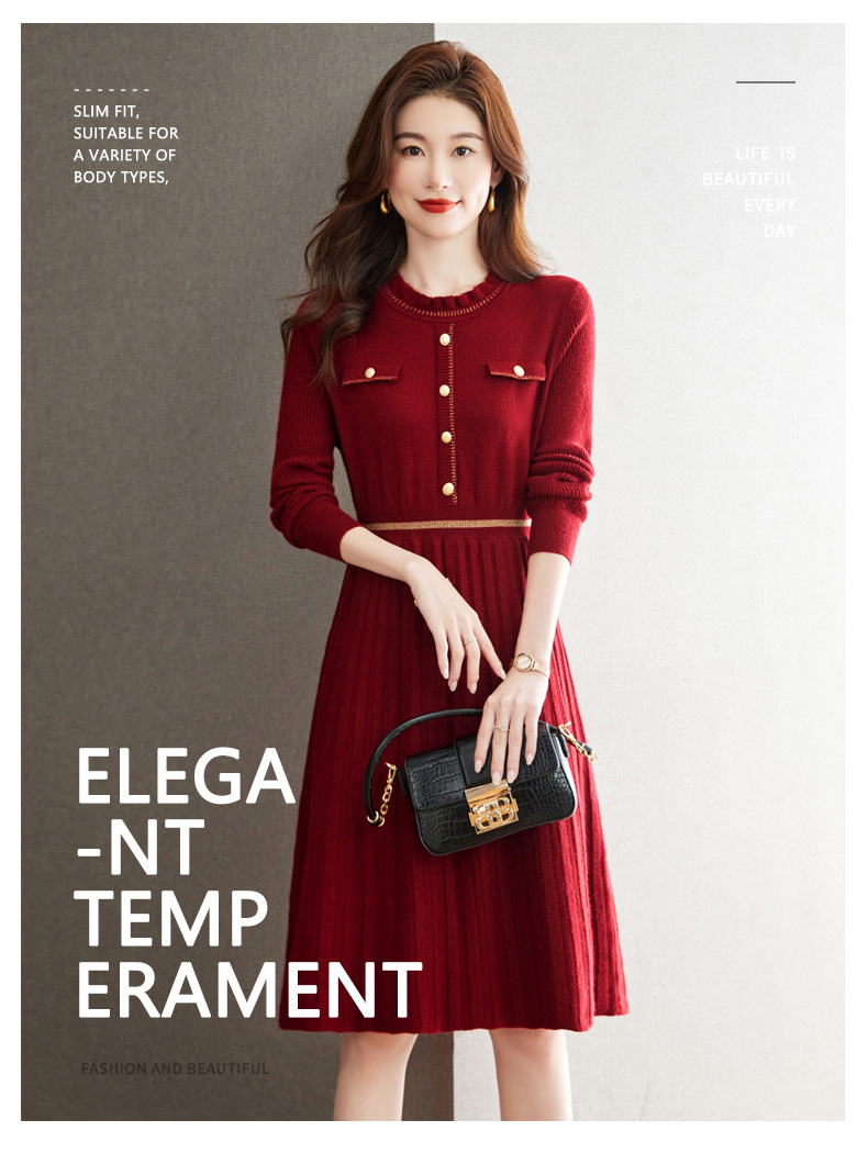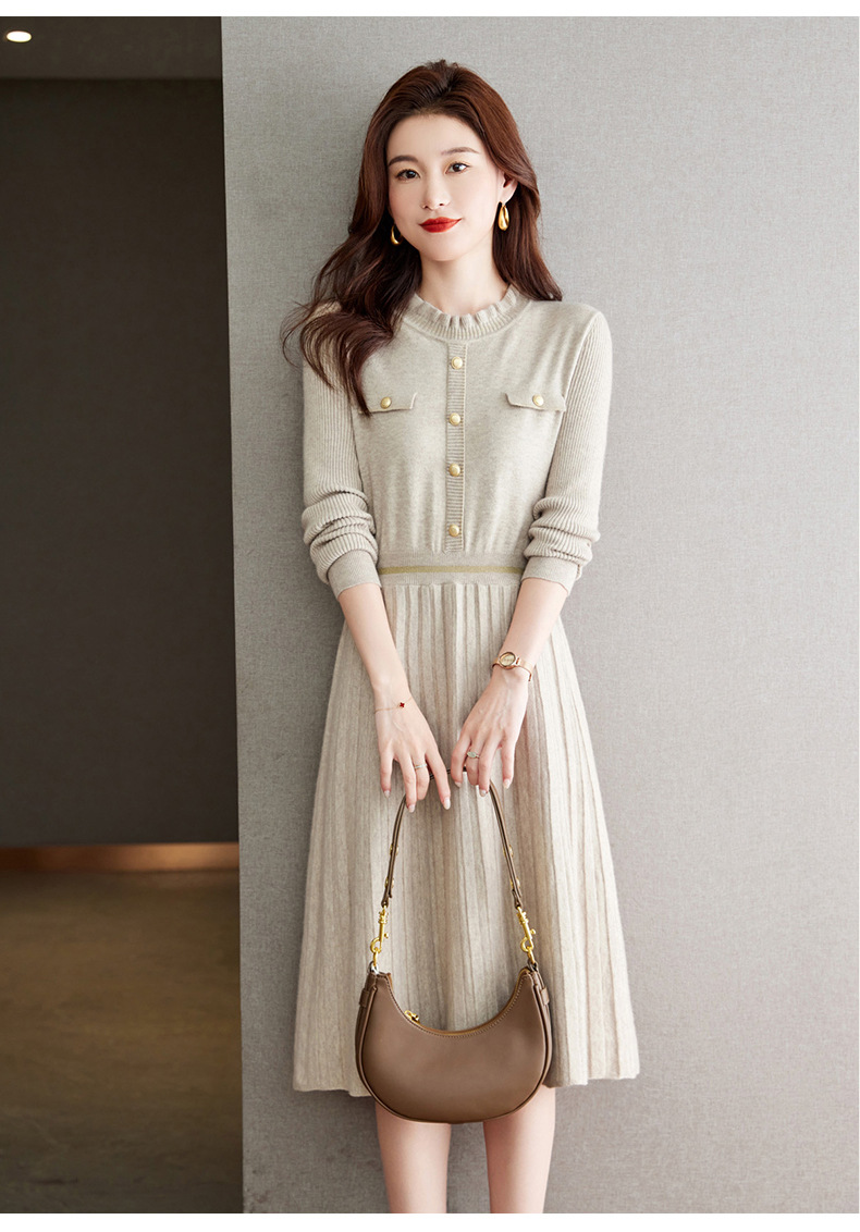 雀说木耳领百褶毛衣裙女打底衫女减龄长款针织连衣裙AL6772