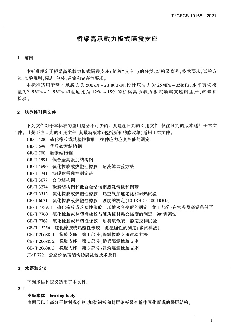 书名:桥梁高承载力板式隔震支座(T/CECS 10155—2021)