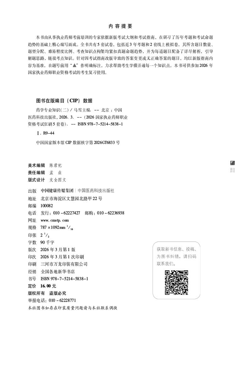 2026国家执业药师职业资格考试狂刷5套卷 药学专业知识(二) 马雪 3年考题精析卷+2套模拟机考卷 9787521458381中国医药科技出版社