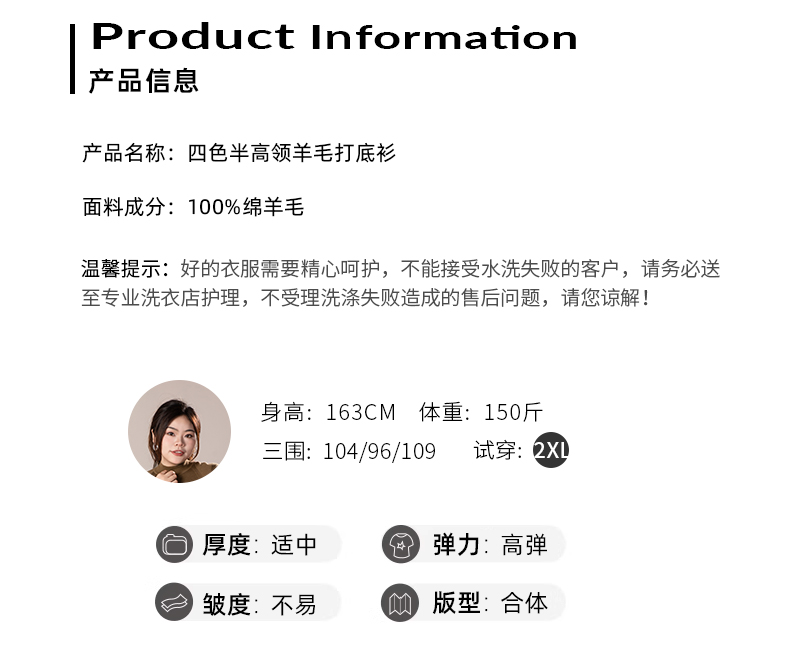 【纯色羊毛打底衫】 高弹保暖 奢侈品牌同款扬子纱线 半高领舒适轻盈 隐形腰节线遮肉显瘦~