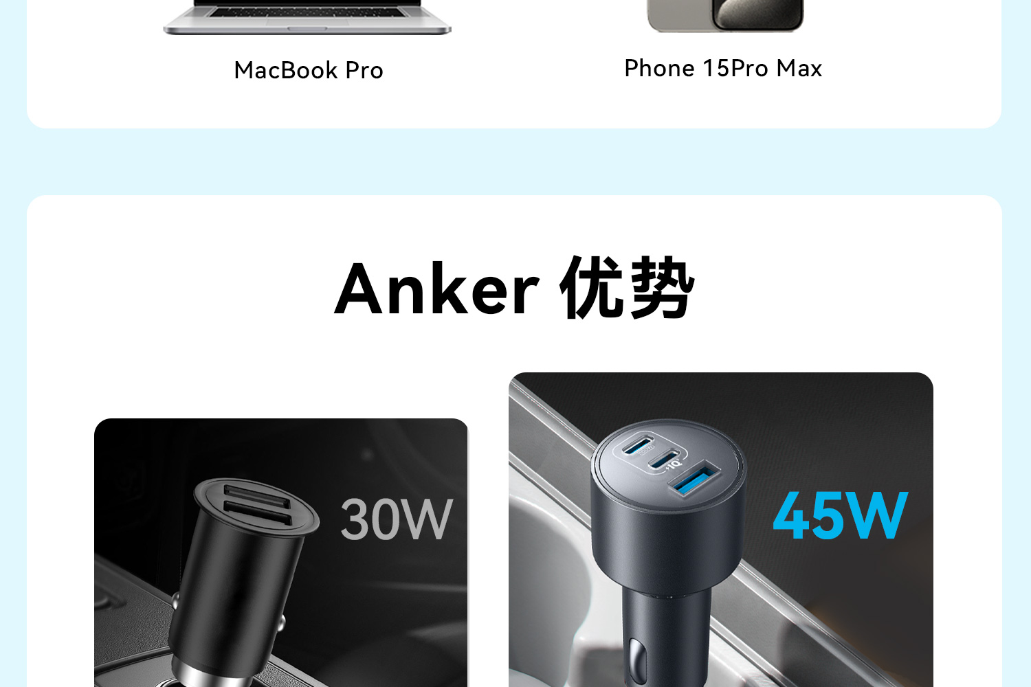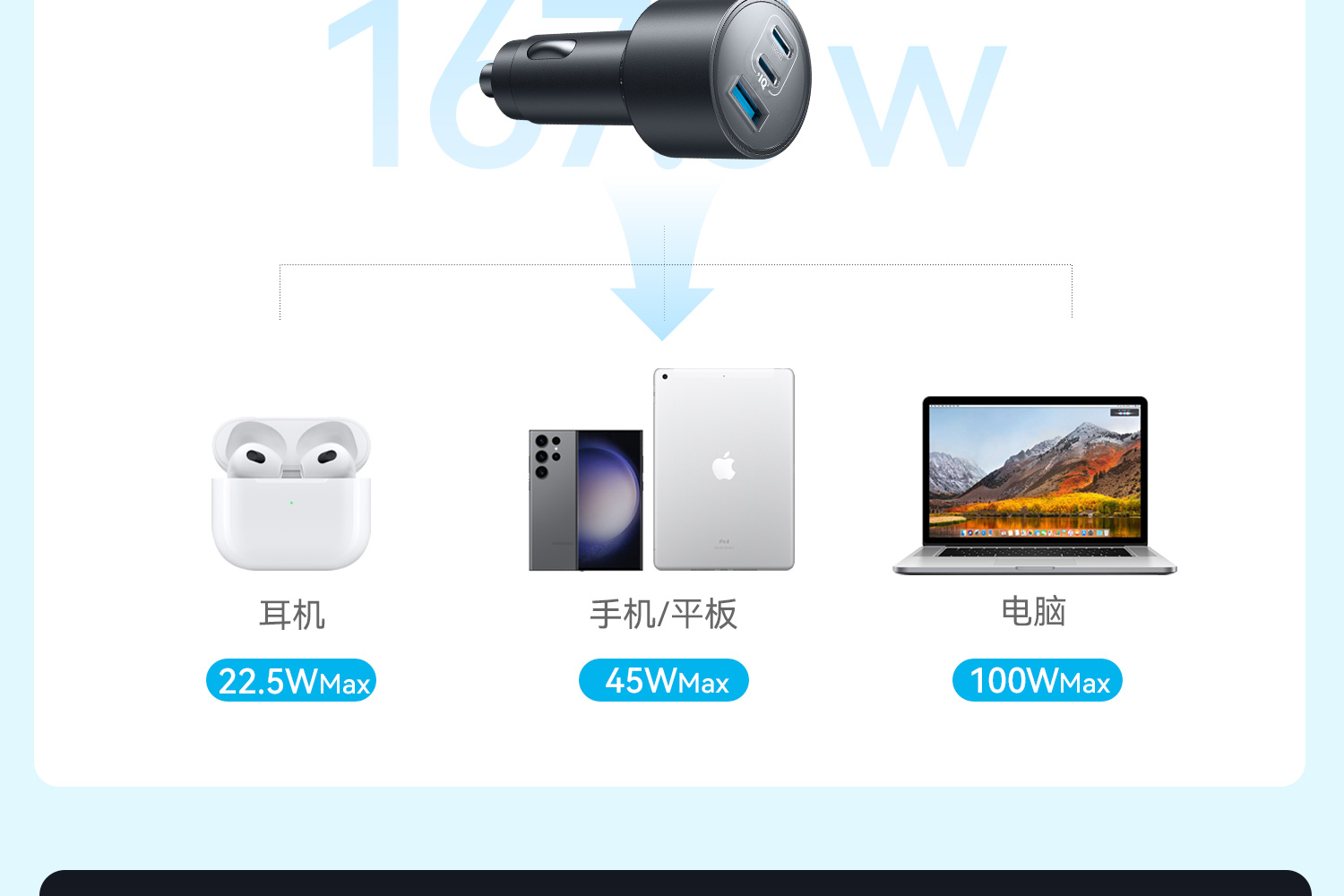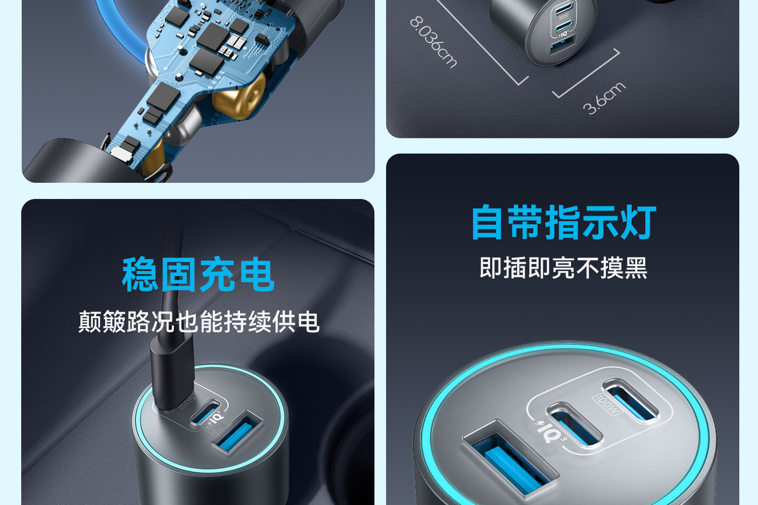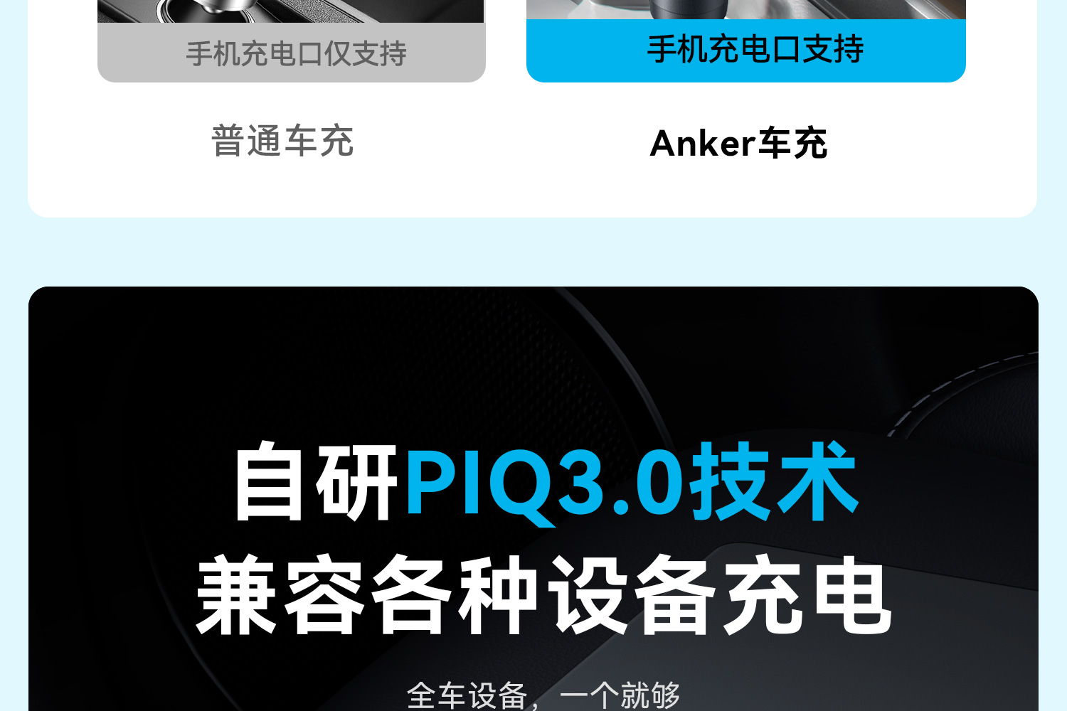 【热销】Anker安克167.5W车载充电器三口车充高效散热智能兼容多设备2C1A车载充电器 A2737