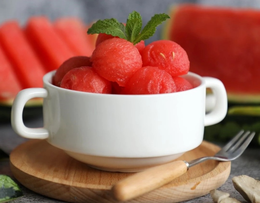 果面底色翠绿着色偏淡,其表面均匀覆盖有深,墨绿条纹,果面无棱沟,平整光滑,果肉粉红色肉质相对较紧实,口感甘甜,
