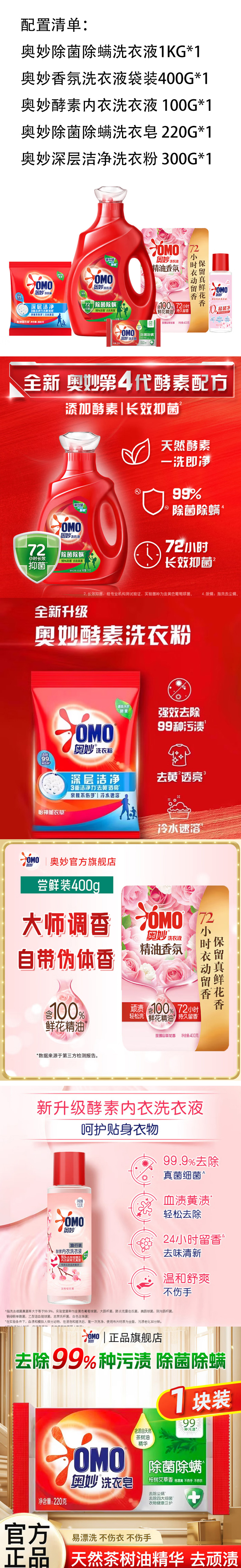 奥妙(OMO)洗衣液家庭5件套组合大礼包(1kg洗衣液+400g袋装洗衣液+内衣洗衣液100g+洗衣皂220g+洗衣粉300g)