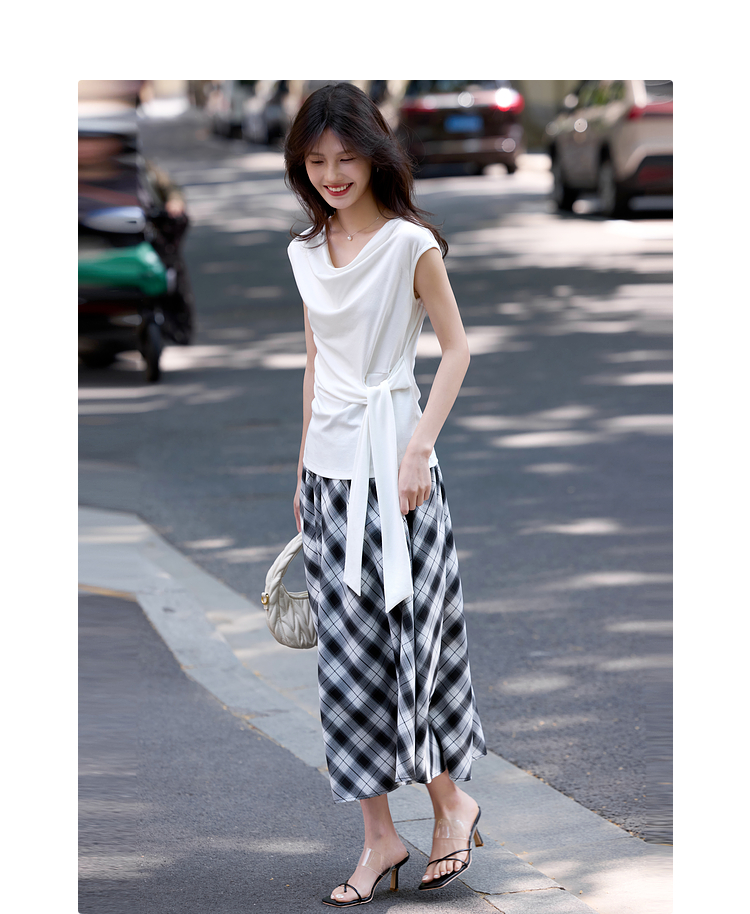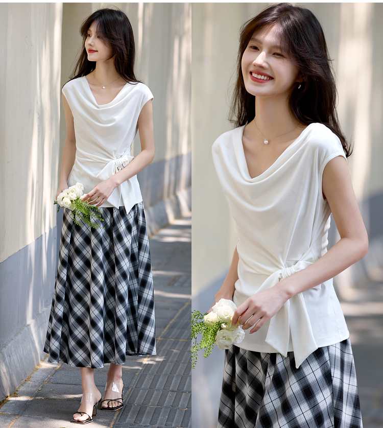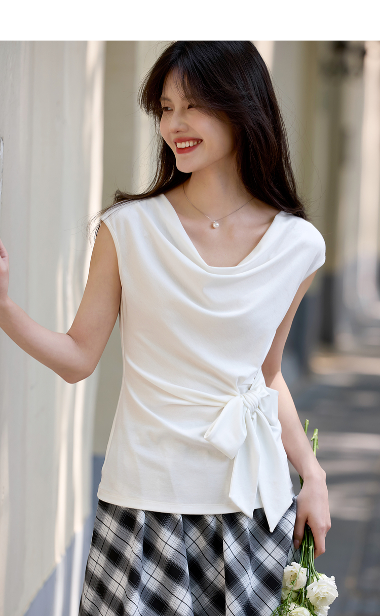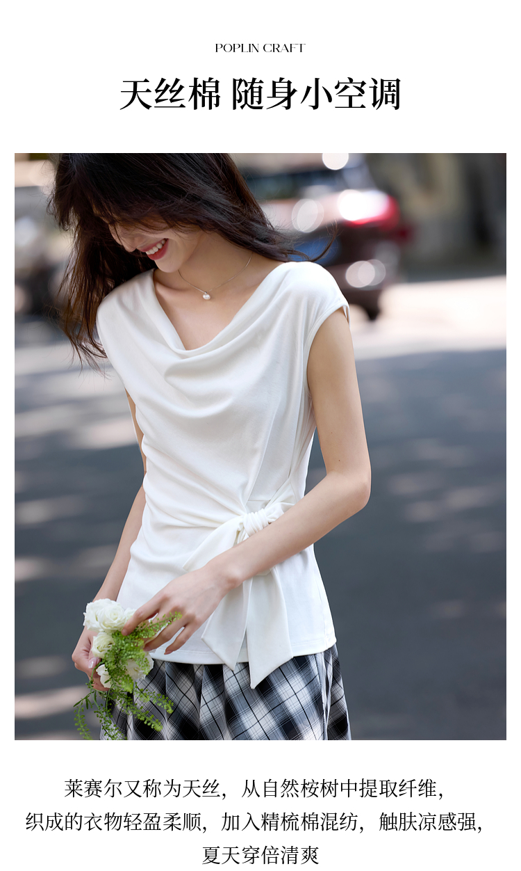 【07/09新品】熙世界一字肩荡领短袖T恤女收腰显瘦夏季设计感气质系带卡腰上衣
