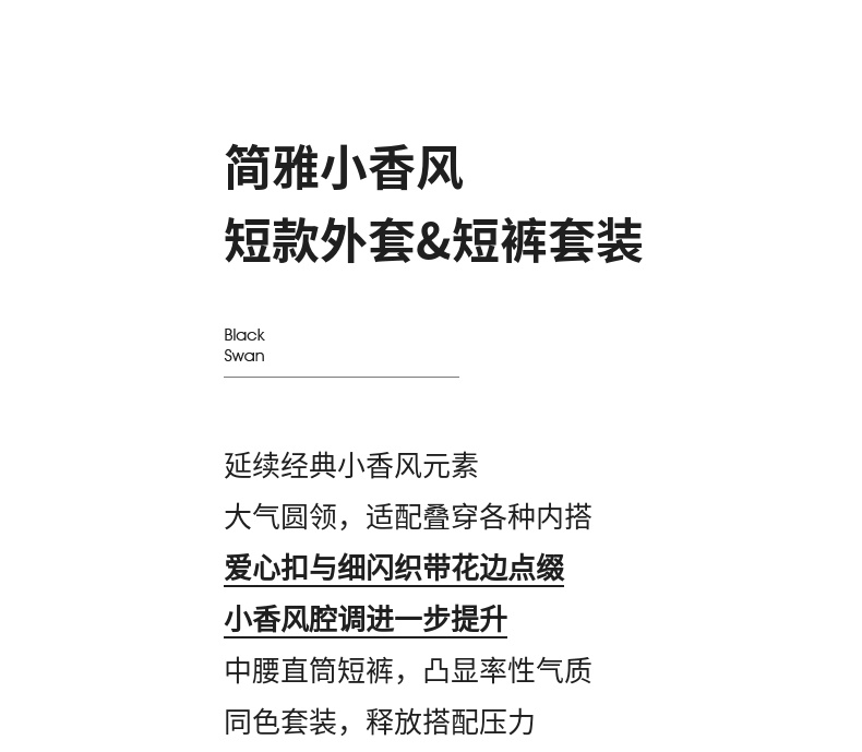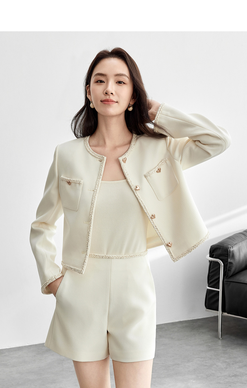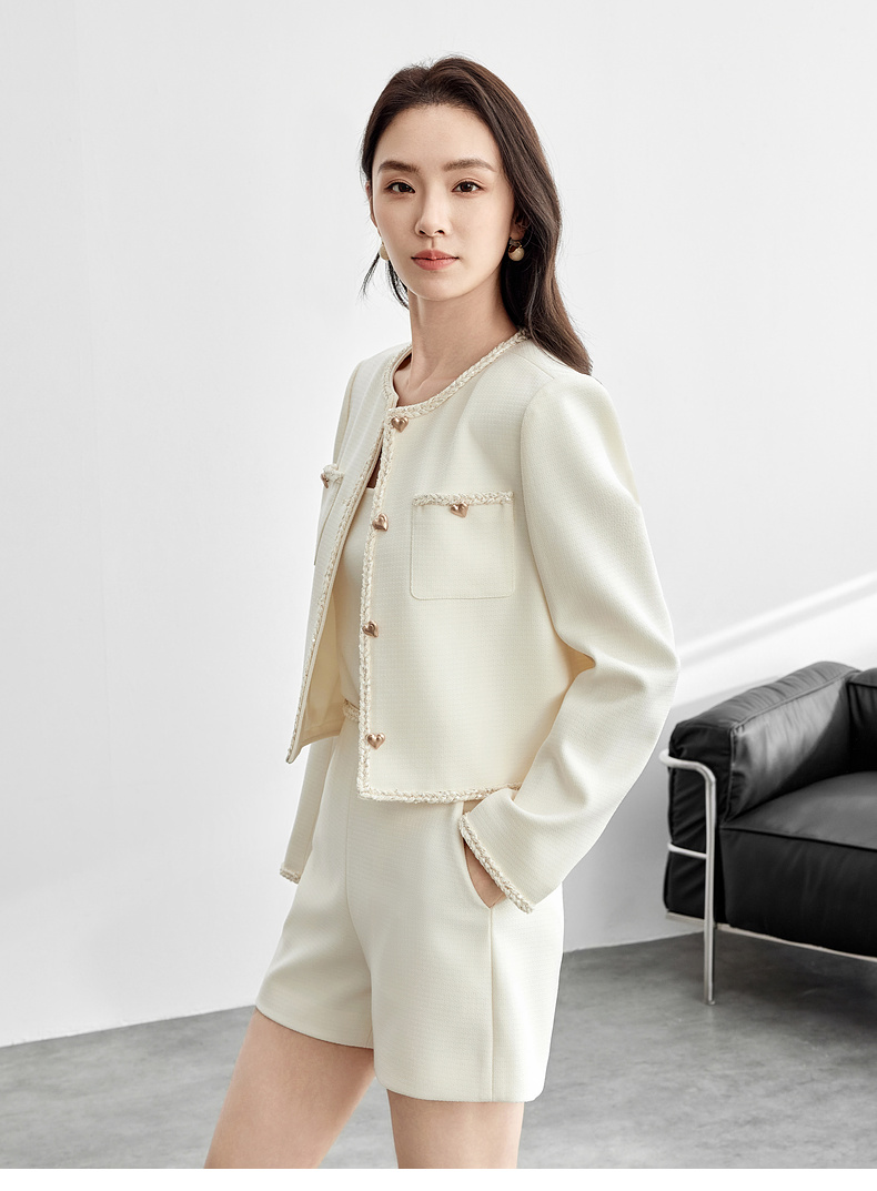 【内购】【简雅小香风】粗花呢撞色爱心扣圆领垫肩短款外套中腰短裤套装-151Z58311
