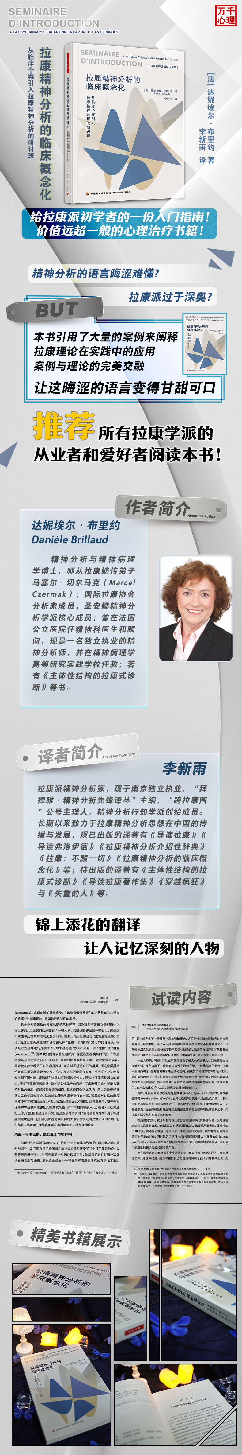 拉康精神分析在法国乃至全球的心理学领域都有着重要的影响力。本书作者达妮埃尔·布里约(Danièle Brillaud)曾是拉康的嫡传弟子马赛尔·切尔马克的学生。在切尔马克的建议下,布里约女士提议举办了“拉康精神分析入门研讨班”,而这个研讨班正是本书的缘 起。本书就像一门介绍性教程一样,为拉康学派的学生和初学者提供了一个清晰且详细的入门指南。 本书从一些临床案例出发(正如本书各章标题所呈现的那样,每章都有一个或几个主要案例),然后反复穿梭于临床与理论之间,以表明二者的运作缺一不可。因为“我们需要精神分析的理论来阅读那些临床图景,但也恰恰是从这些临床图景出发,精神分析的理论才得 以被制作出来”。 书里也包含了对拉康《著作集》文本的临床解读。作者遵循拉康将精神结构划分作精神病、神经症和性倒错的经典三分,所以在选择案例的时候尽量涵盖了这三个领域,并结合特定的理论视角来看每个案例所能够突显出来的东西......