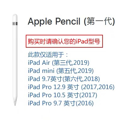 Apple Pencil第一代适用于:iPad Air (第三代,2019)/iPad mini (第五代,2019)/iPad (第六代,2018)/iPad Pro 12.9 英寸 (第二代)/iPad Pro 12.9 英寸 (第一代)/iPad Pro 10.5 英寸/iPad Pro 9.7 英寸