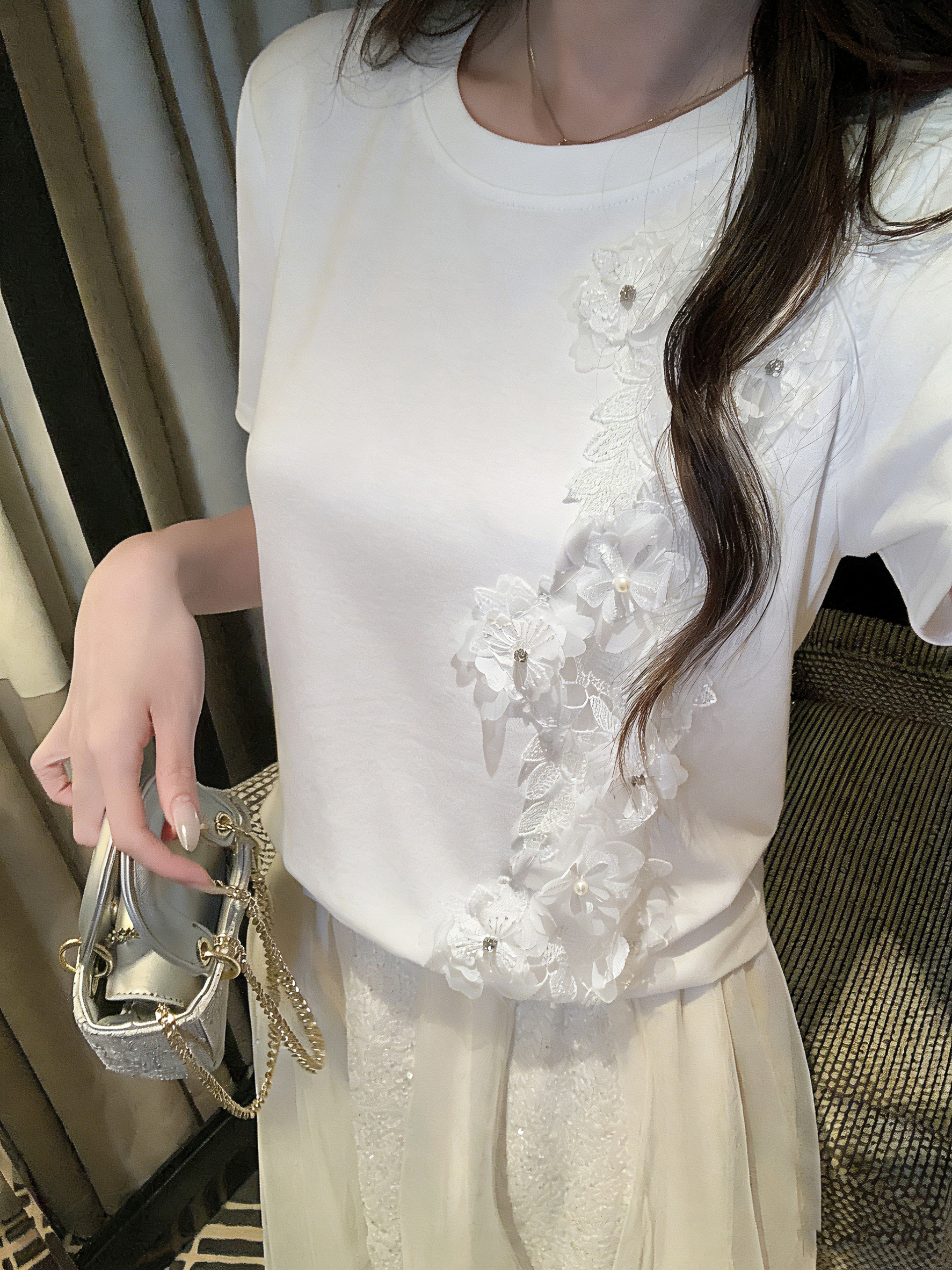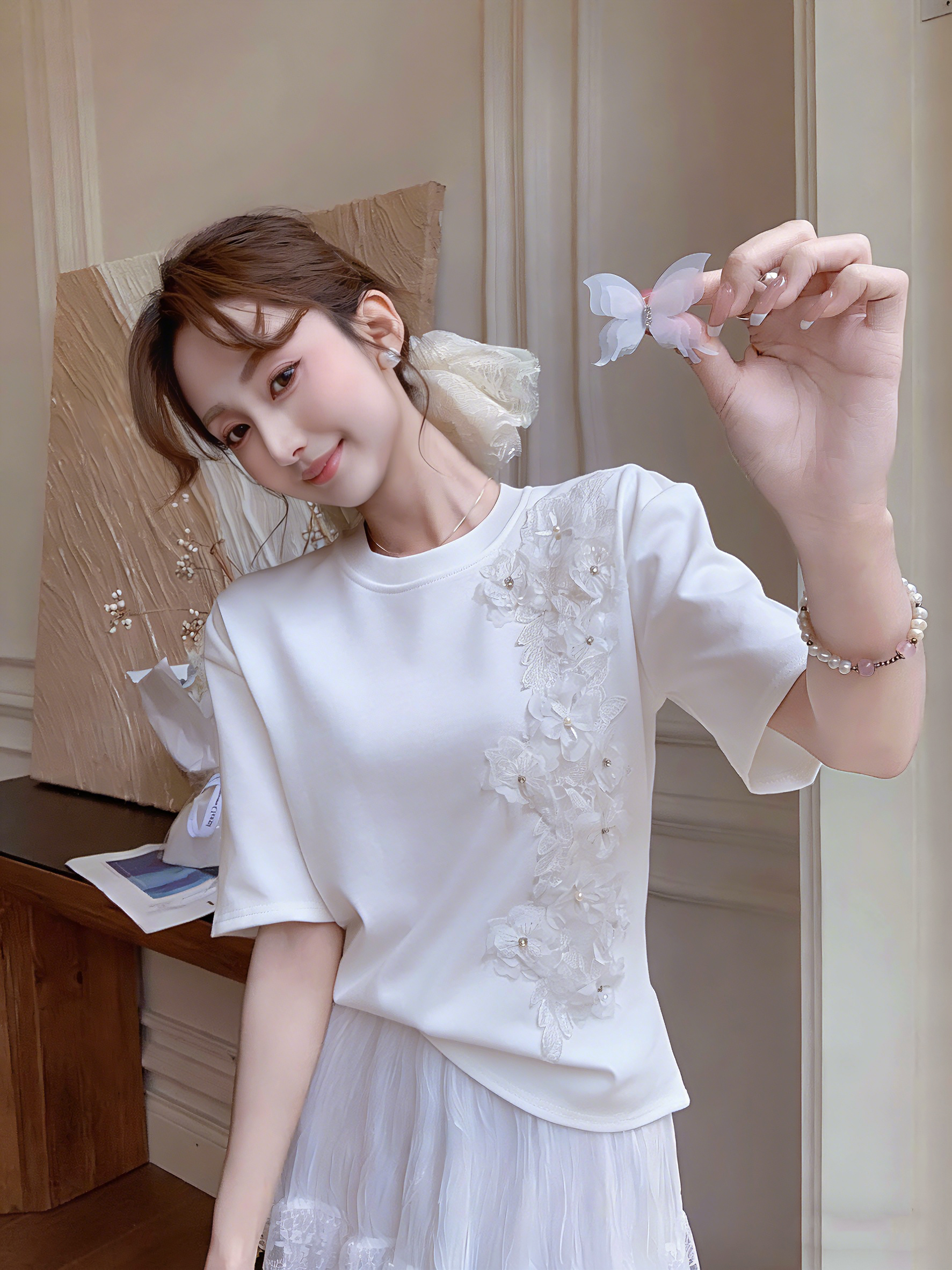张心子【简易舒适区】圆领立体花小众设计T恤上衣 U2603003