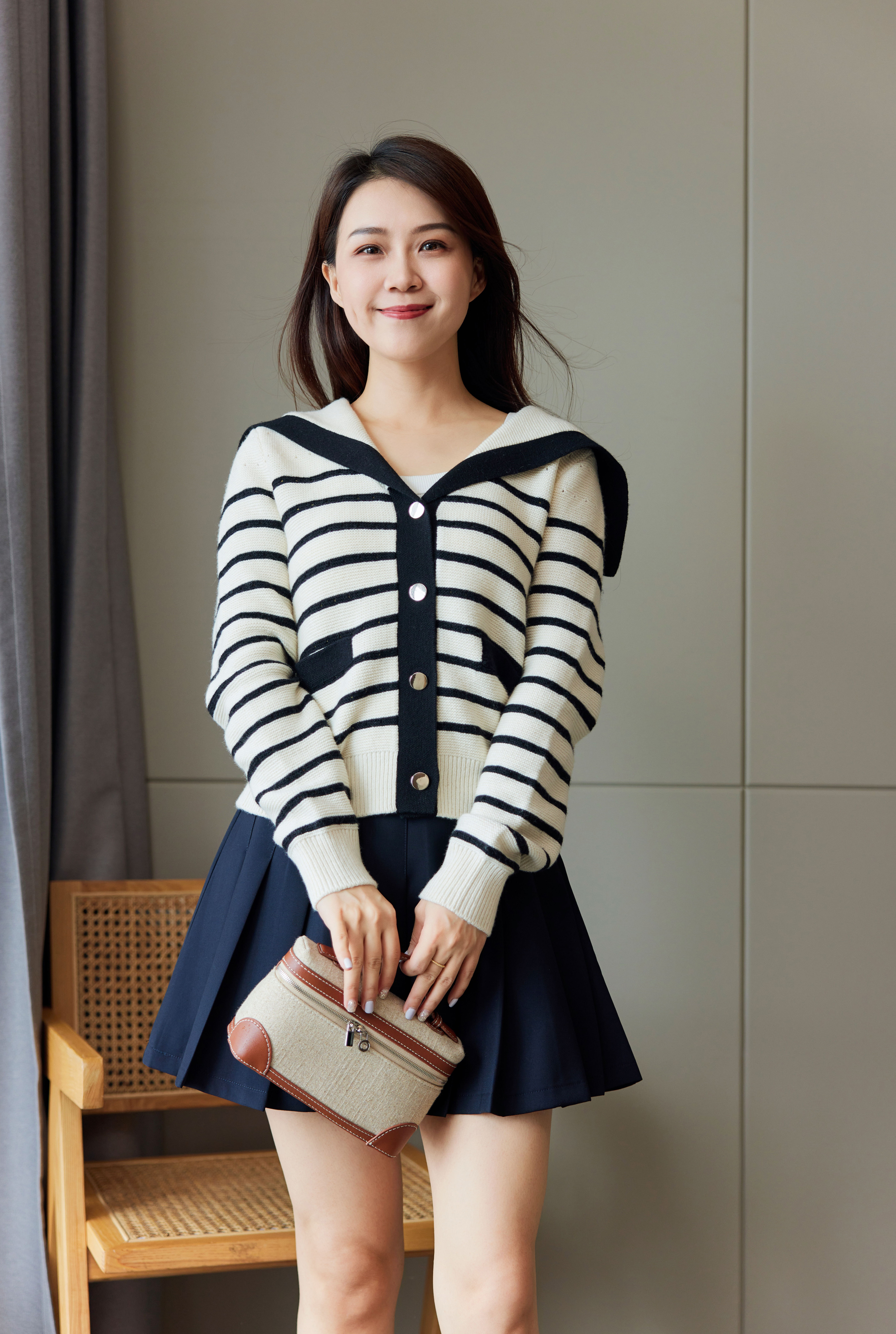 海军领拼条镂空羊毛衫