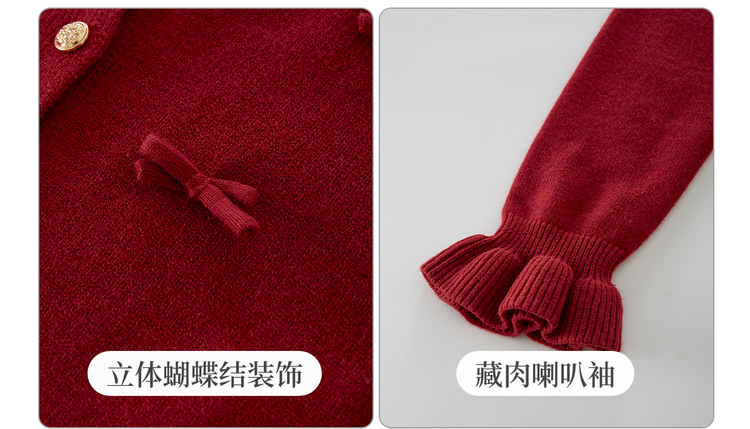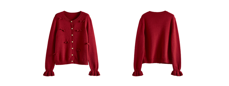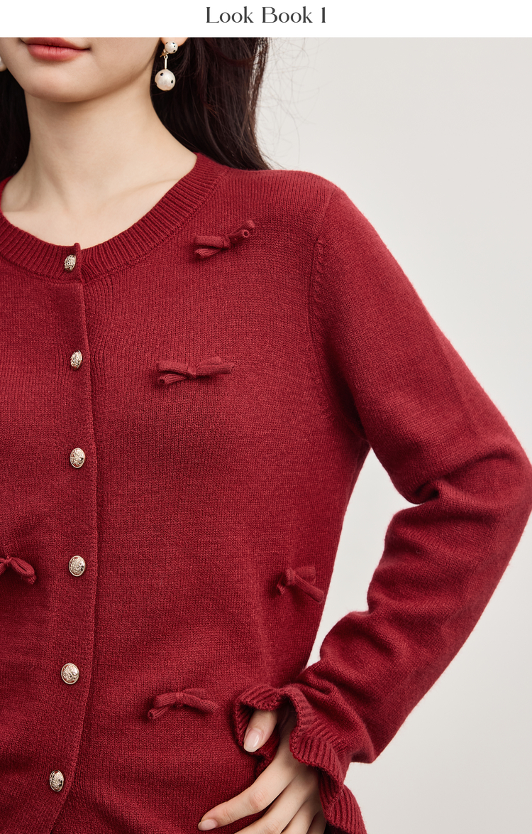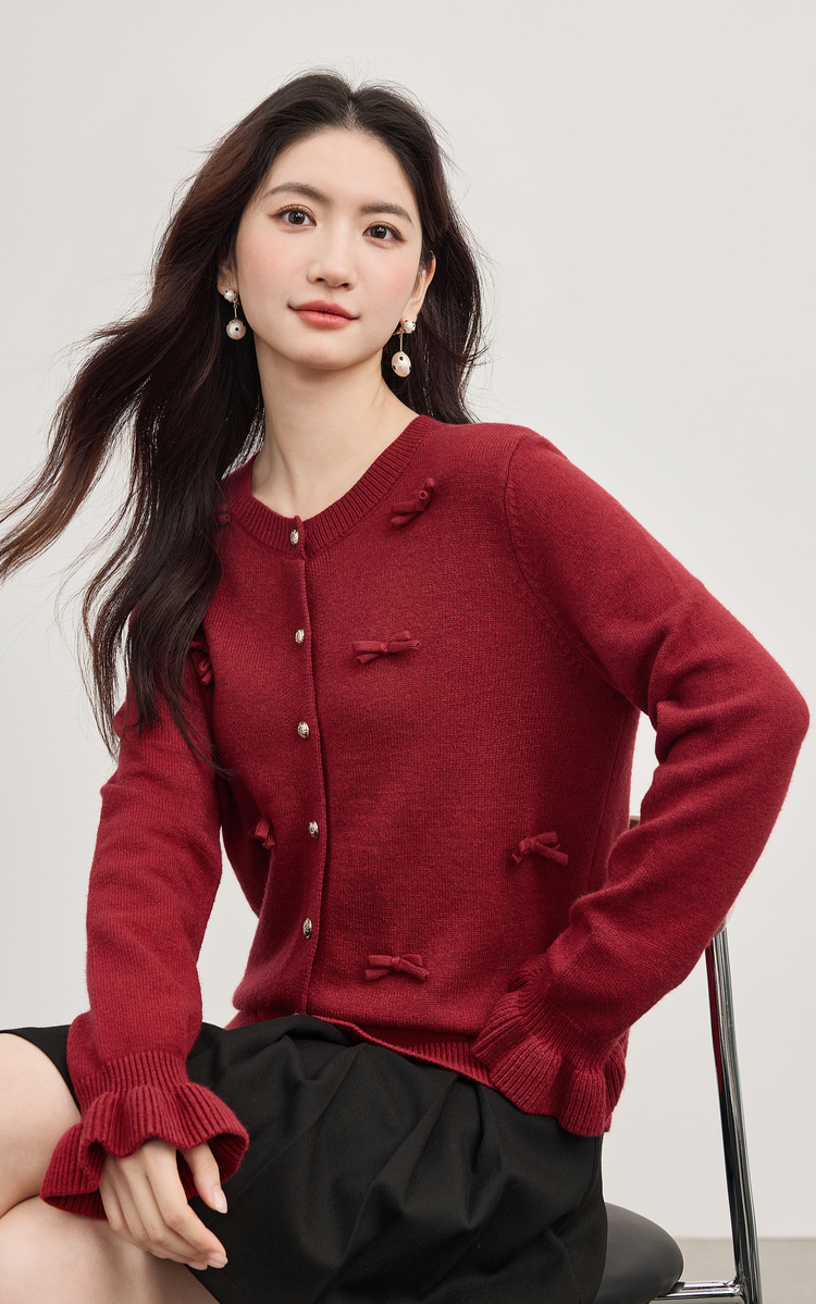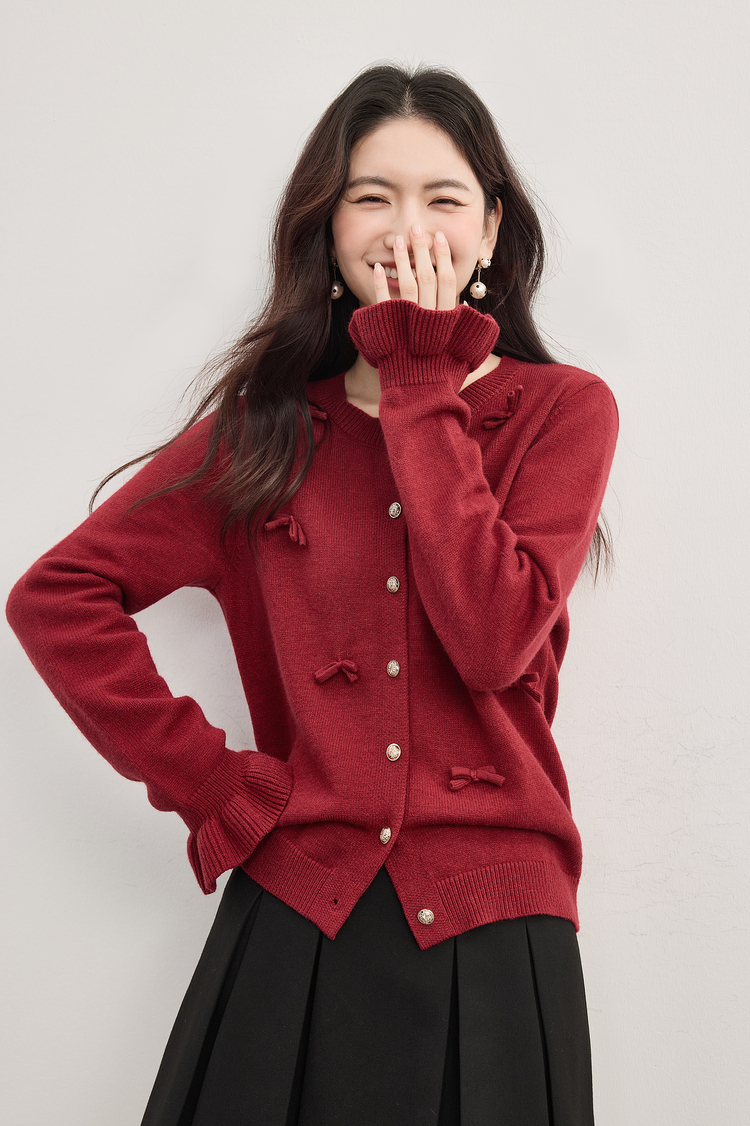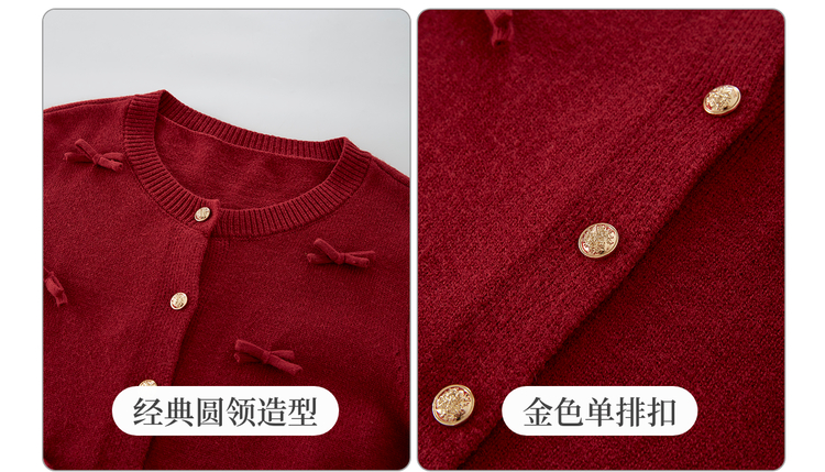 【周末秒杀】熙世界26支安迪绒蝴蝶结长袖圆领红色针织开衫毛衣女2025秋冬新款