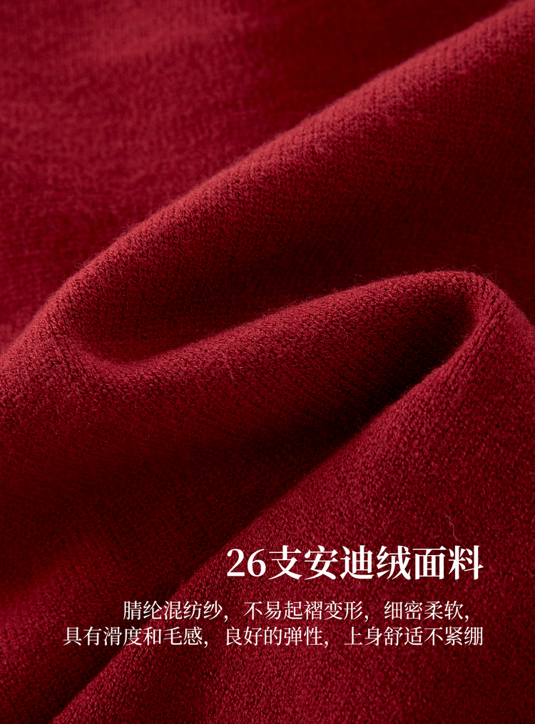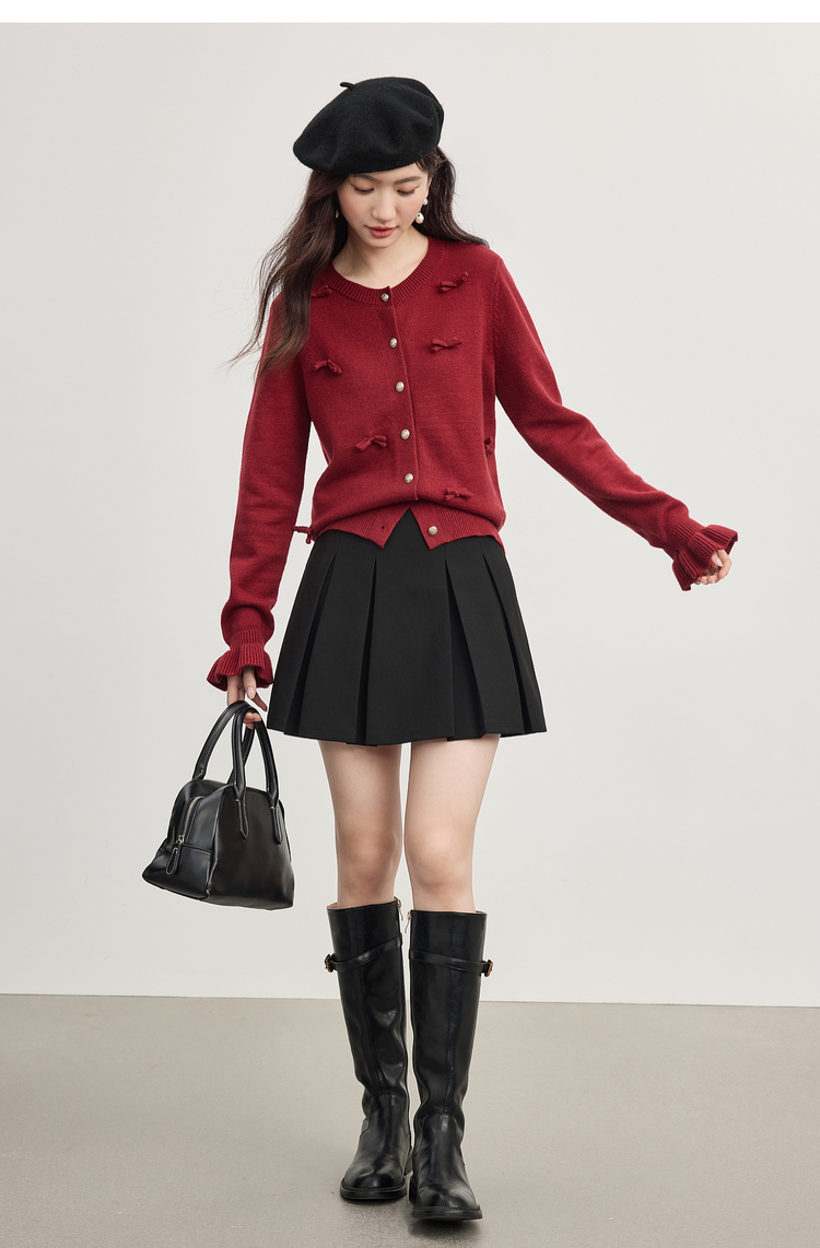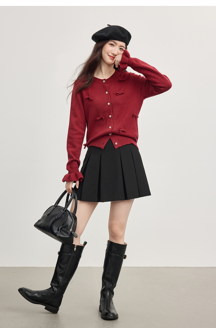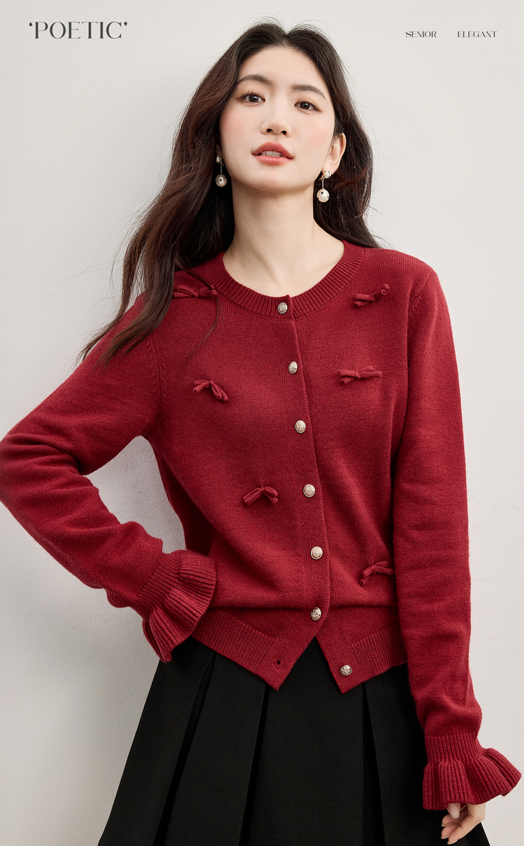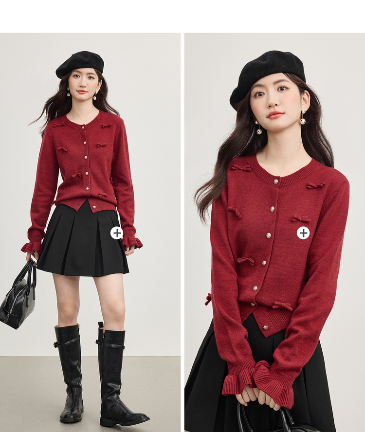 【周末秒杀】熙世界26支安迪绒蝴蝶结长袖圆领红色针织开衫毛衣女2025秋冬新款