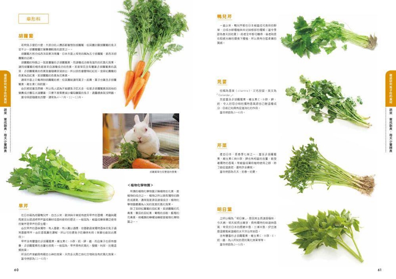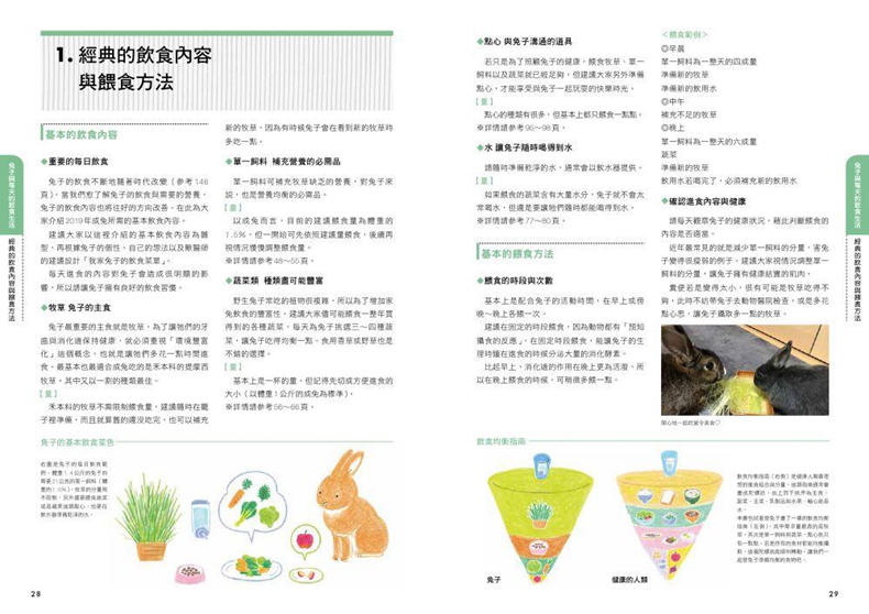 ◎全方位掌握兔子的飲食生活。包括如何規劃兔子的每日飲食、各種食材的特色,以及在不同年齡階段適合的飲食菜單等等。