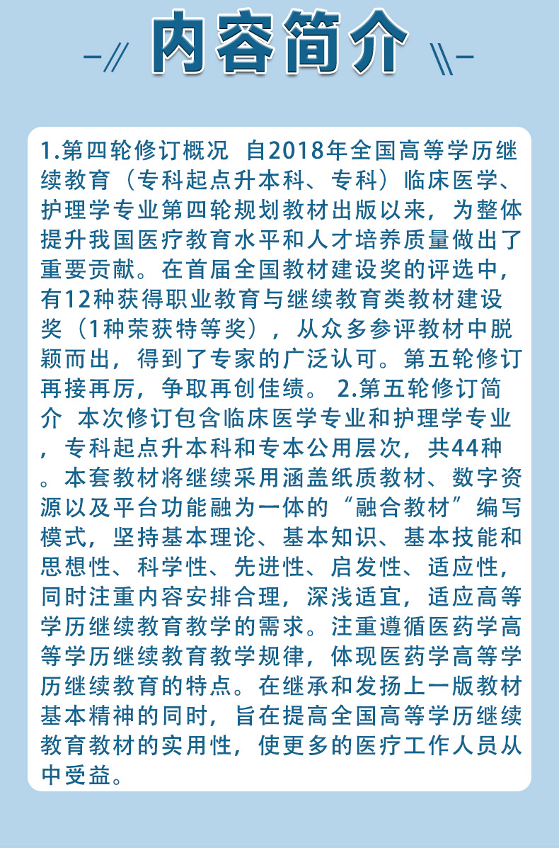 1.第四轮修订概况 自2018年全国高等学历继续教育(专科起点升本科、专科)临床医学、护理学专业第四轮规划教材出版以来,为整体提升我国医疗教育水平和人才培养质量做出了重要贡献。在首届全国教材建设奖的评选中,有12种获得职业教育与继续教育类教材建设奖(1种荣获特等奖),从众多参评教材中脱颖而出,得到了专家的广泛认可。第五轮修订再接再厉,争取再创佳绩。 2.第五轮修订简介 本次修订包含临床医学专业和护理学专业,专科起点升本科和专本公用层次,共44种。本套教材将继续采用涵盖纸质教材、数字资源以及平台功能融为一体的“融合教材”编写模式,坚持基本理论、基本知识、基本技能和思想性、科学性、先进性、启发性、适应性,同时注重内容安排合理,深浅适宜,适应高等学历继续教育教学的需求。注重遵循医药学高等学历继续教育教学规律,体现医药学高等学历继续教育的特点。在继承和发扬上一版教材基本精神的同时,旨在提高全国高等学历继续教育教材的实用性,使更多的医疗工作人员从中受益。